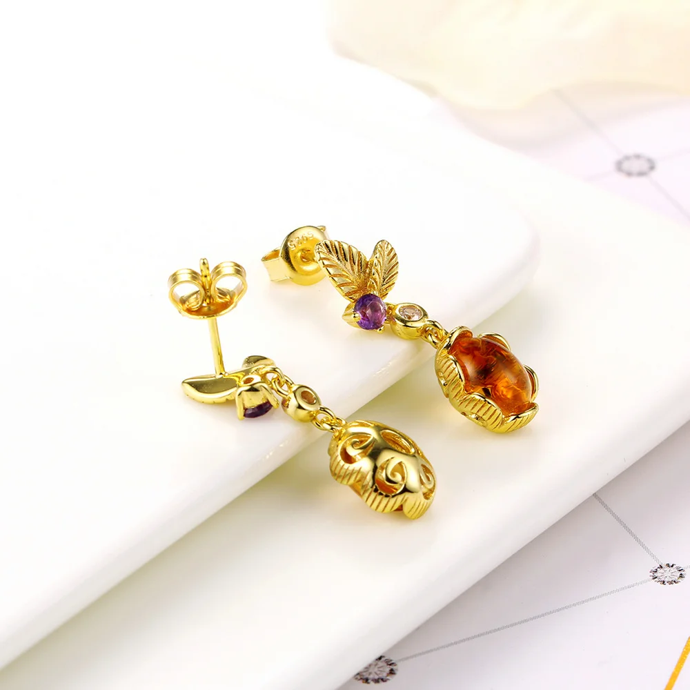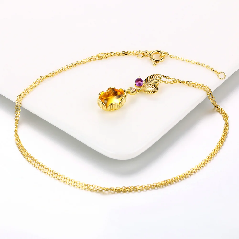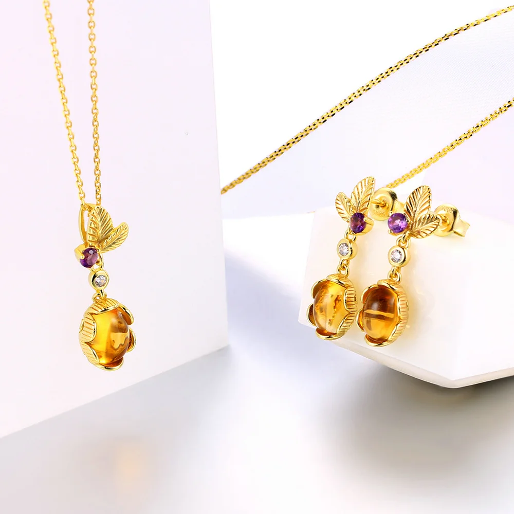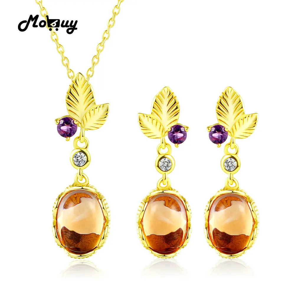 Leaf Flower 925 Sterling Silver Jewelry Set For Women Natural Gemstone Oval Citrine Fine Jewelry Yellow Gold Plated V022EN