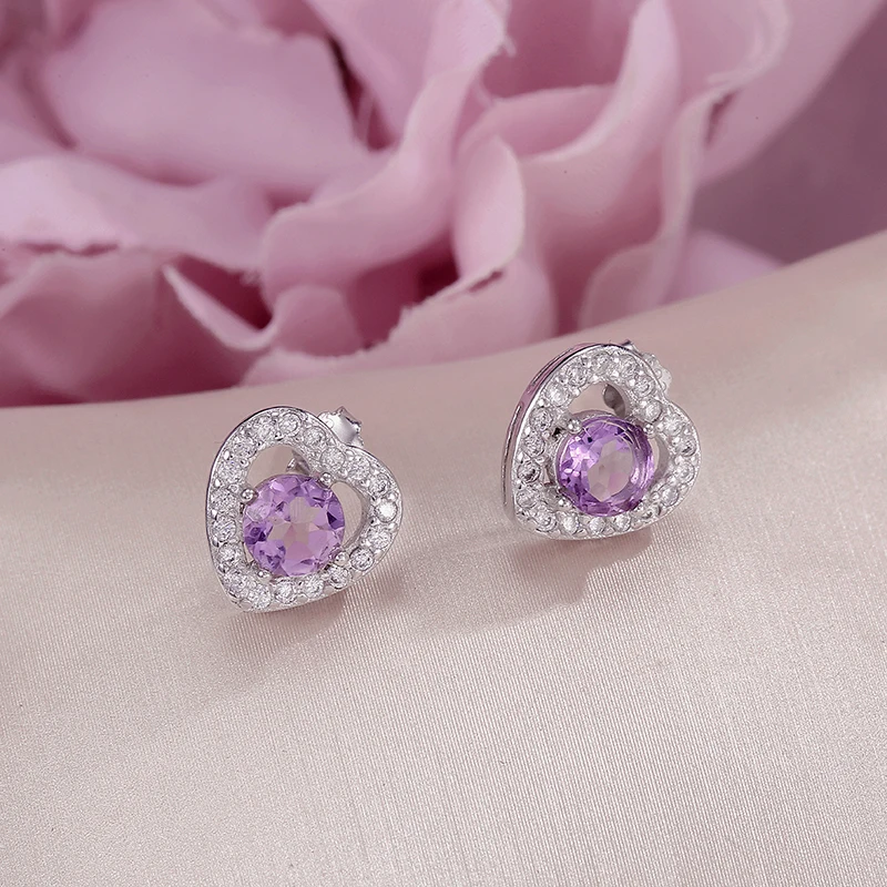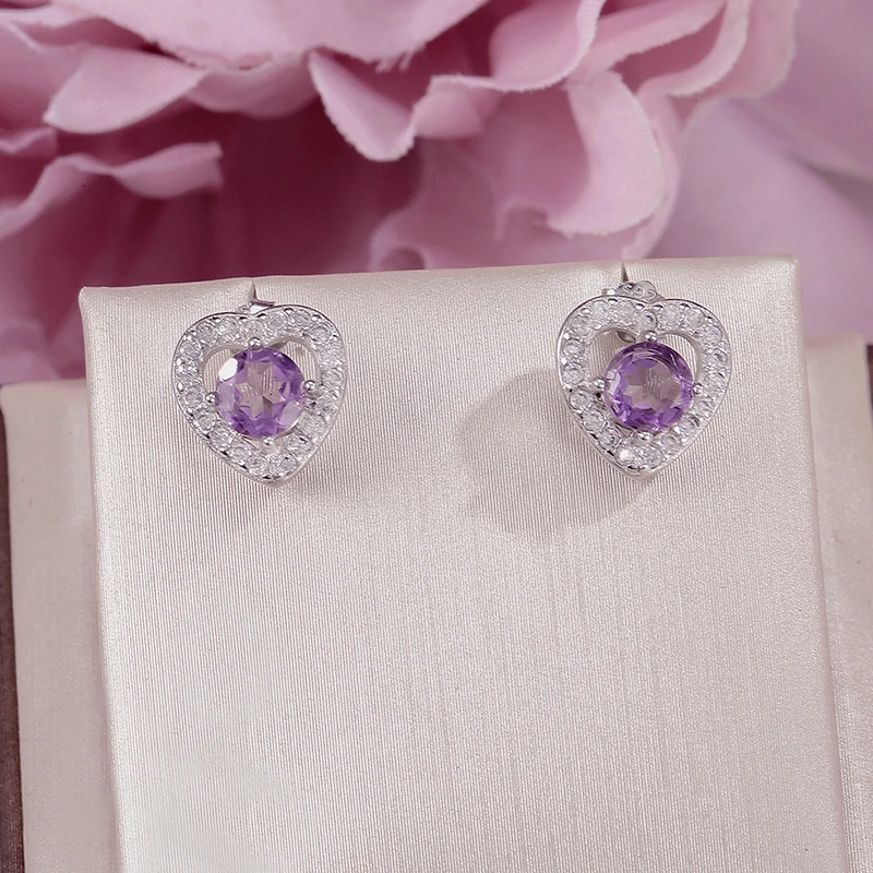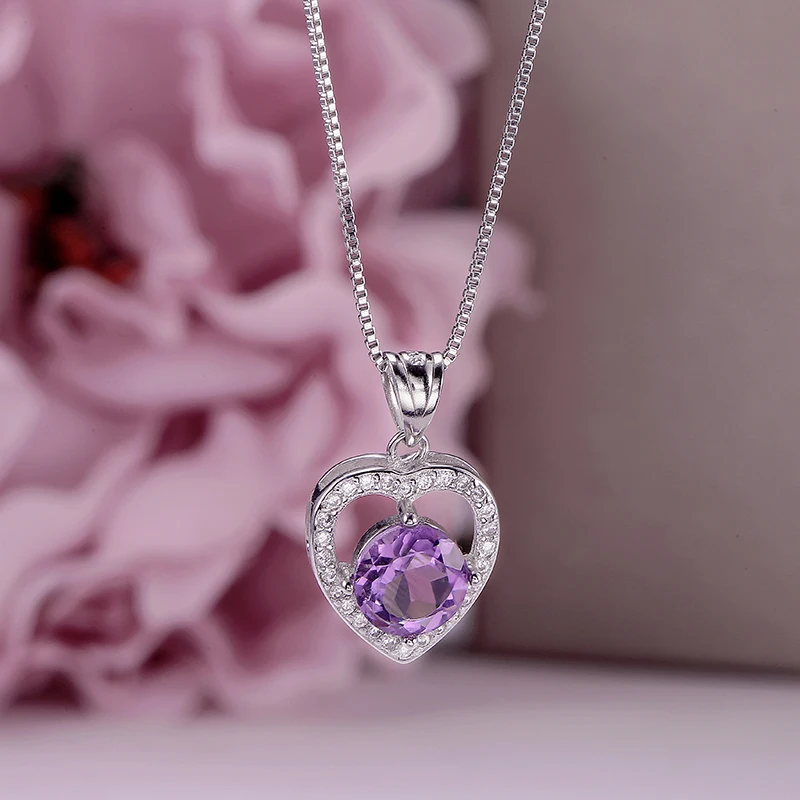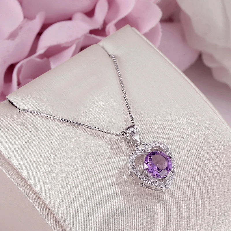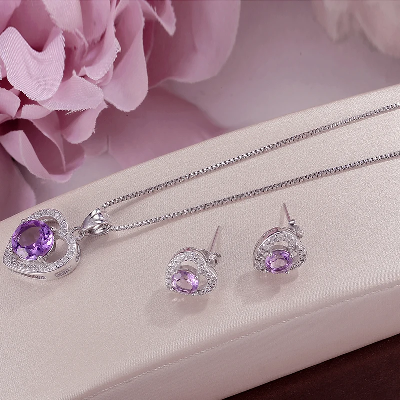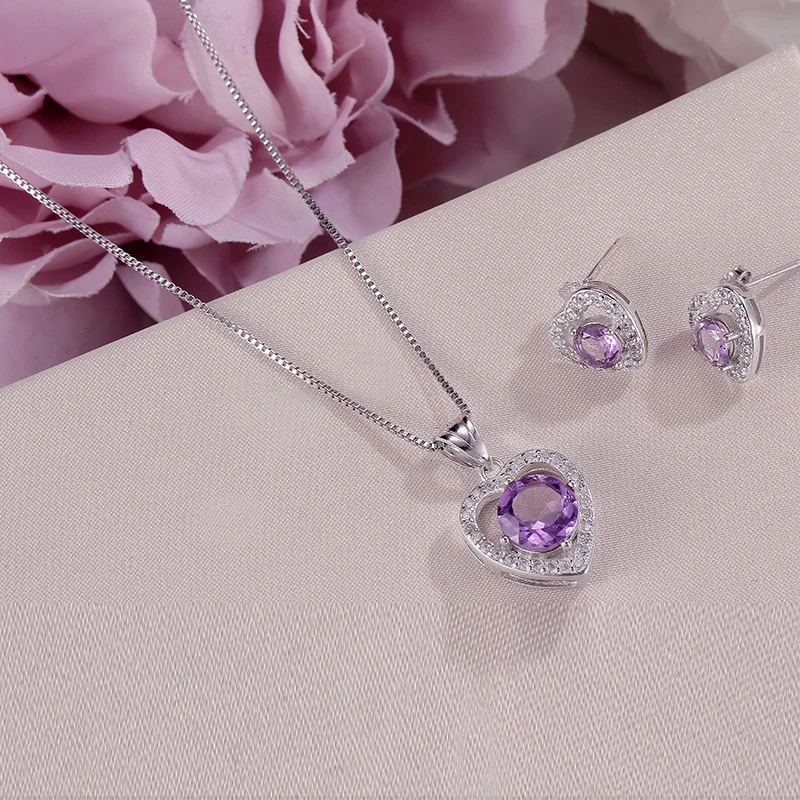 100% Natural Gemstone Fine Jewelry Sets For Women 925 Silver Amethyst Heart Purple Stud Earrings Necklaces Pendants Set CCS006