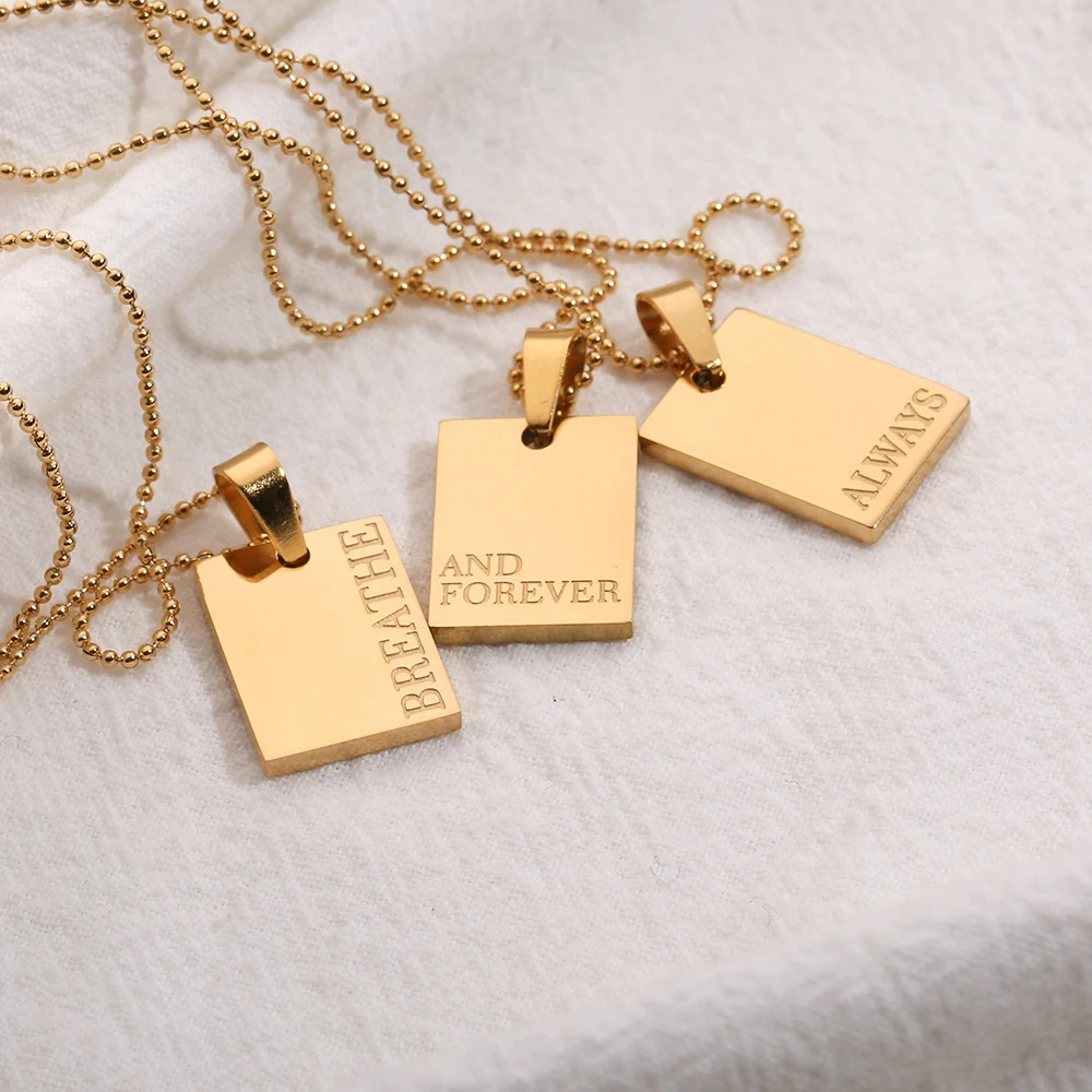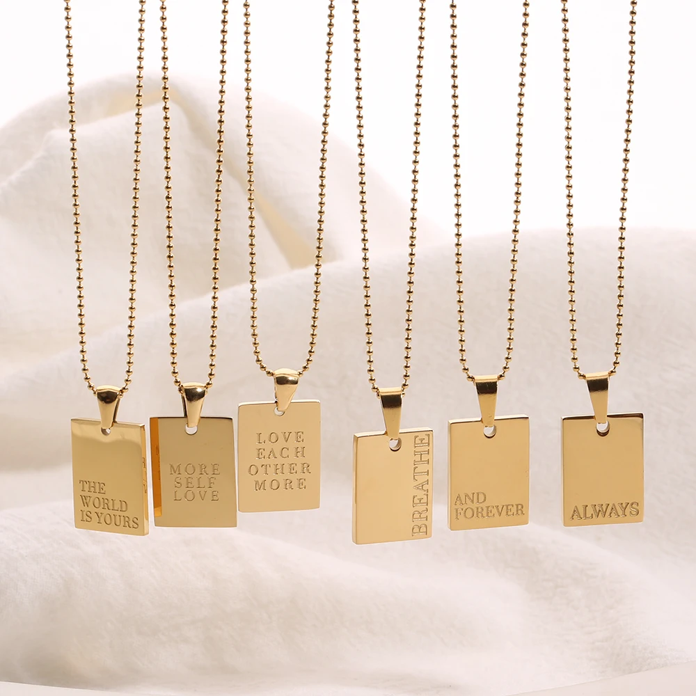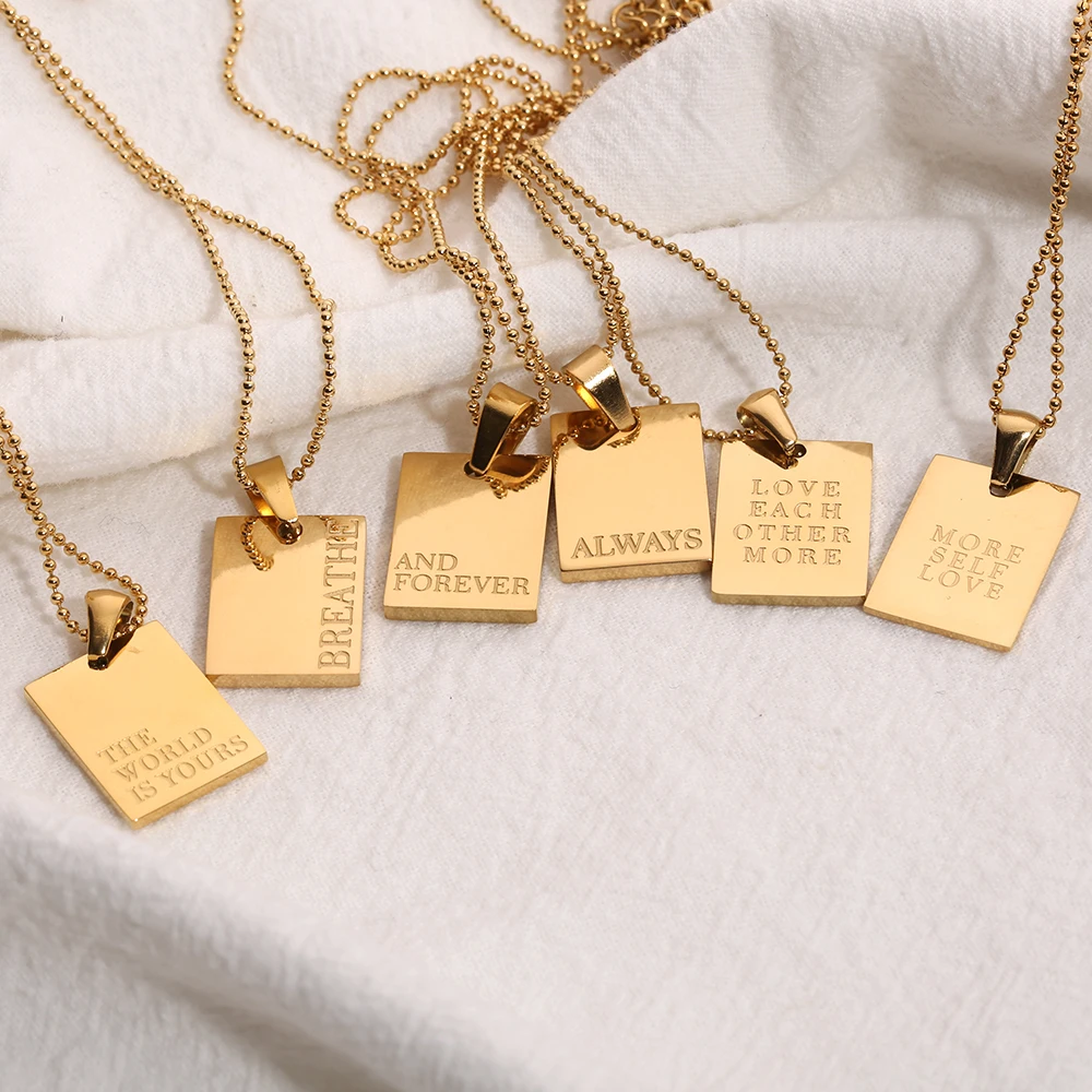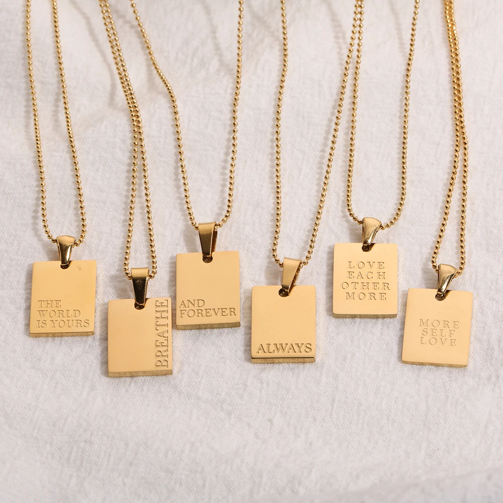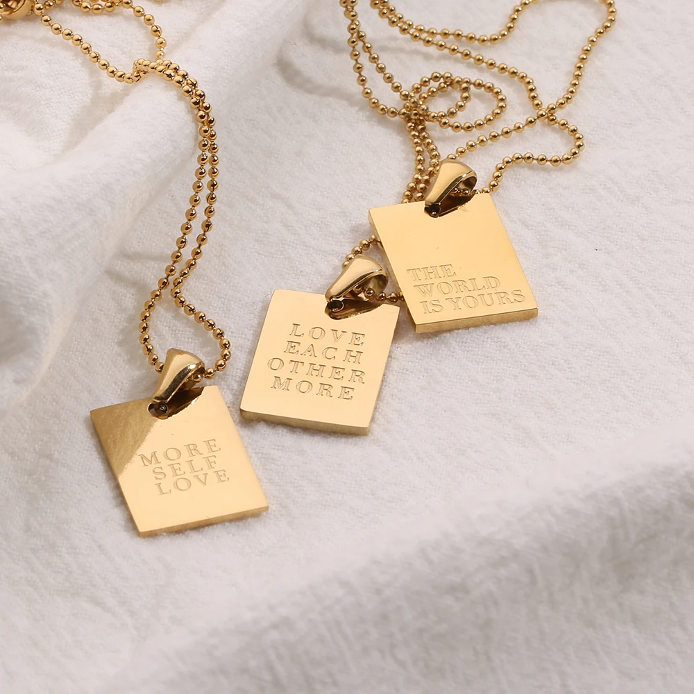 2021 Stainless Steel Inspirational Necklace Gold Plated Engraved Letters Square Pendant Beads Chain Necklace For Women Girls