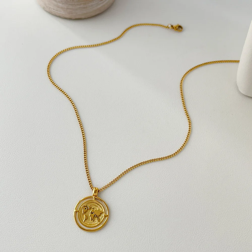 ALLNEWME Unique Design World Map Pendant Necklace Exquisite Golden Irregular Coin Necklaces for Women Stainless Steel Jewelry