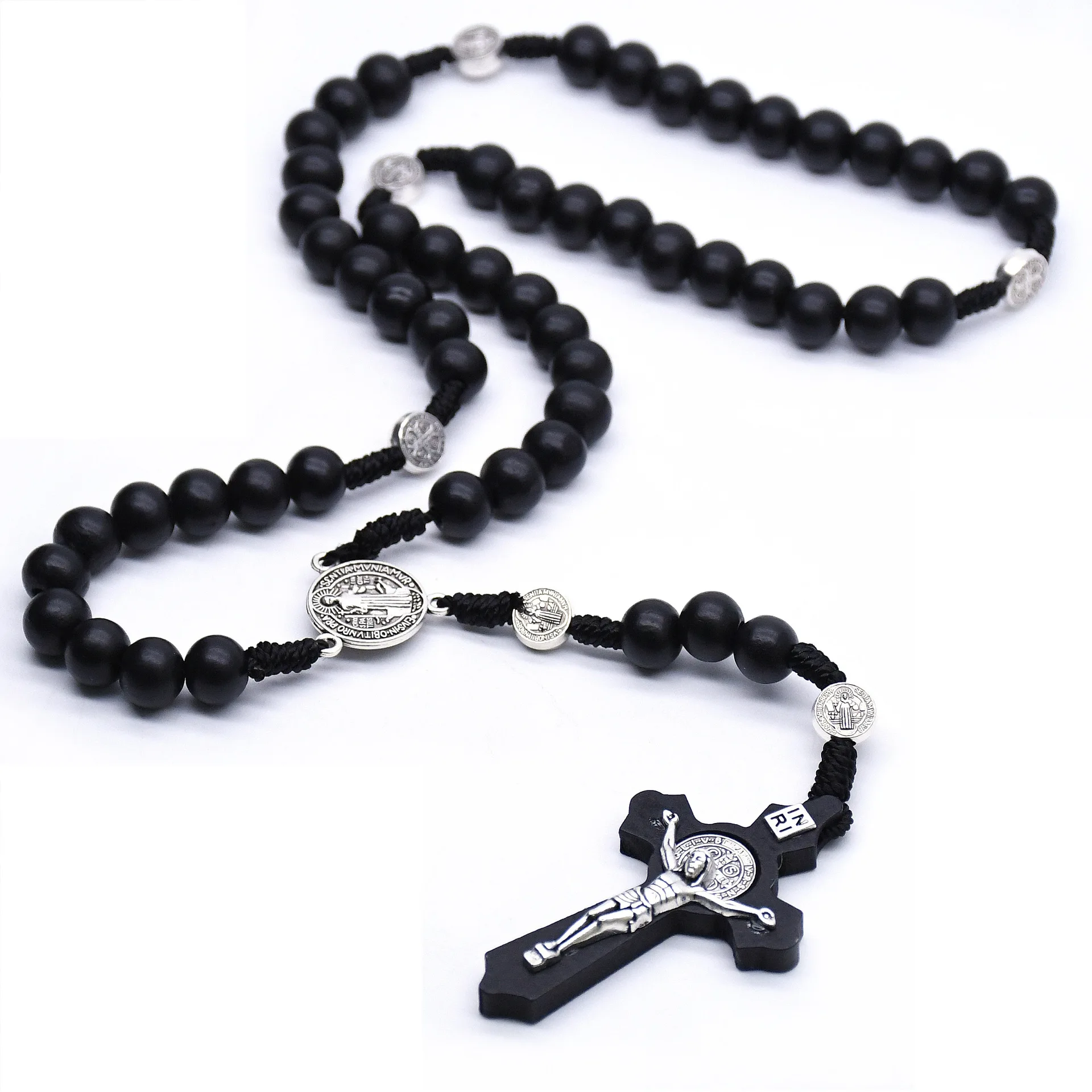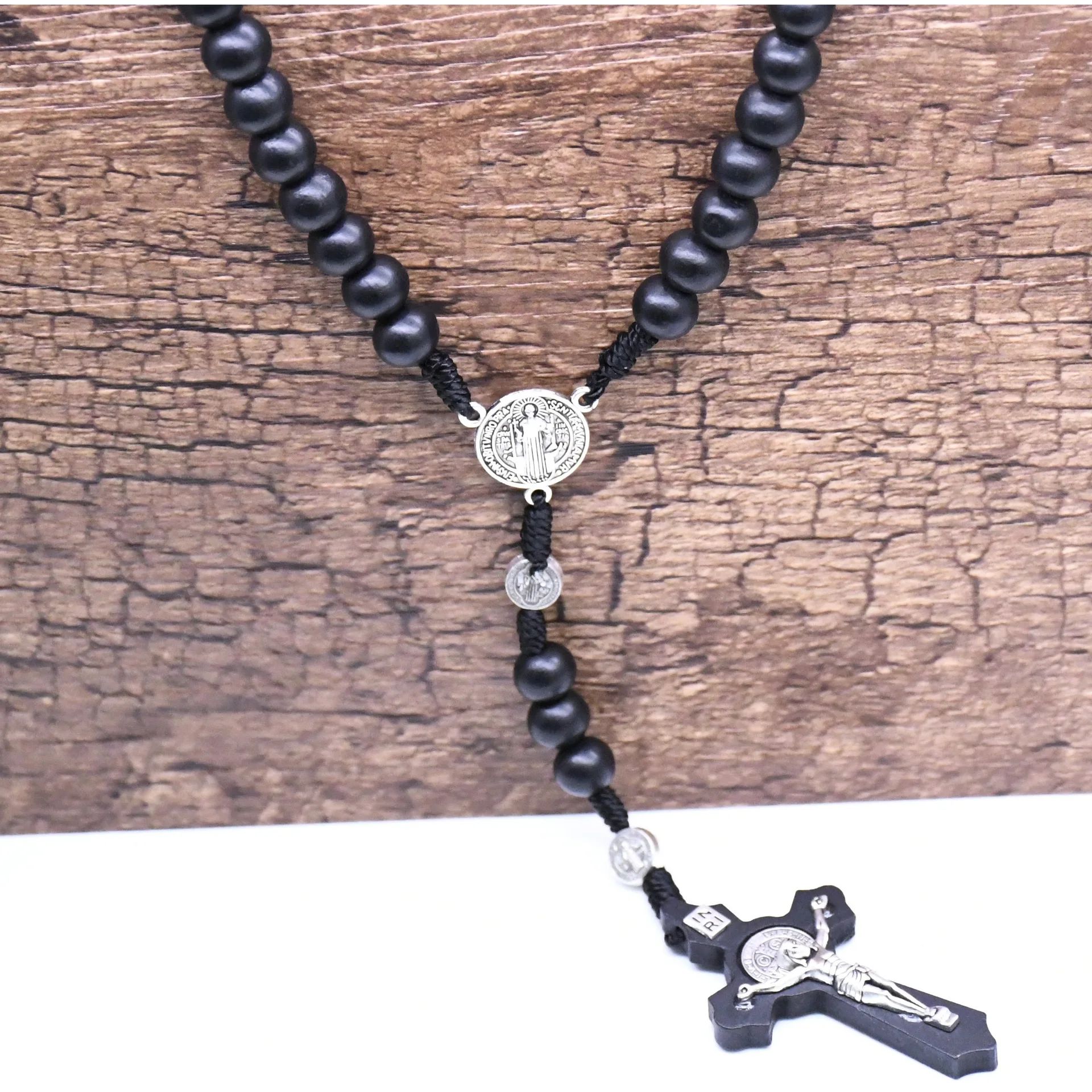 Black Brown Cross Necklace Handmade Wooden Beads Catholic Rosary Neck for Men Woman Christ Prayer Religious Jewelry