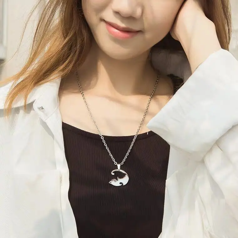 Black White Cute Cat Couple Necklaces Stainless Steel Cat Bring Good Luck Heart Pendant Necklace for Friends Gift Jewelry
