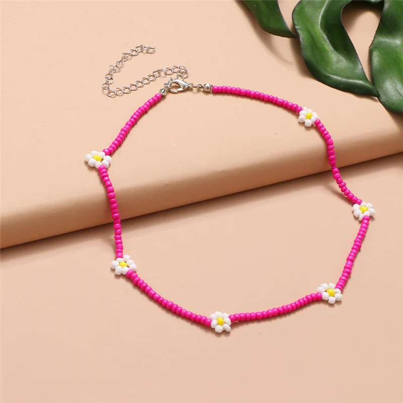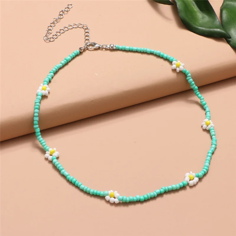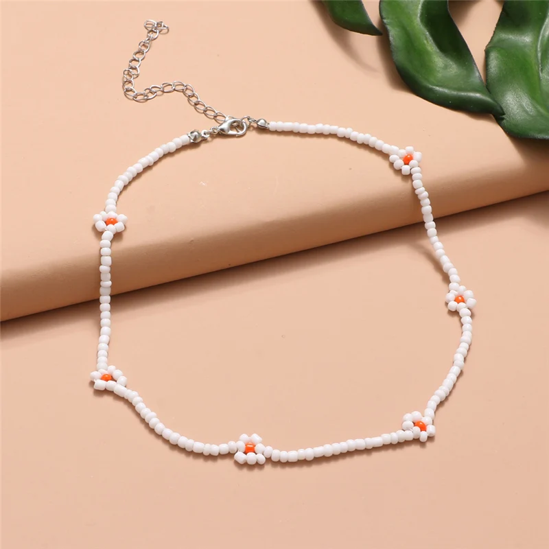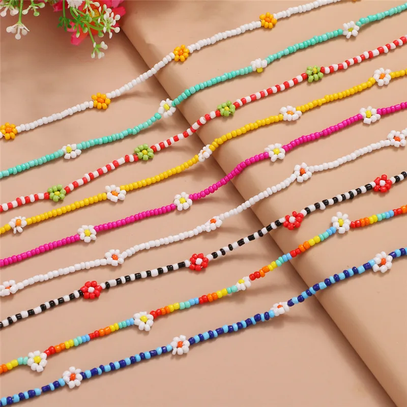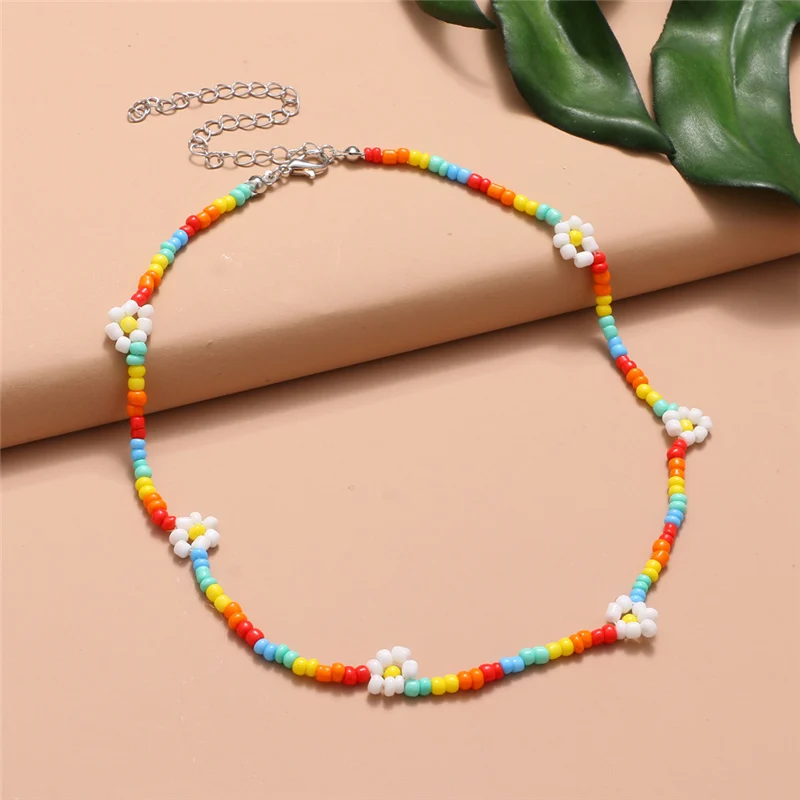 Bohemian Handmade Rainbow Seed Beads Necklace Women Sweet Daisy Acrylic Flowers Beaded Choker Necklace Jewelry Short Necklace
