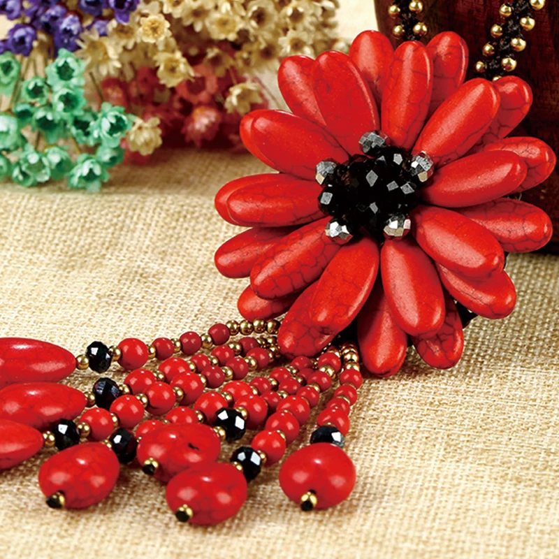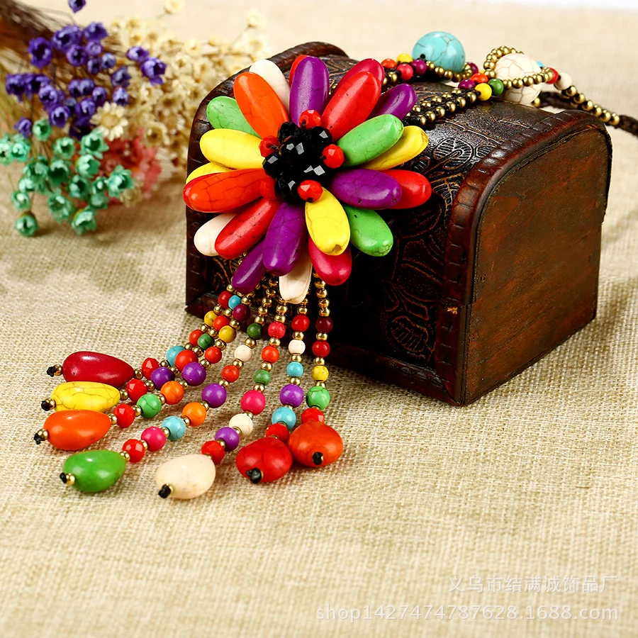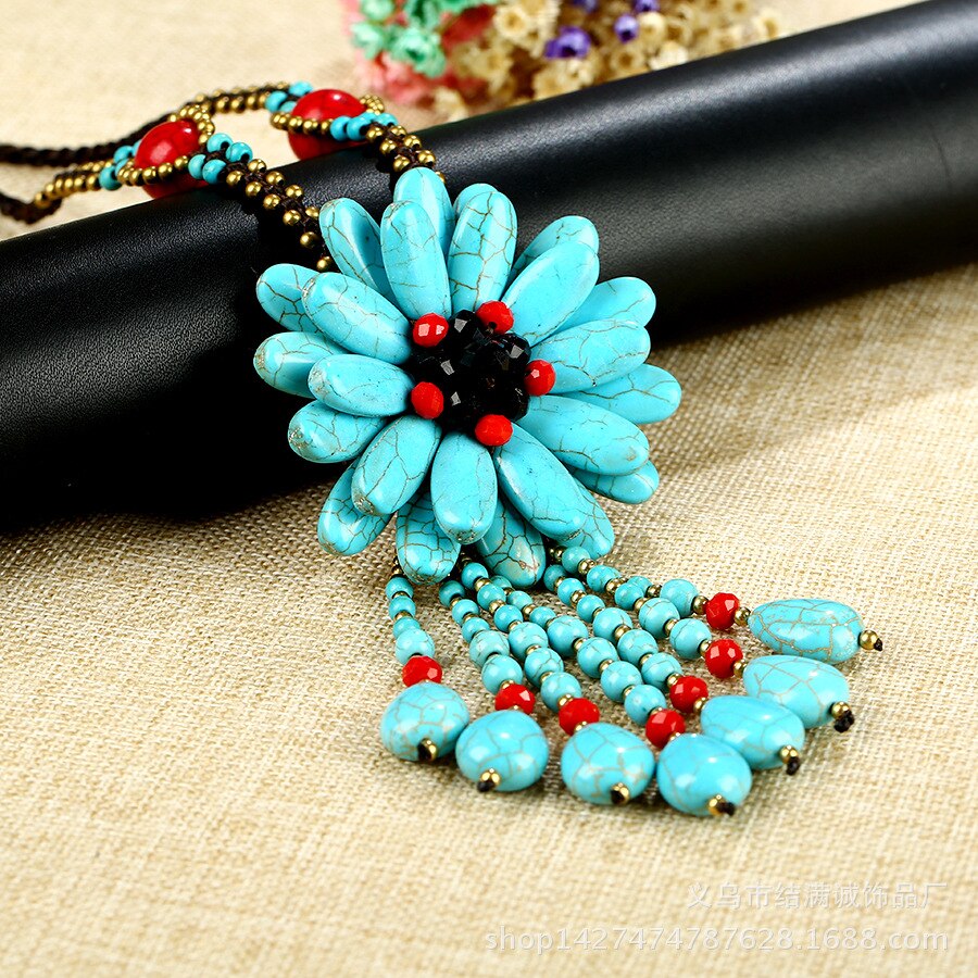 Bohemian Style Beads Necklace Women Turquoise Stone Necklace Jewelry Thai Turquoise Flower Woven Long Necklace XL005-23