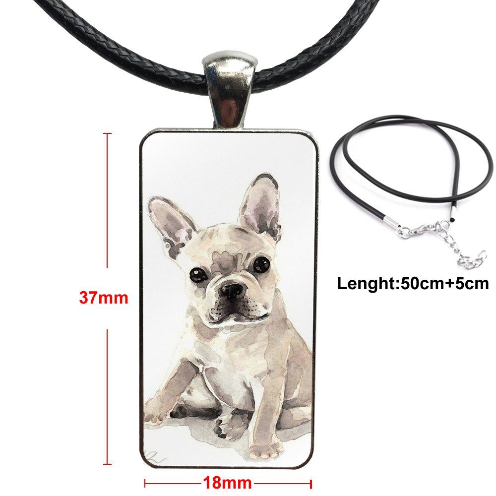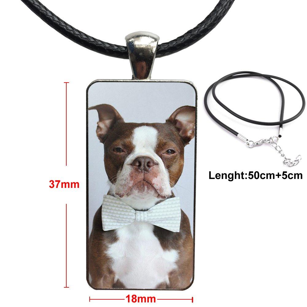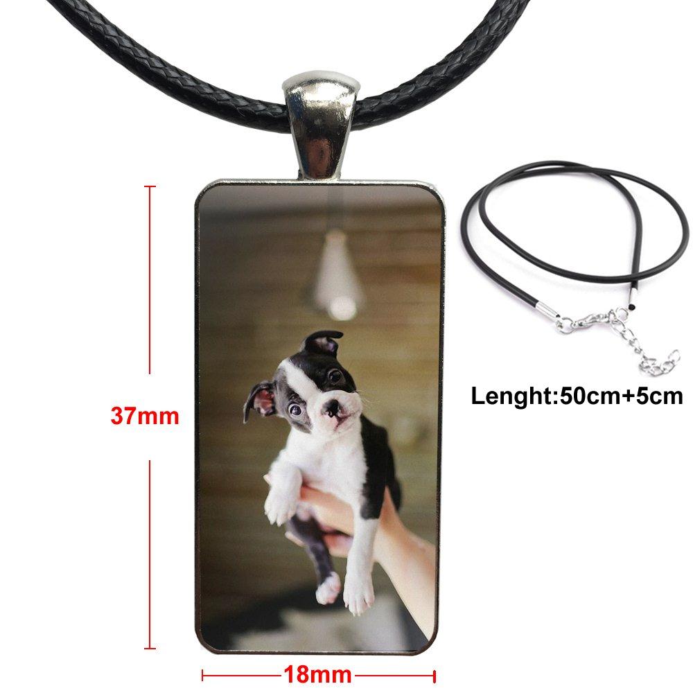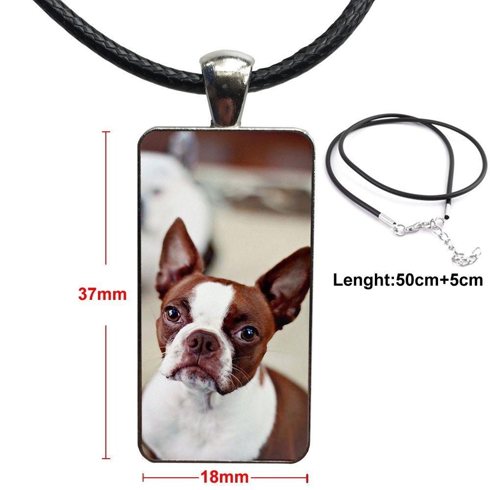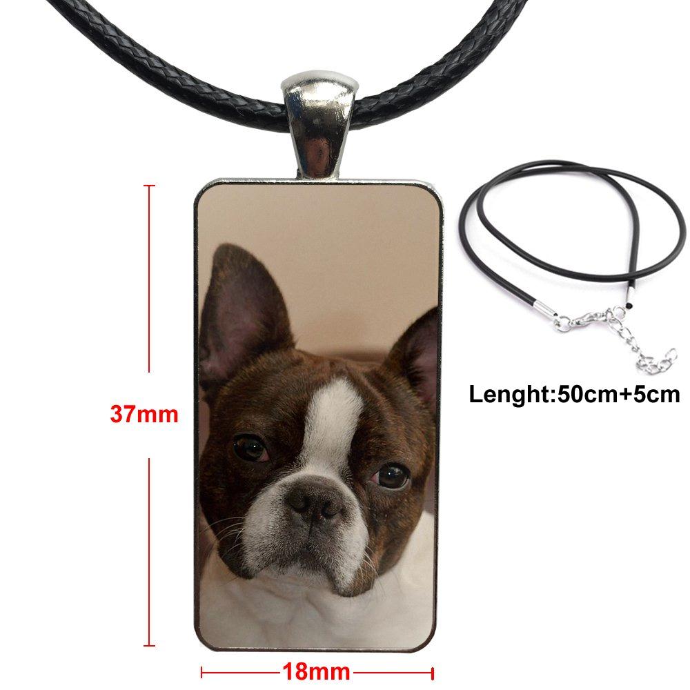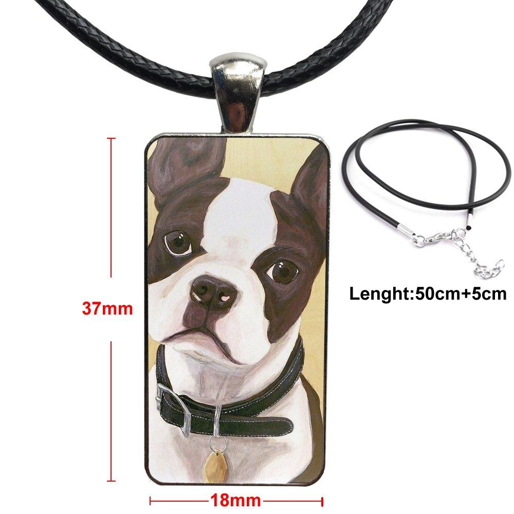 Boston Terrier Dog In Green For Girls Gift Glass Cabochon Choker Pendant Rectangle Necklace Steel Color Jewelry
