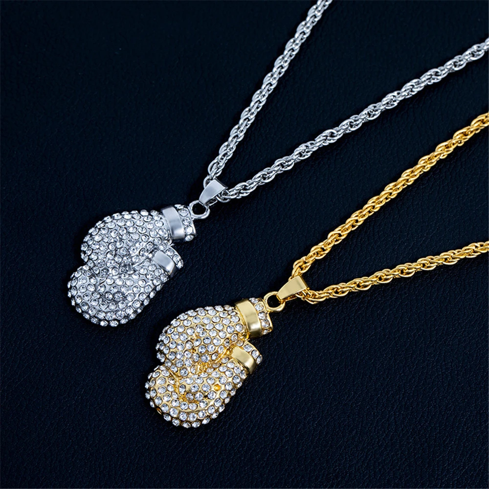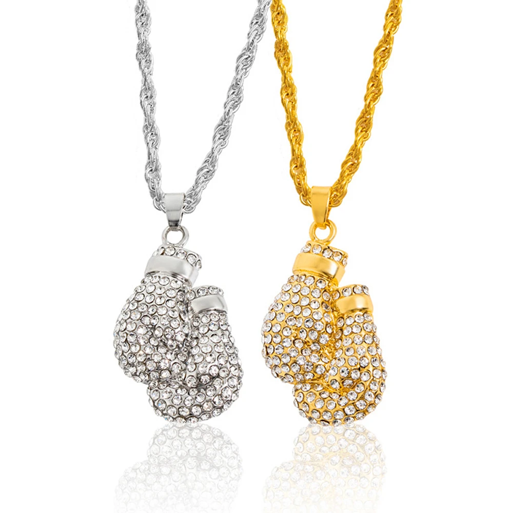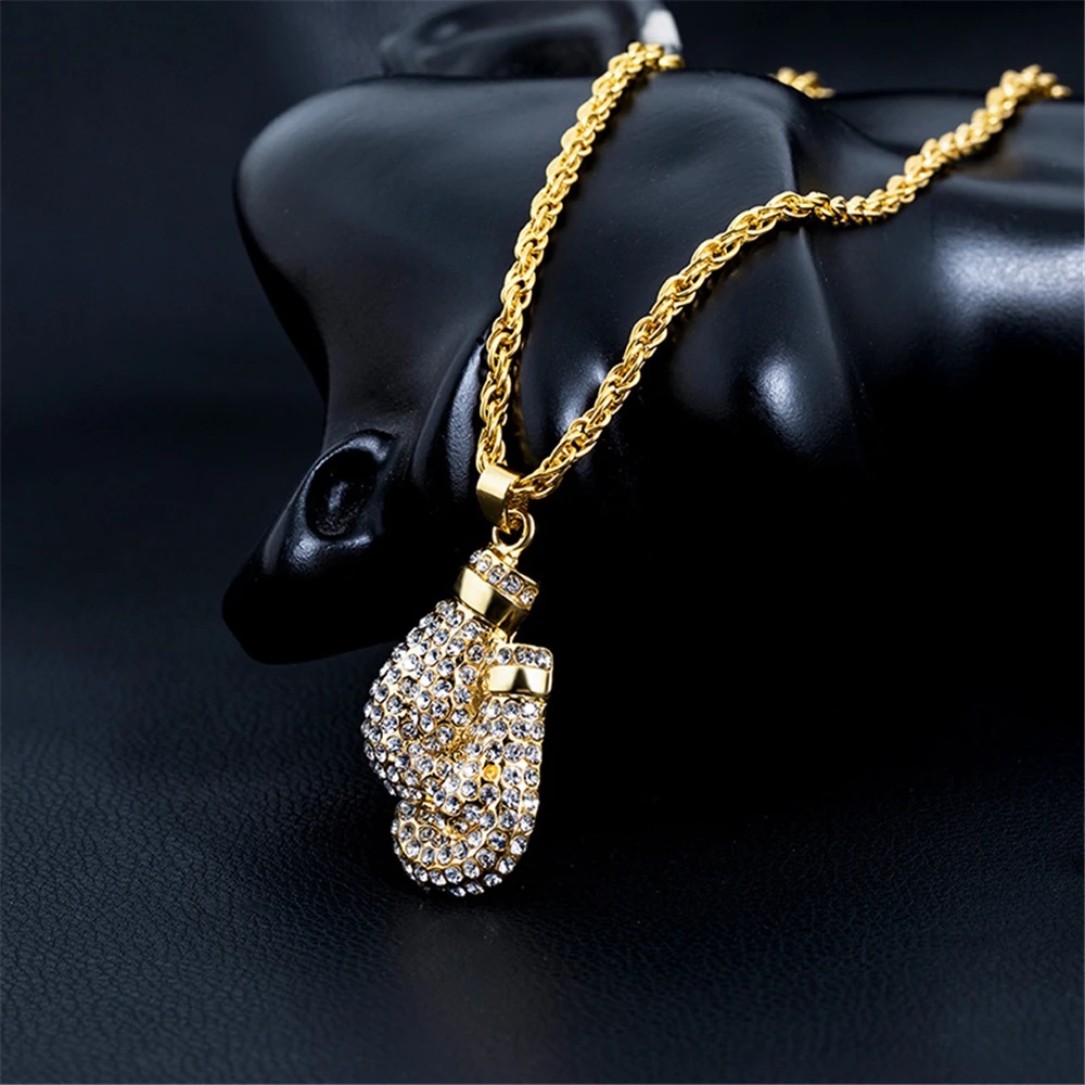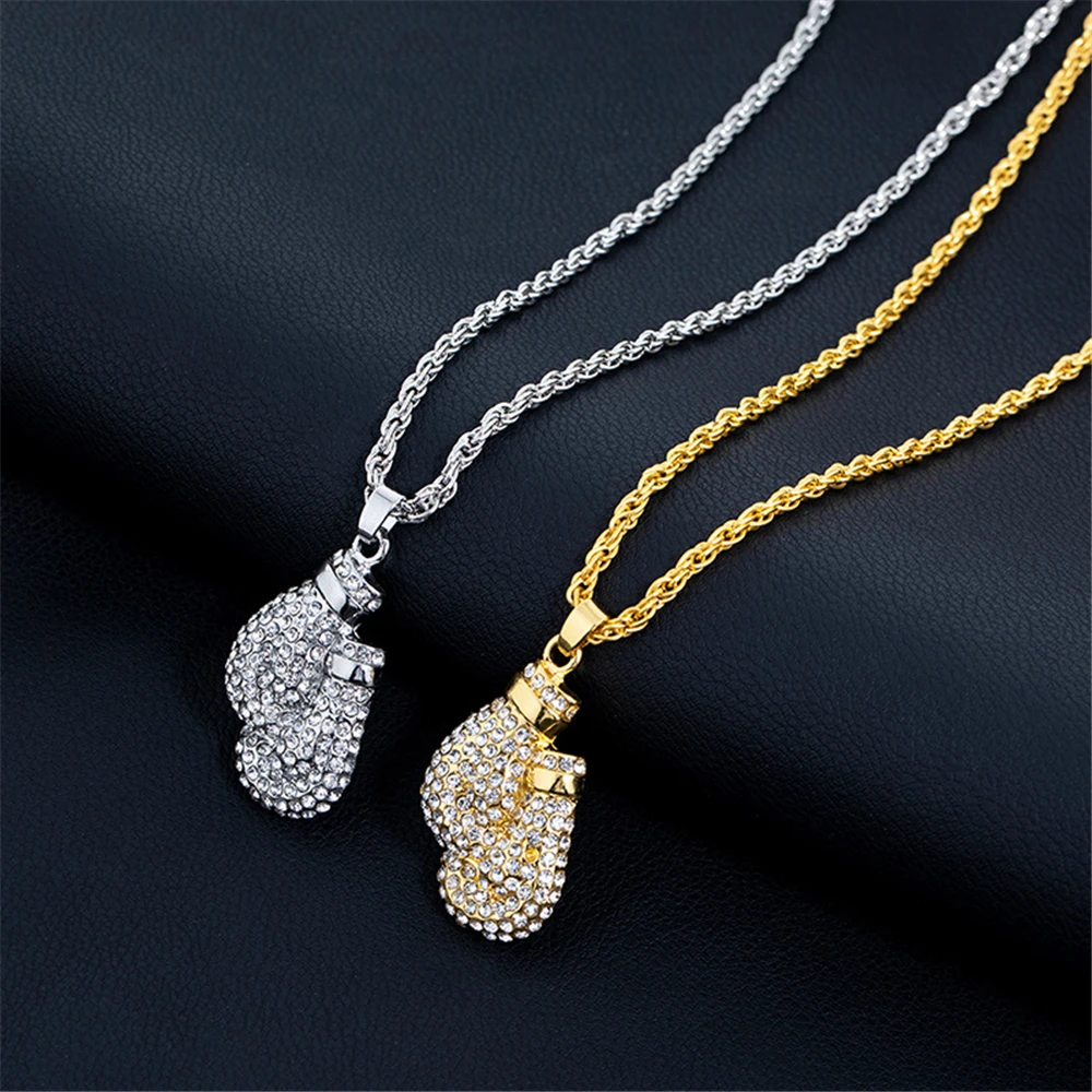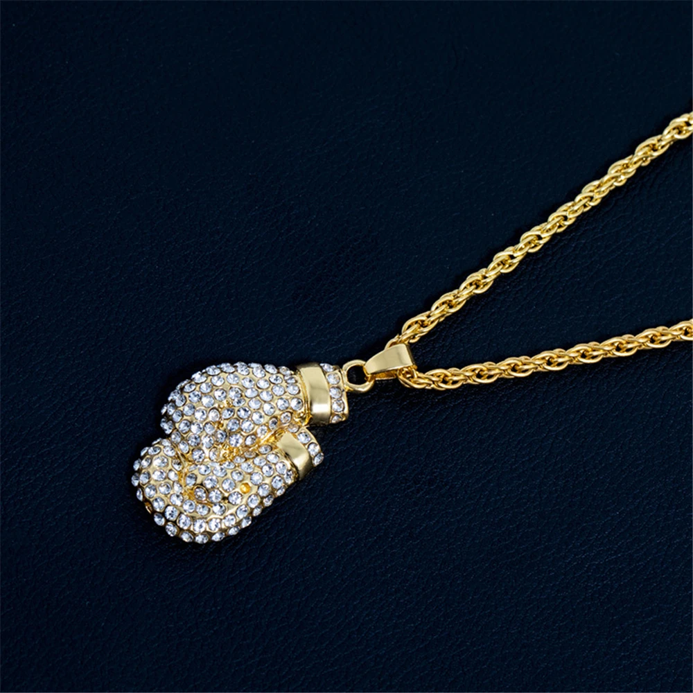 Boxing Gloves Pendant Necklace 24"Long Chain Gold Color Iced Cubic Zircon Alloy Necklace Pendant For Unisex Hip Hop Gift