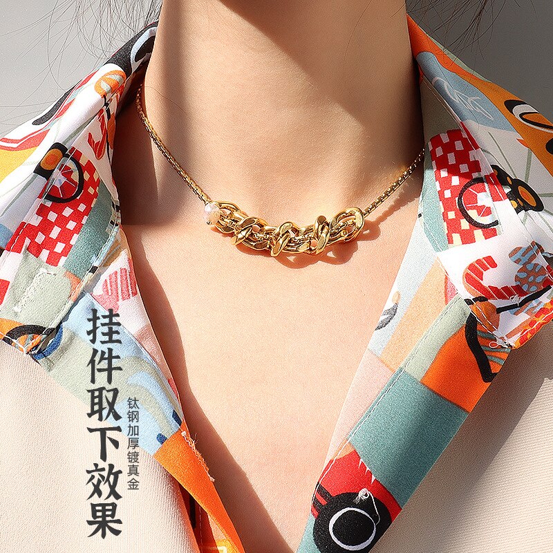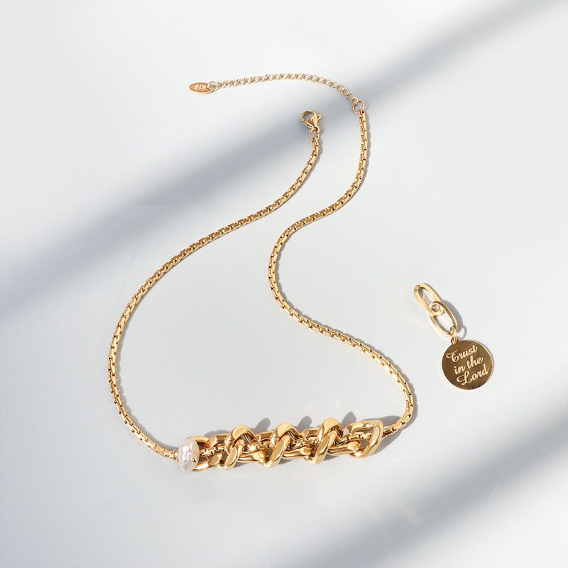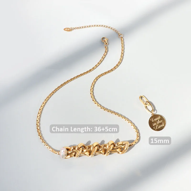 Chunky Women Choker Necklace Stainless Steel Hug Chain Baroque Pearl ID Engraved Coin Charm Pendant for Girls Gold Color Jewelry