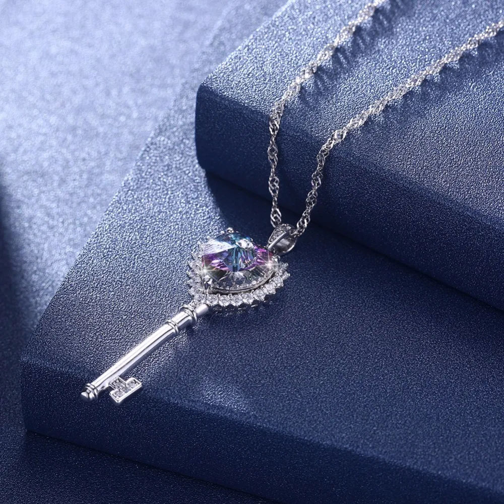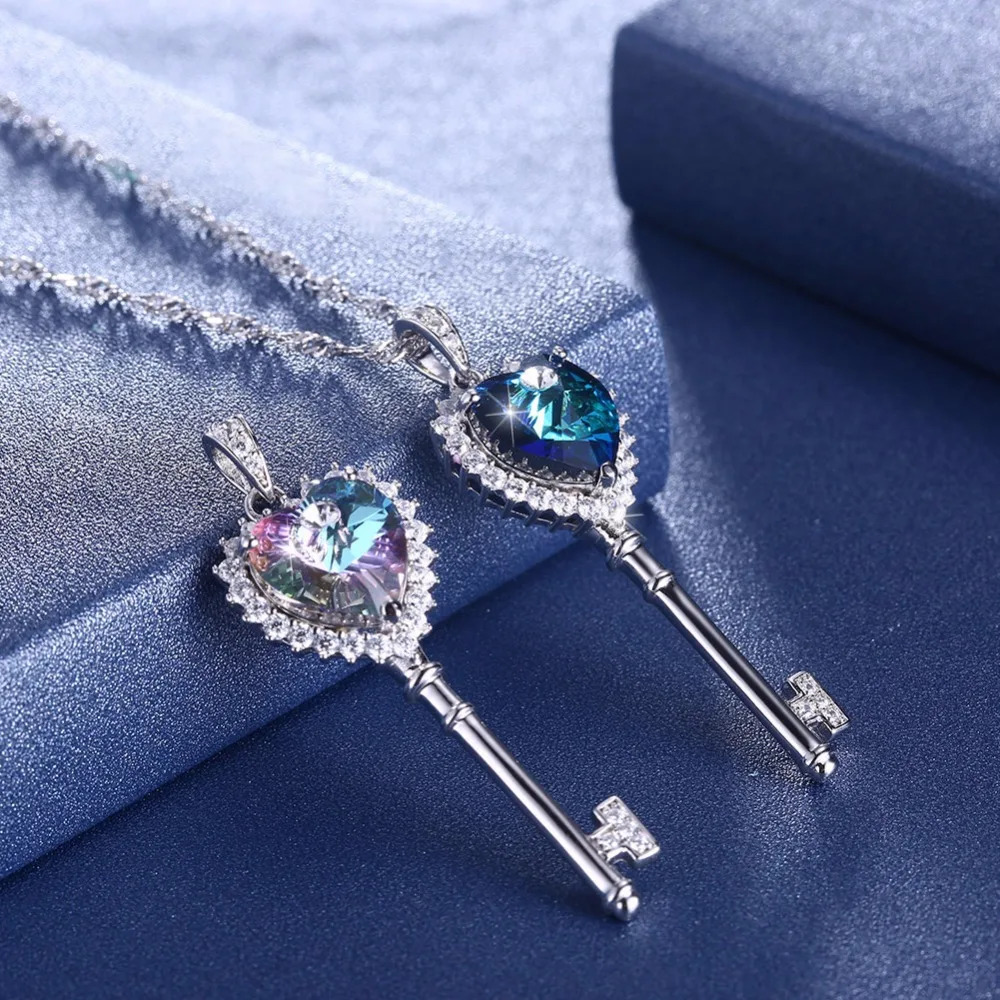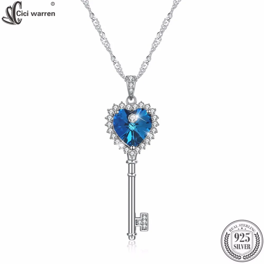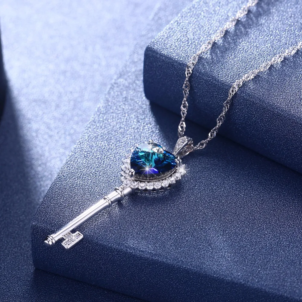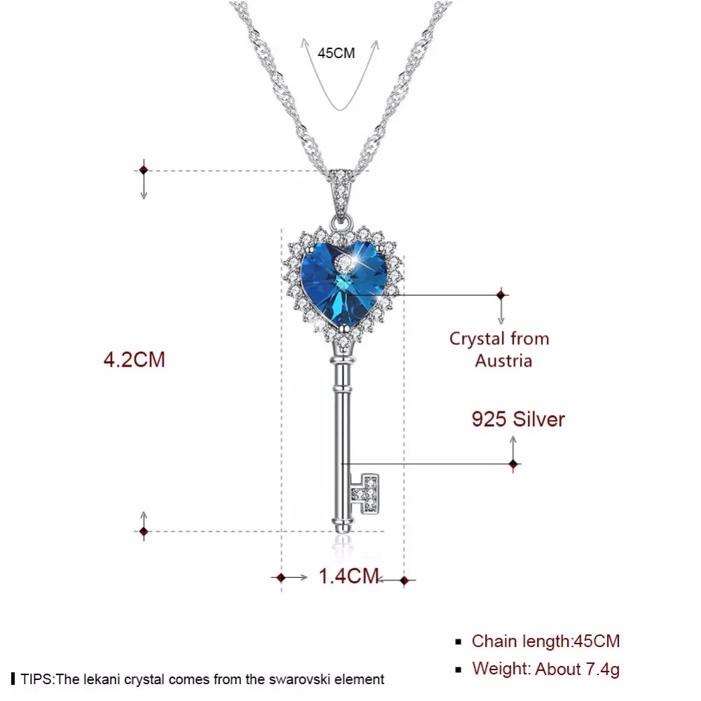 Crystals From Austria Blue Purple Heart Key Pendant Necklaces Real 925 Silver Fine Jewelry For Women CWN057