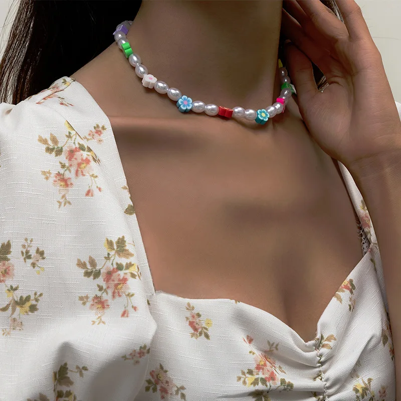 Colorful Soft Clay Flower Pearl Beaded Necklace Ethnic Star Unusual Necklaces 2021 Trend Punk Clothing Choker On The Neck