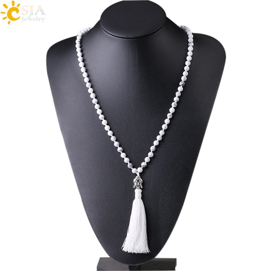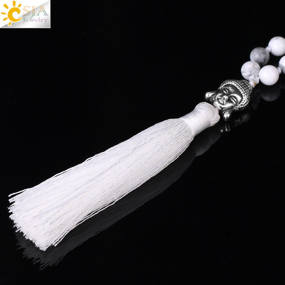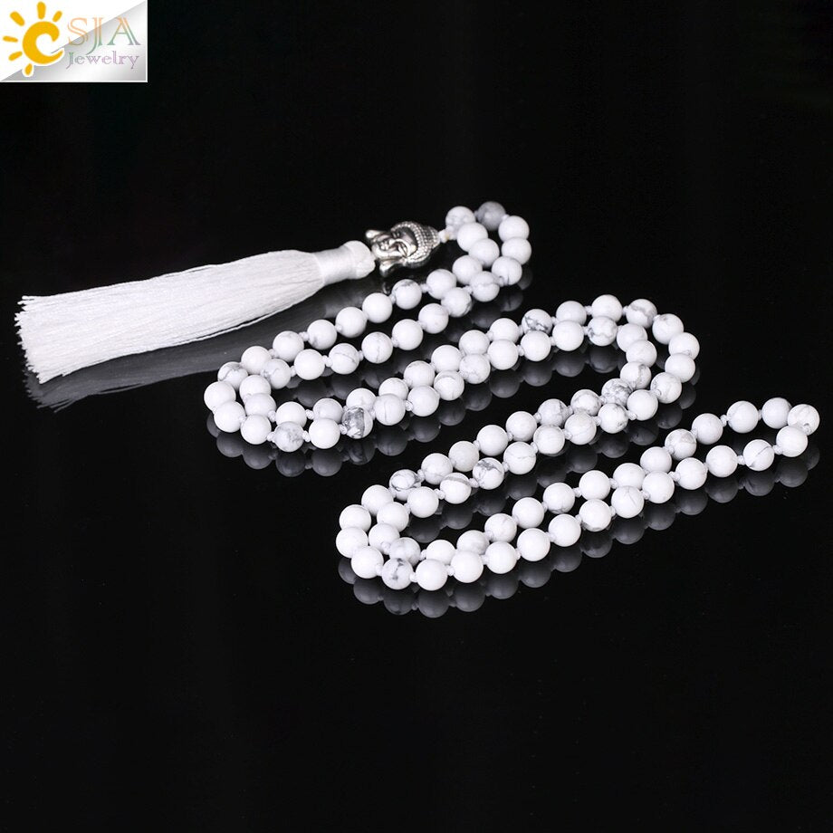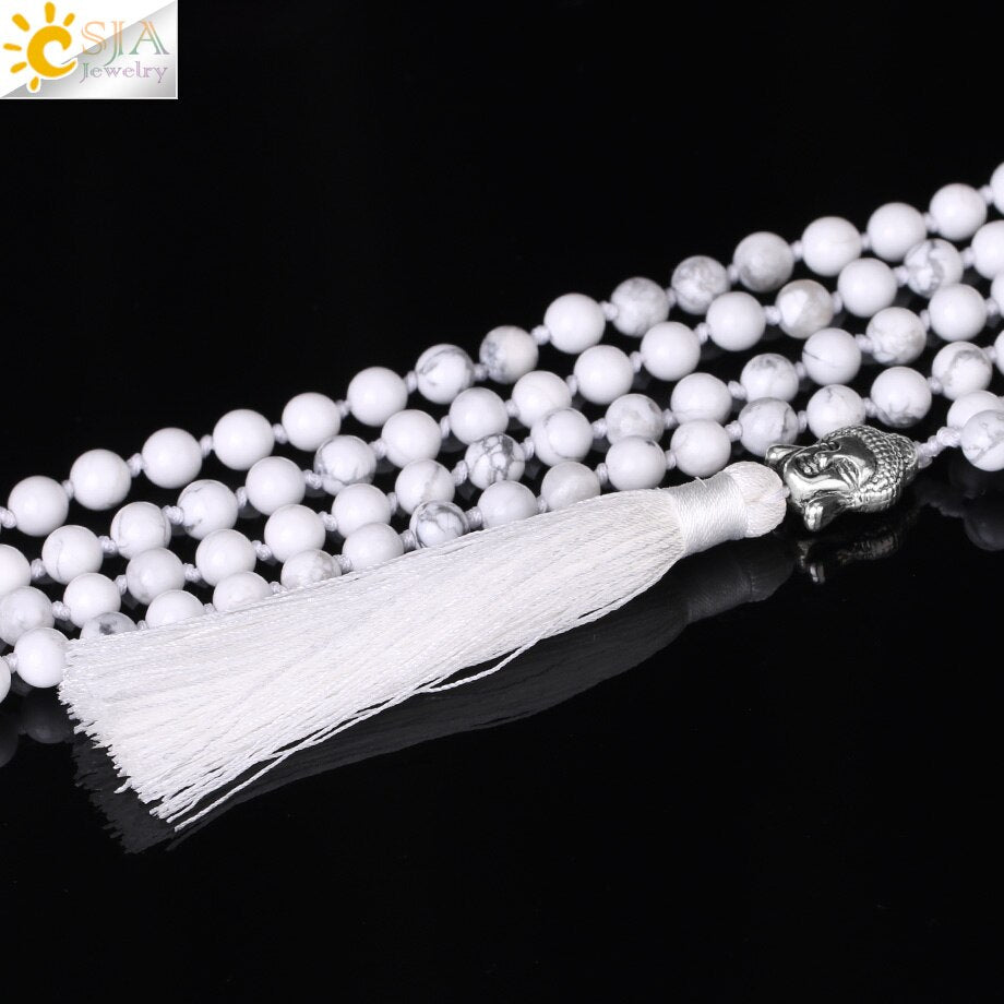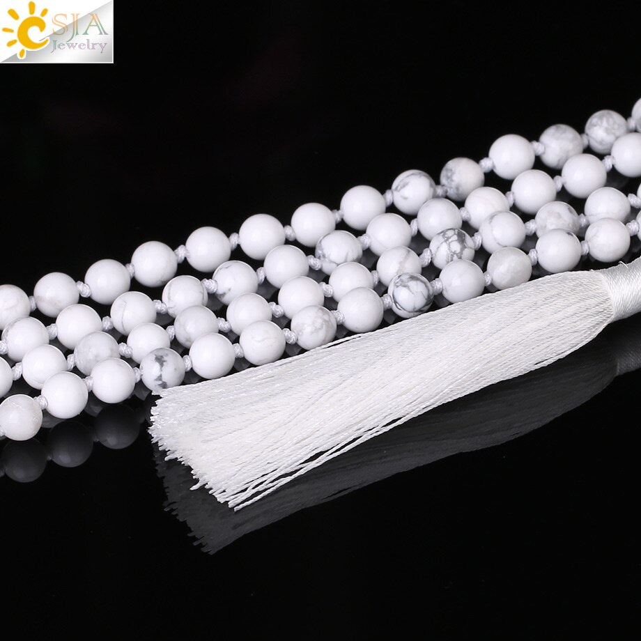 CSJA Tassel Necklace White Howlite Long Knotted Tribal Handmade Necklaces for Women Buddha Prayer 6mm Mala 108 Bead Jewelry F307