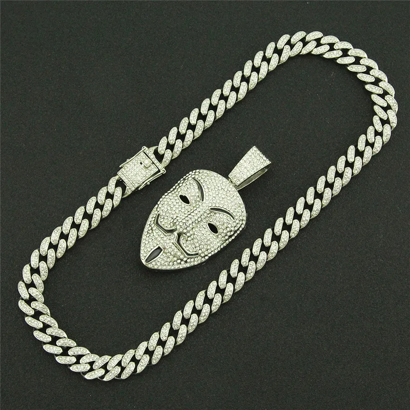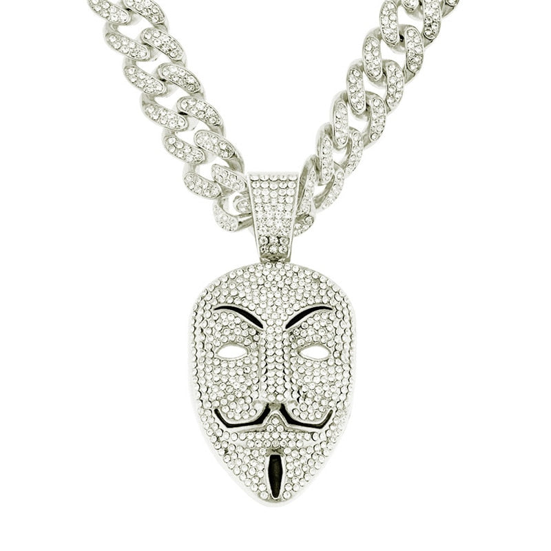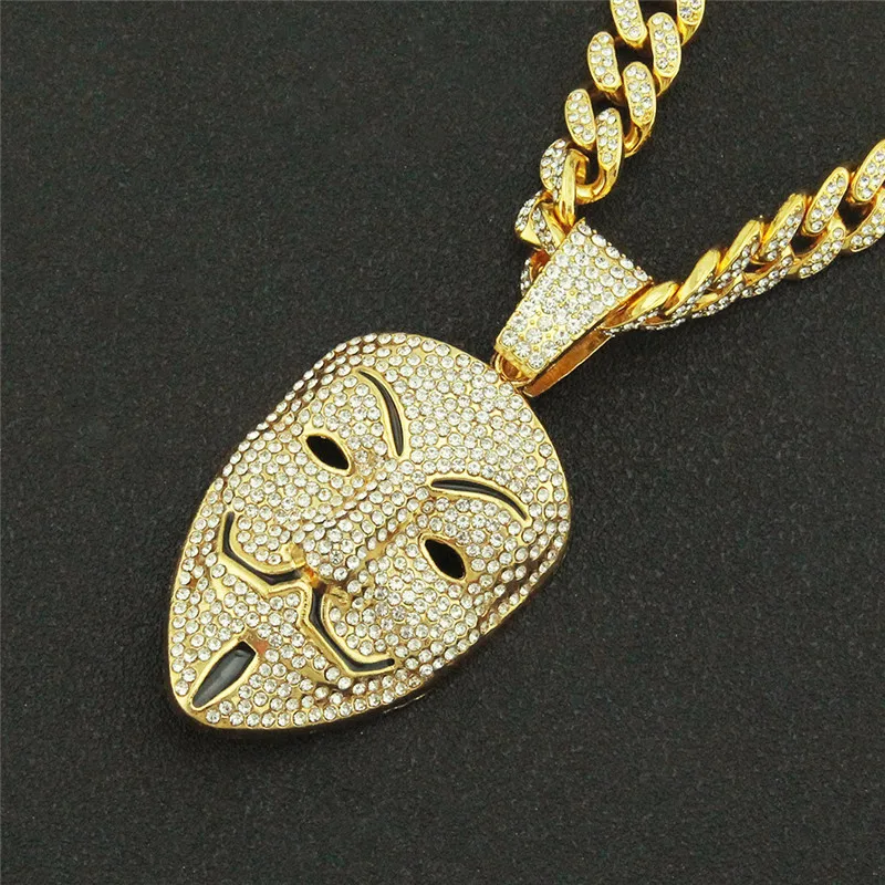 Cubic Zircon V For Vendetta Pendant Necklace For Men Jewelry Crystal Cuban Chain Anonymous Hacker Mask Charm Choker