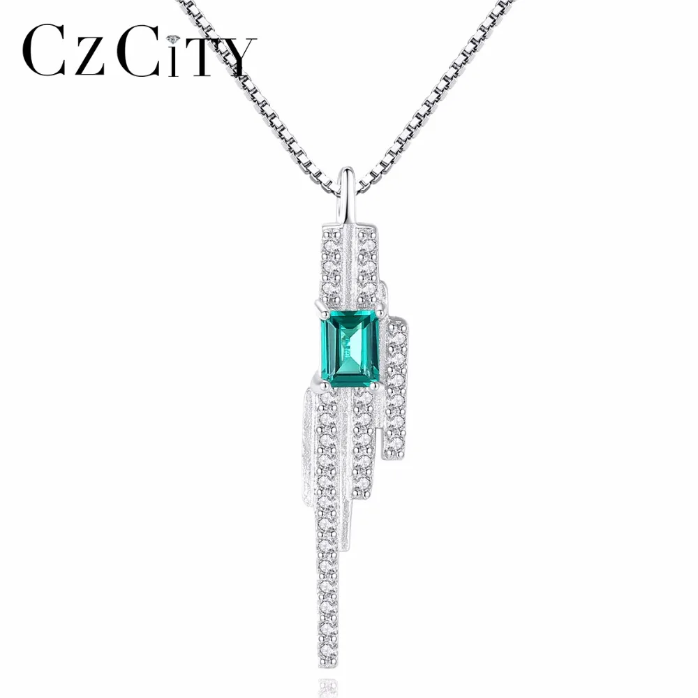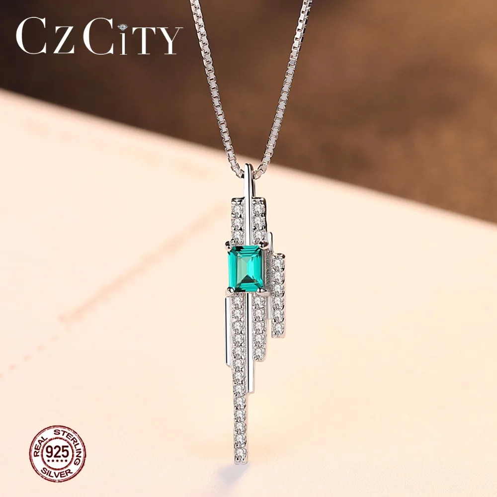Romantic Women Pendant Charms Chain Necklace Emerald Blue-Green Dinmond Stone with Small CZ Crystal around S 925 Silver