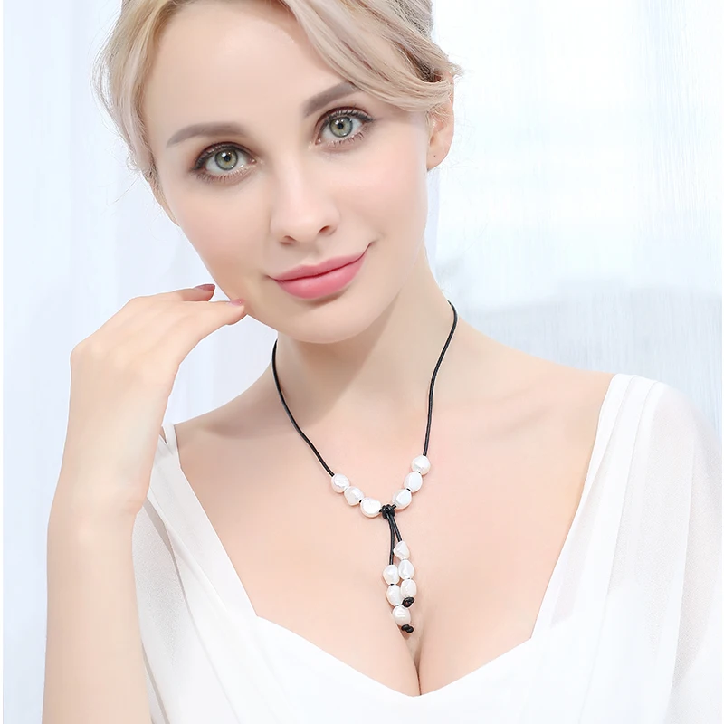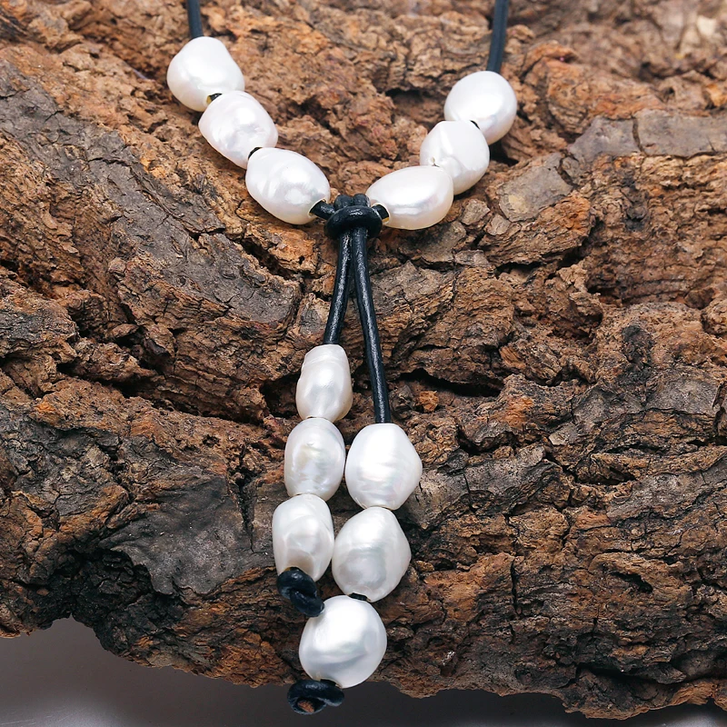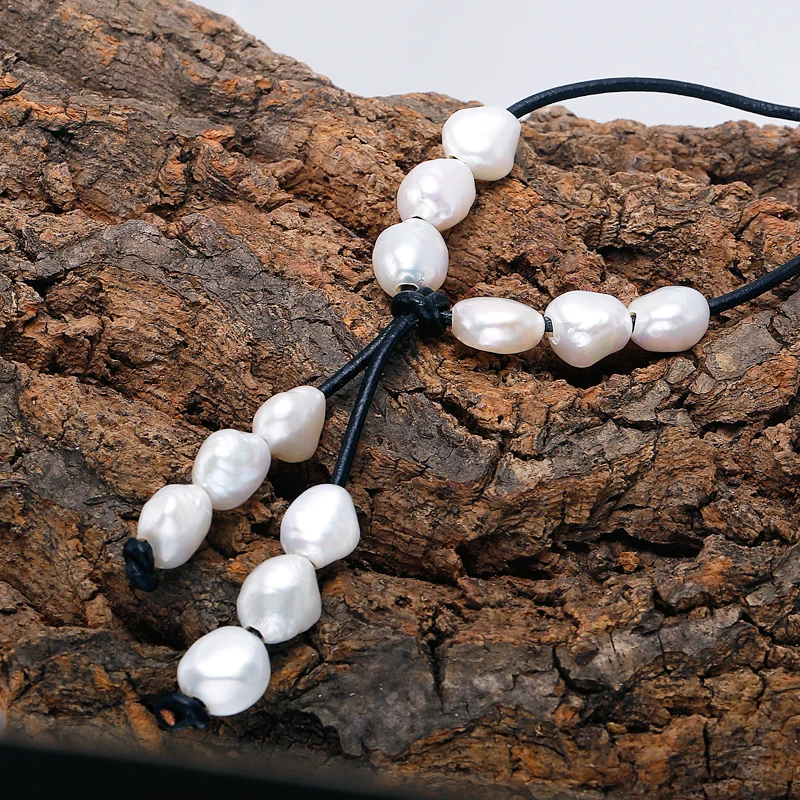 9-10mm Baroque Pearl Necklace WhitePearl & Leather Necklace For Woman