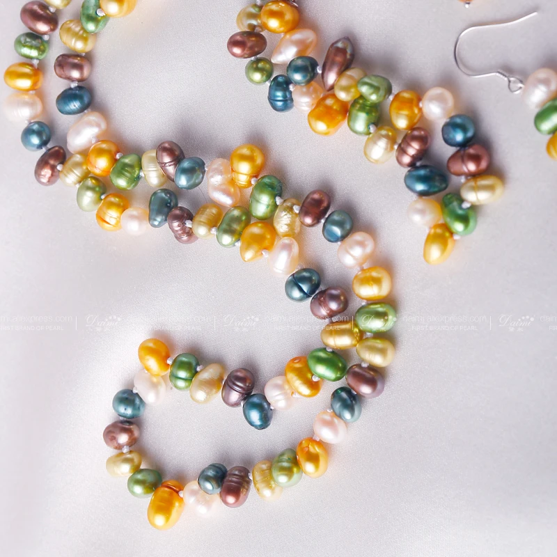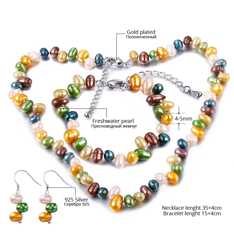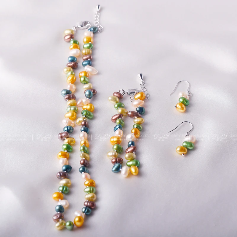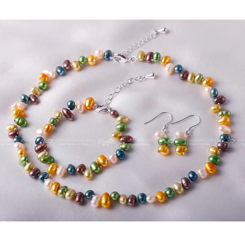 Multi Color Pearl 5-6mm Cultured Pearl Sets Necklace+Bracelet+Silver Earrings Jewelry Set Nice Gift For Girls