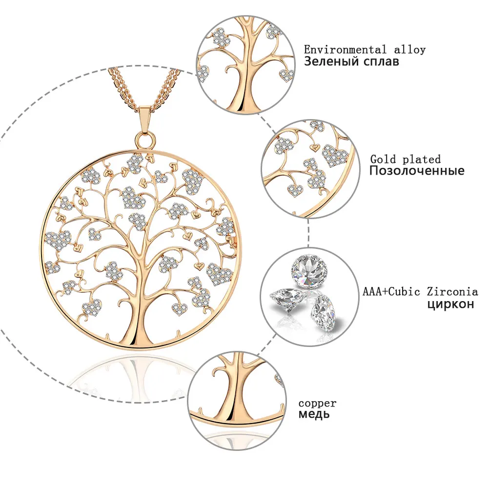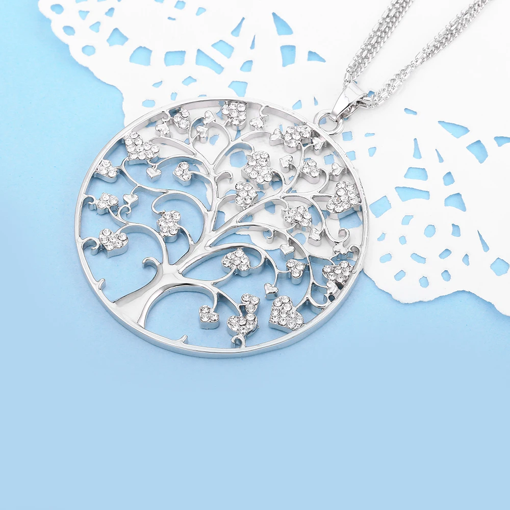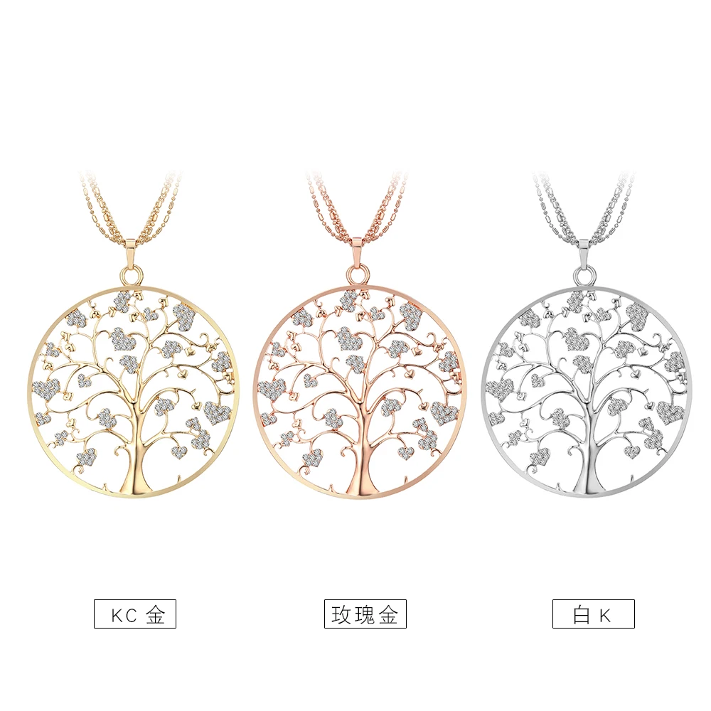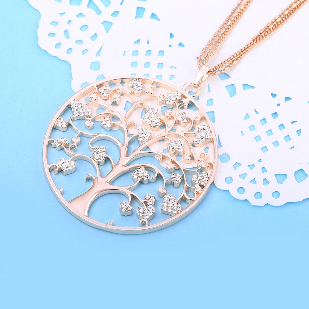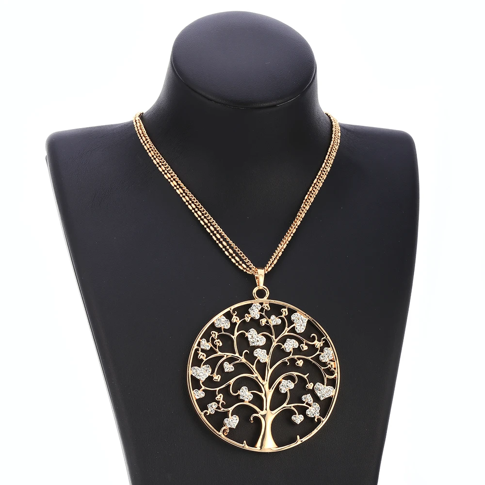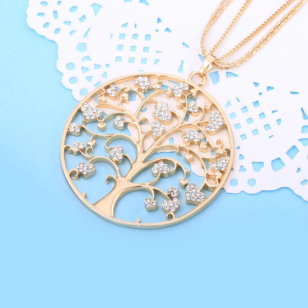 Design Tree Of Life Necklace For Woman Gold Color 3-layer Composite Chain Gig Crystal Round Pendant Long Necklaces Jewelry