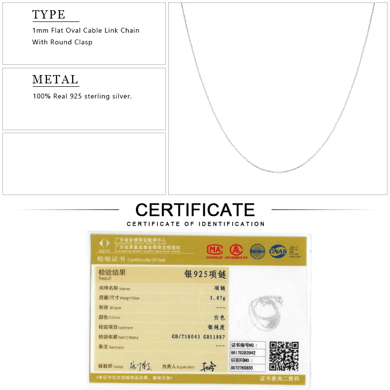 Women 1mm Flat Oval Cable Link Chain Chokers Necklaces Round Clasp 16 Inch/18 Inch Pure 925 Sterling Silver Necklace Women