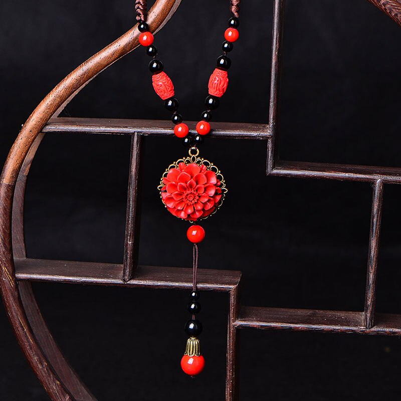 Ethnic Style Ladies Pendant Necklace Retro Red Flower Female Clothes Accessories Temperament Clavicle Sweater Chain