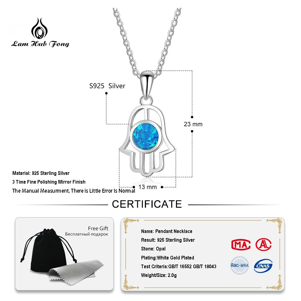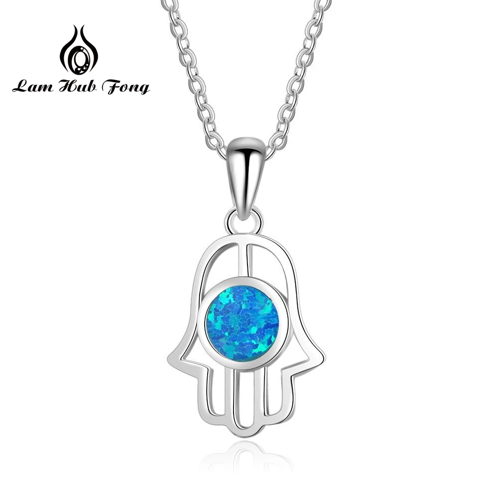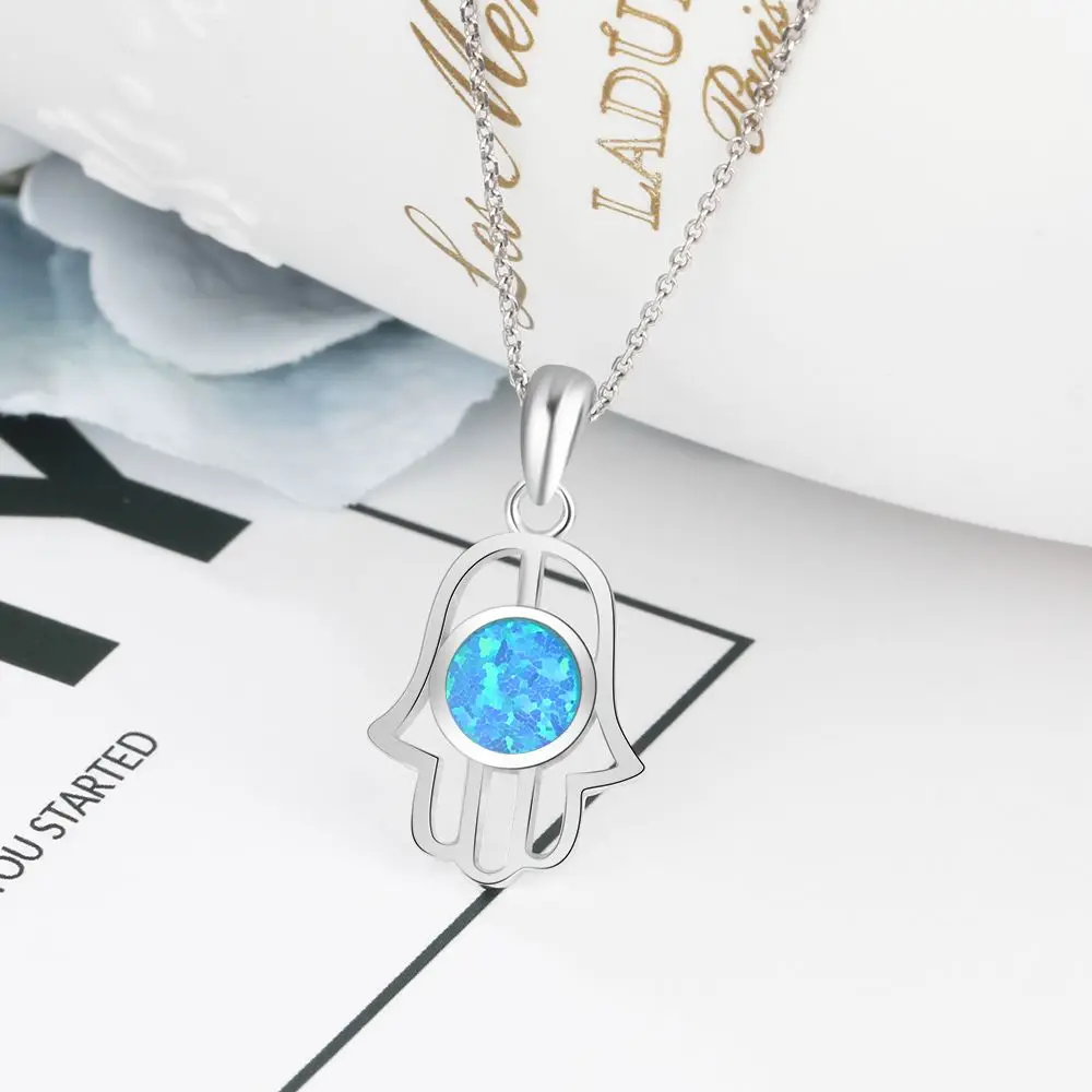 European Blue Opal Necklace Hamas Hand Pendant Necklaces 925 Sterling Silver Women Geometric Irregular Turkish Pendant