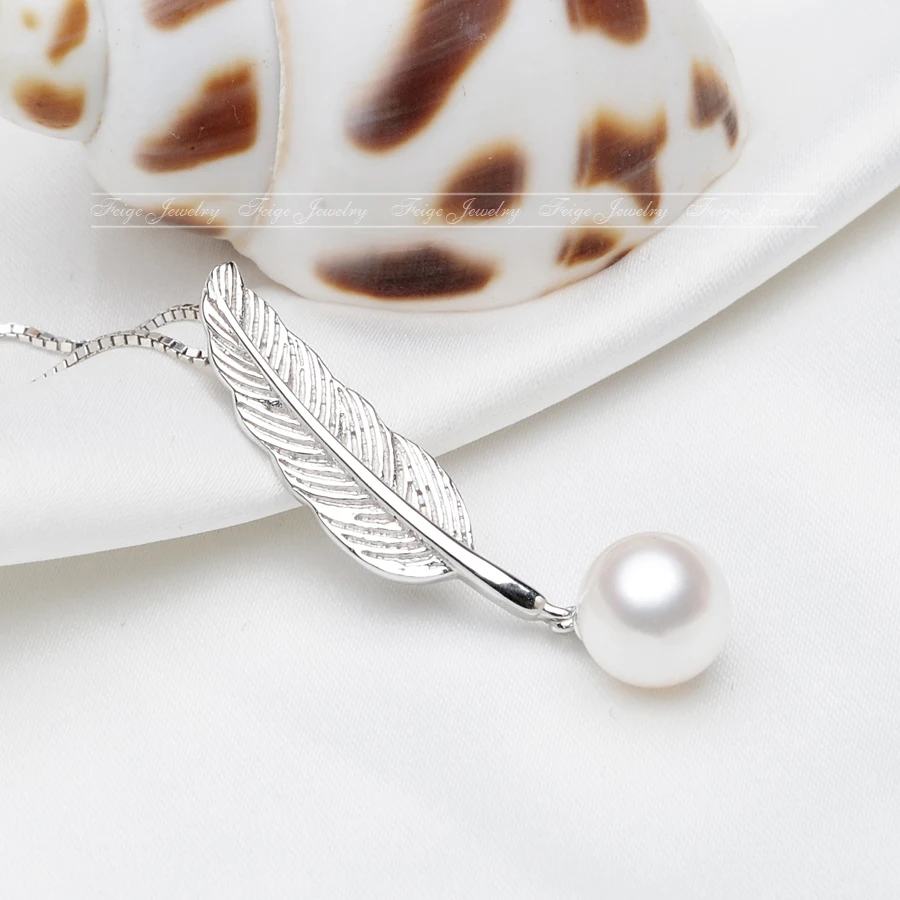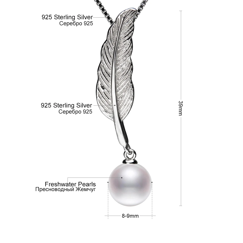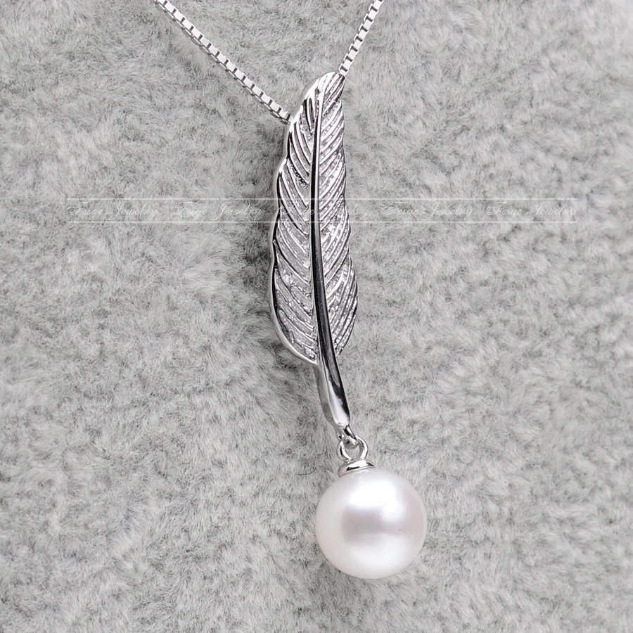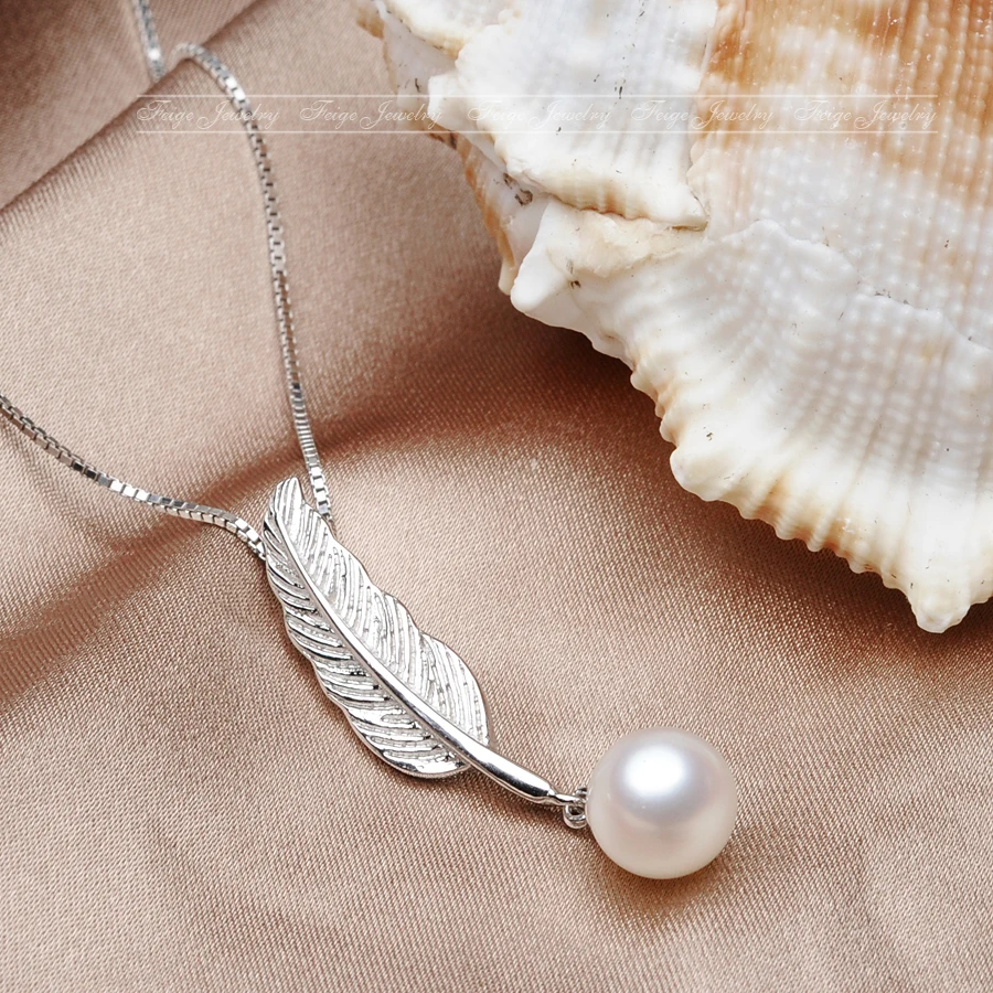 Feather Natural Pearl Pendant Necklaces for Women Gift 8-9MM Round Pearl 925 Sterling Silver Chain Fine Jewelry FEIGE
