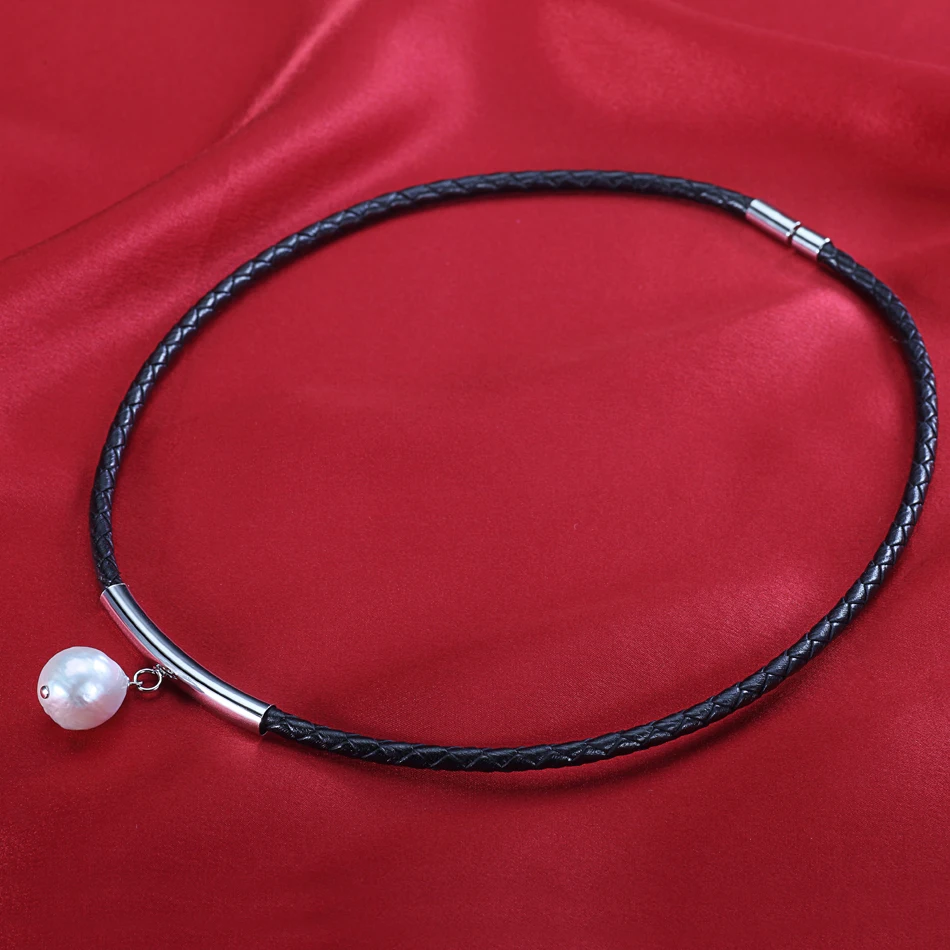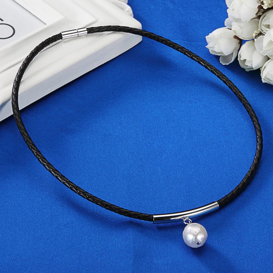 Black Leather Rope Choker Pendant Necklace 13-14MM Baroque White Pearl Necklace Trendy Necklace Lady Best Gift