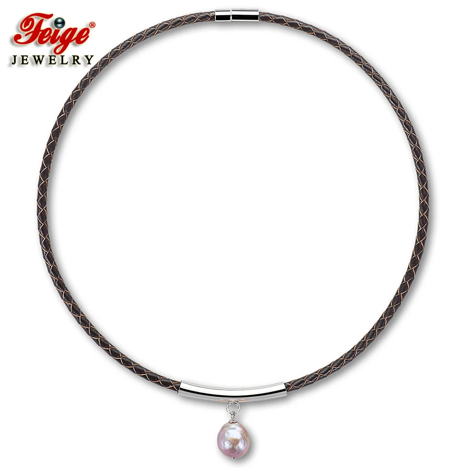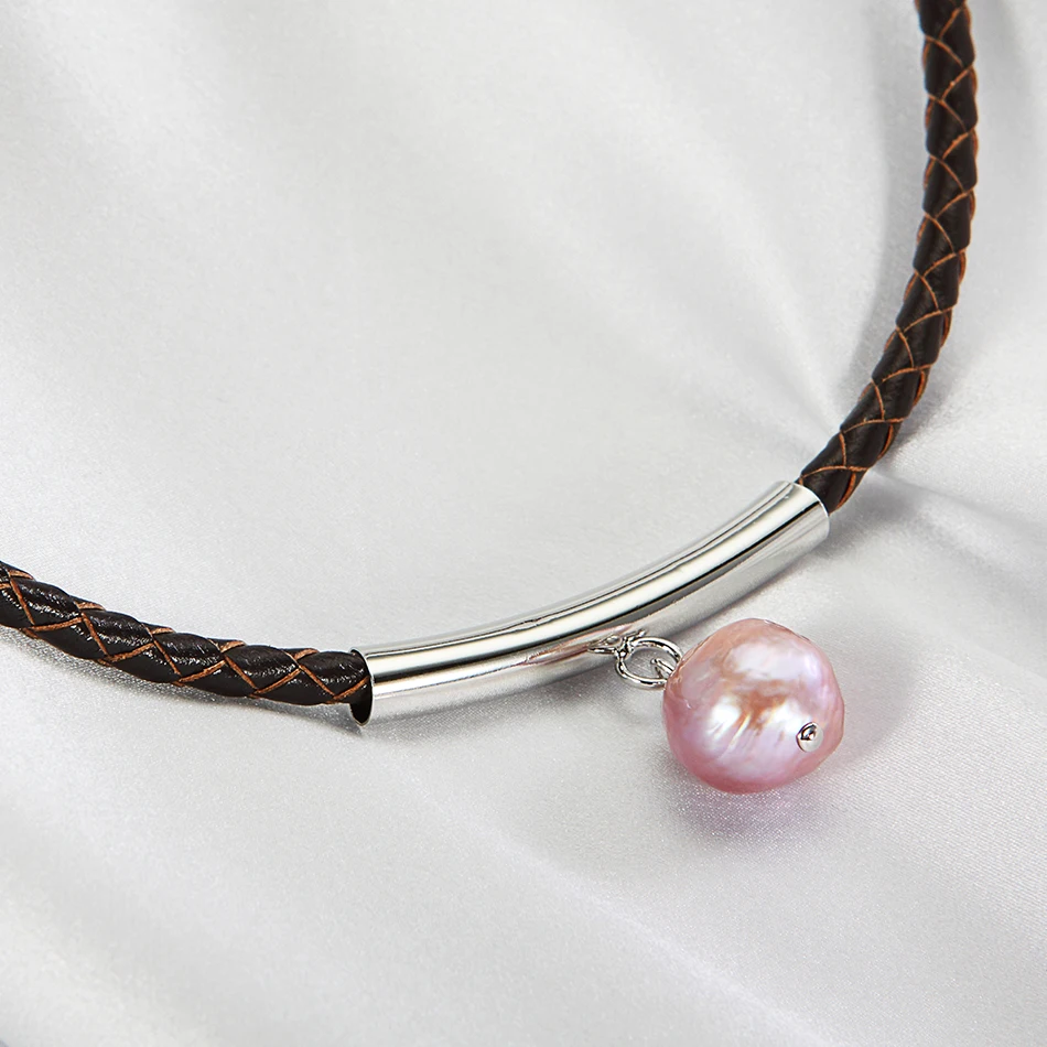 Brown Leather Rope Choker Pendant Necklace 12-13MM Baroque Purple Pearl Necklace Trendy Necklace Lady Best Gift
