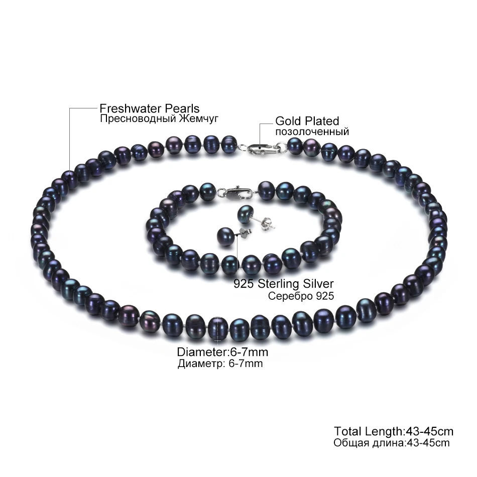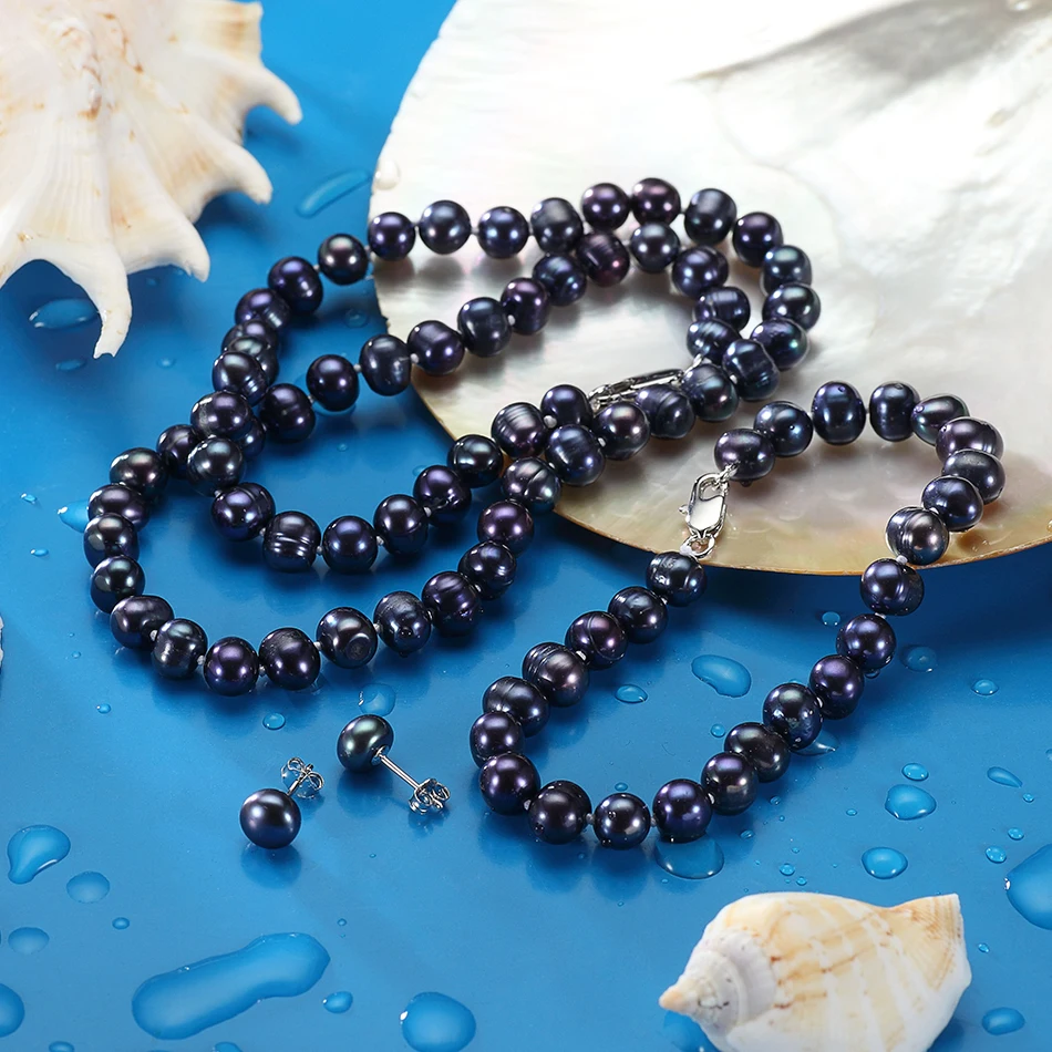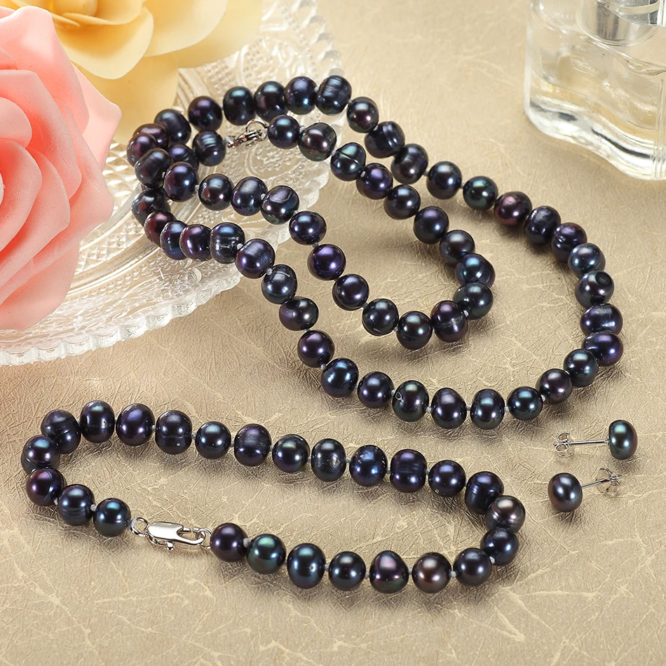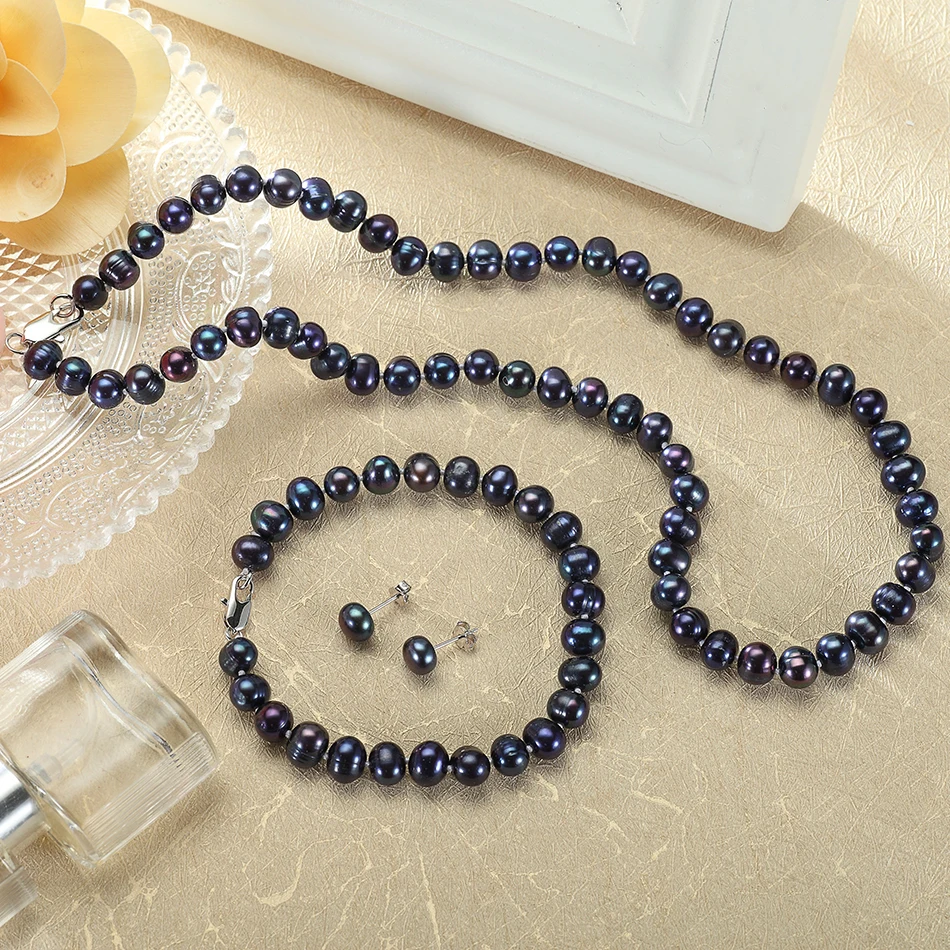 Vintage Black Pearl Necklace Jewelry Sets for Women Party Jewelry Gifts 7-8MM Pearl 925 Silver Stud Earring Set FEIGE