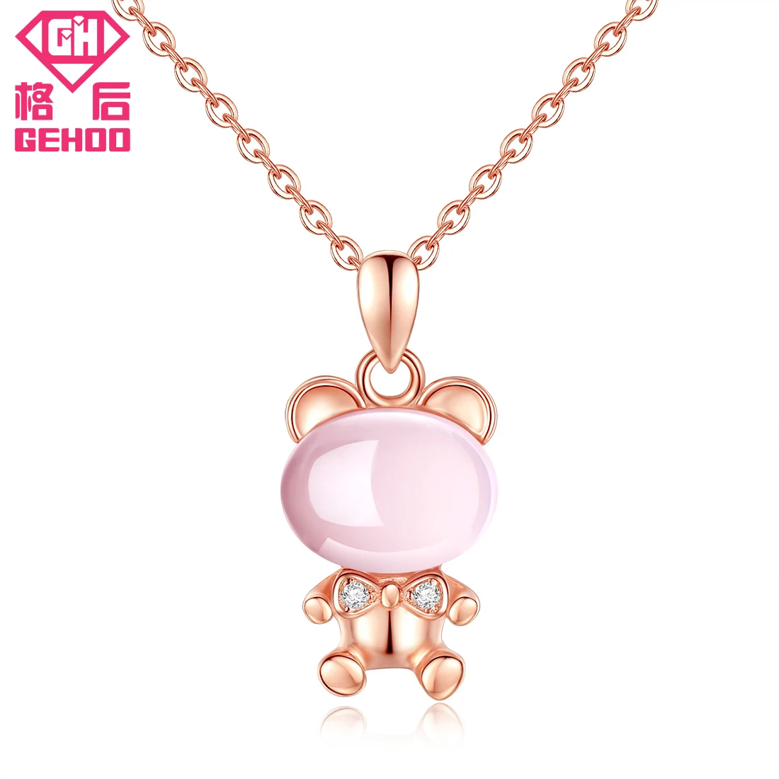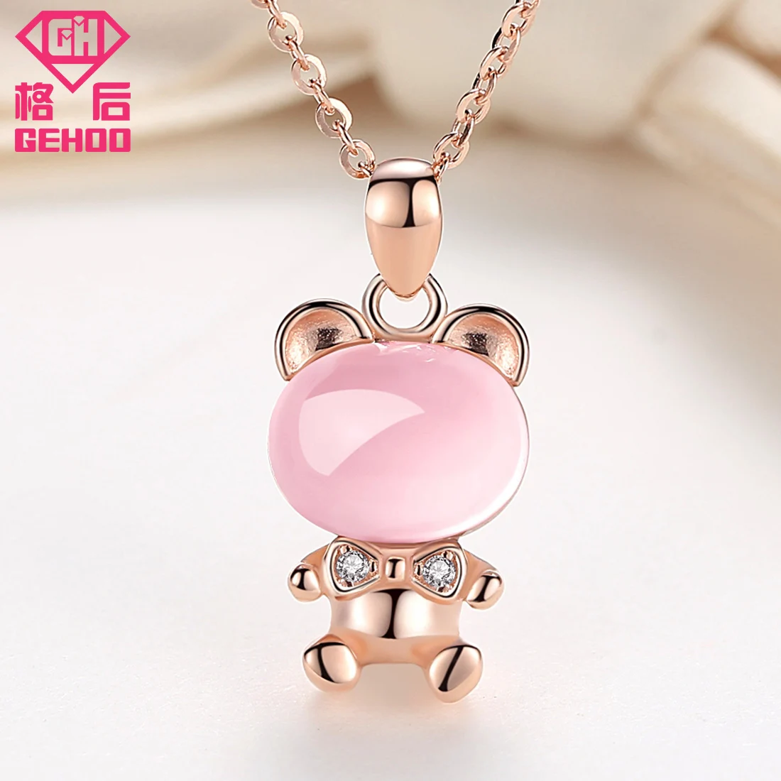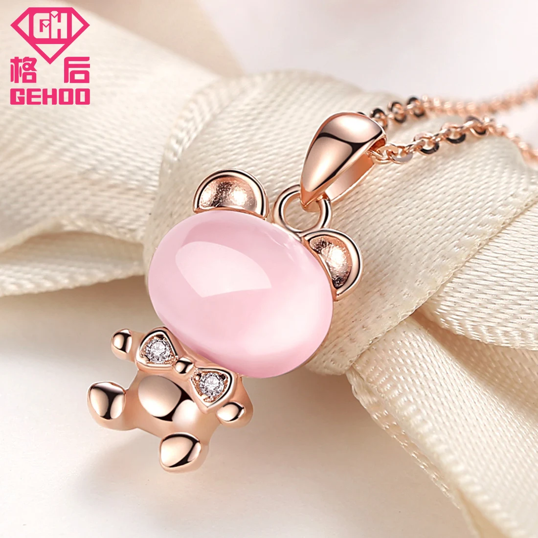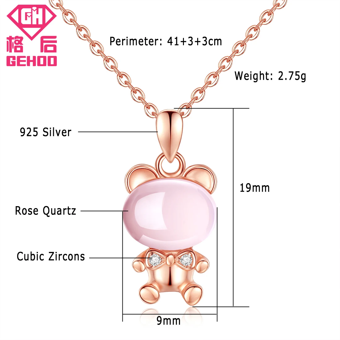 2020 New Arrival 925 Sterling Silver Lovely Bear Cute Pedant Necklaces Jewelry Gift For Women Ladies Girl Rose Quartz