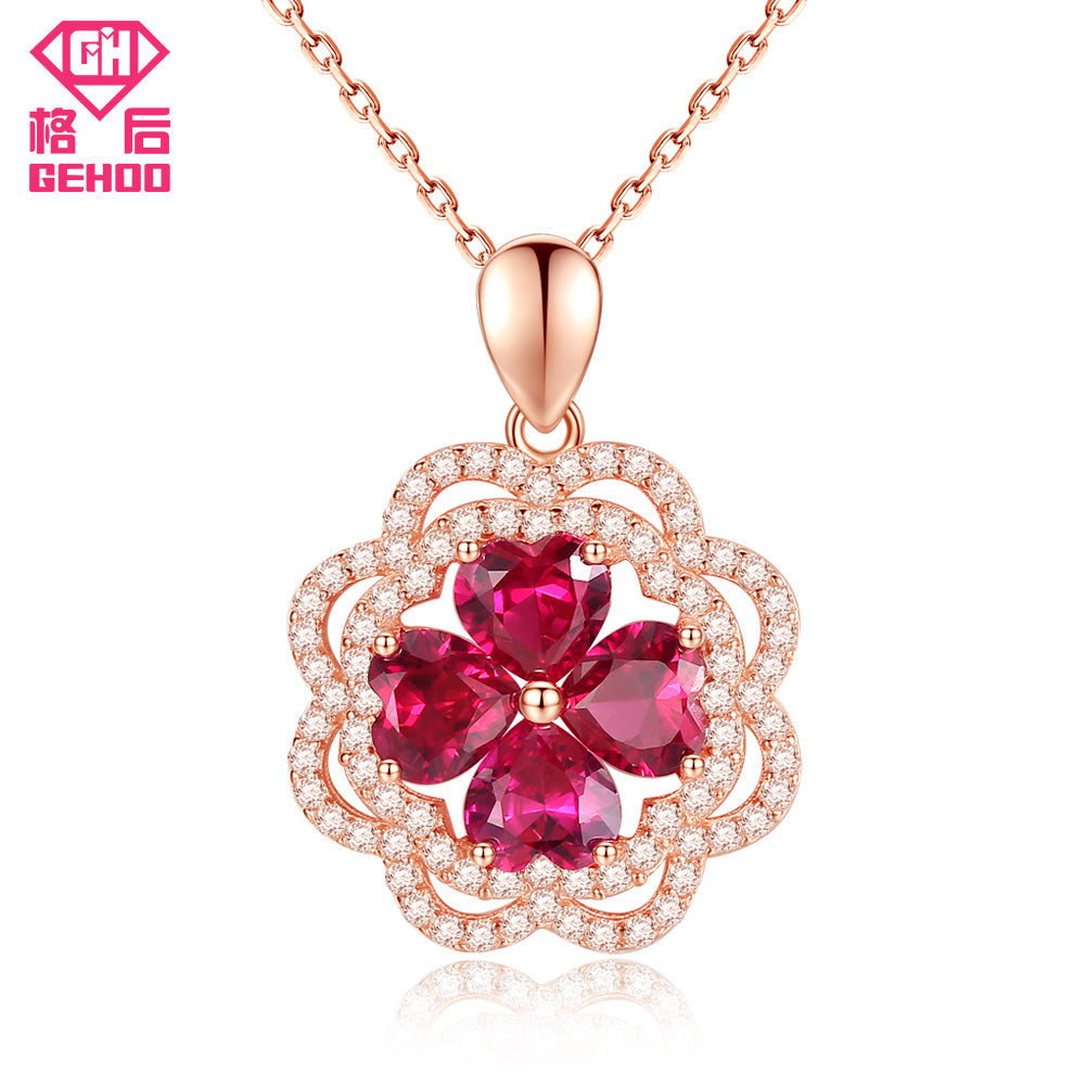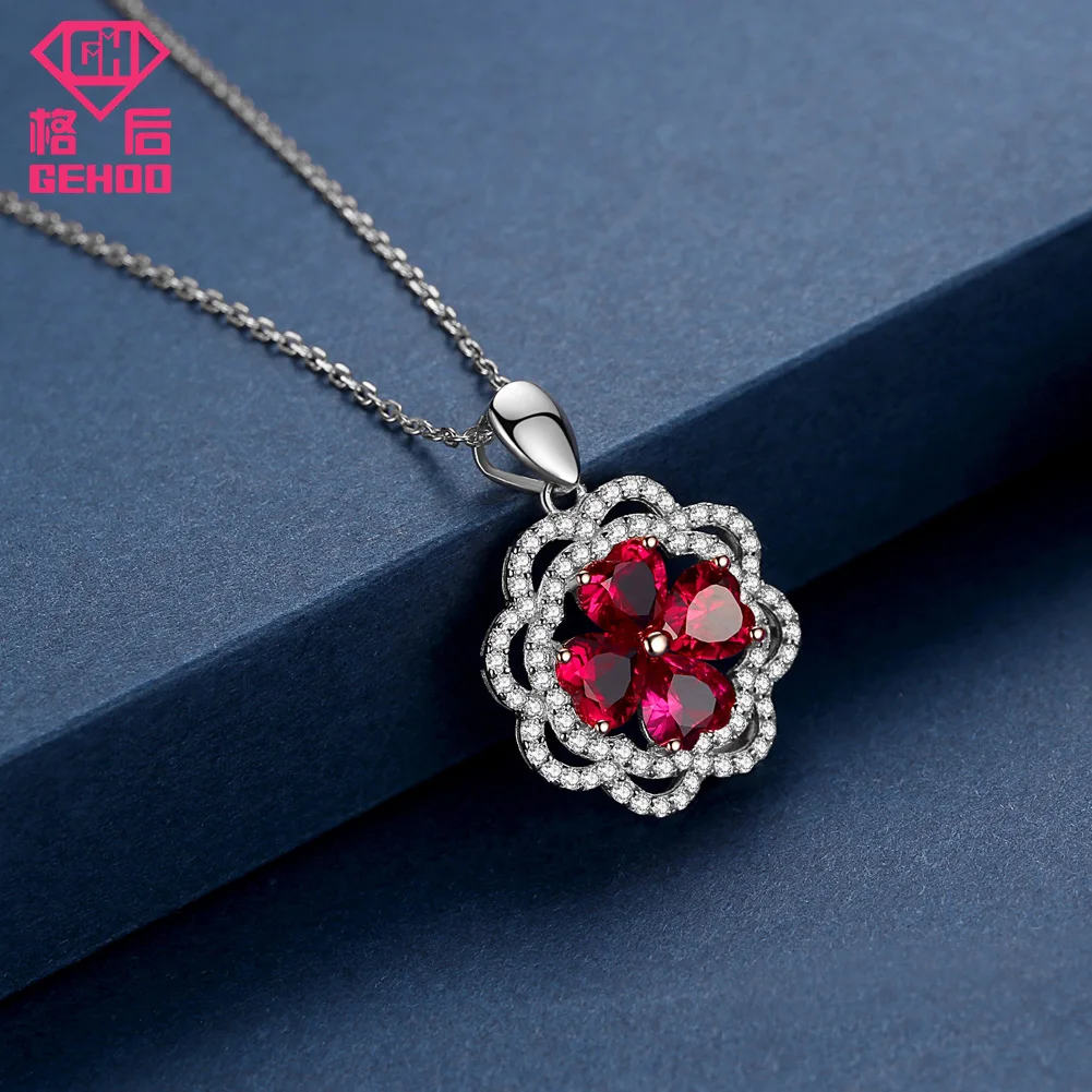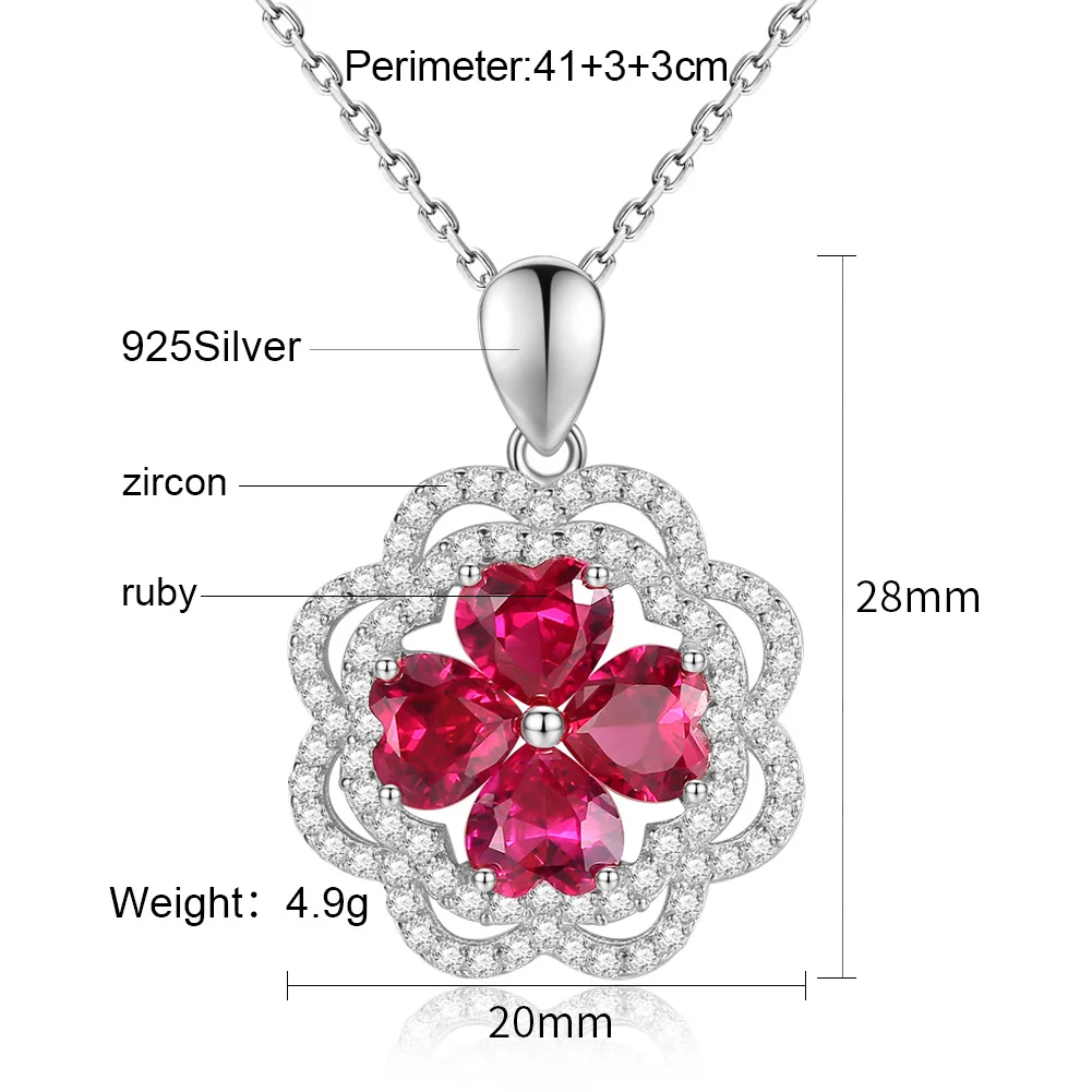 925 Sterling Silver Red Pretty Ruby Heart Gemstone Zircon Paved Flower Pendant Necklace for Wedding Bridal Women Jewelry
