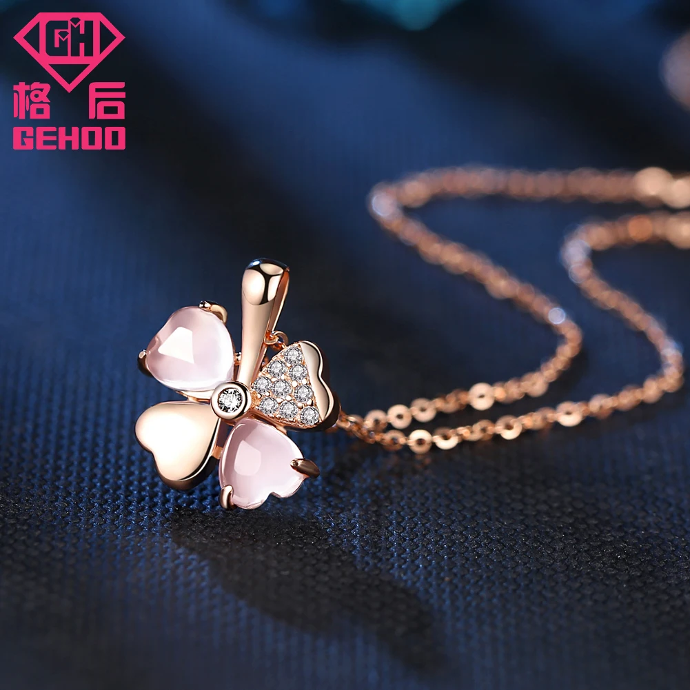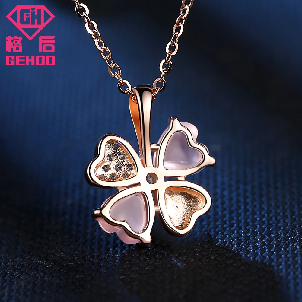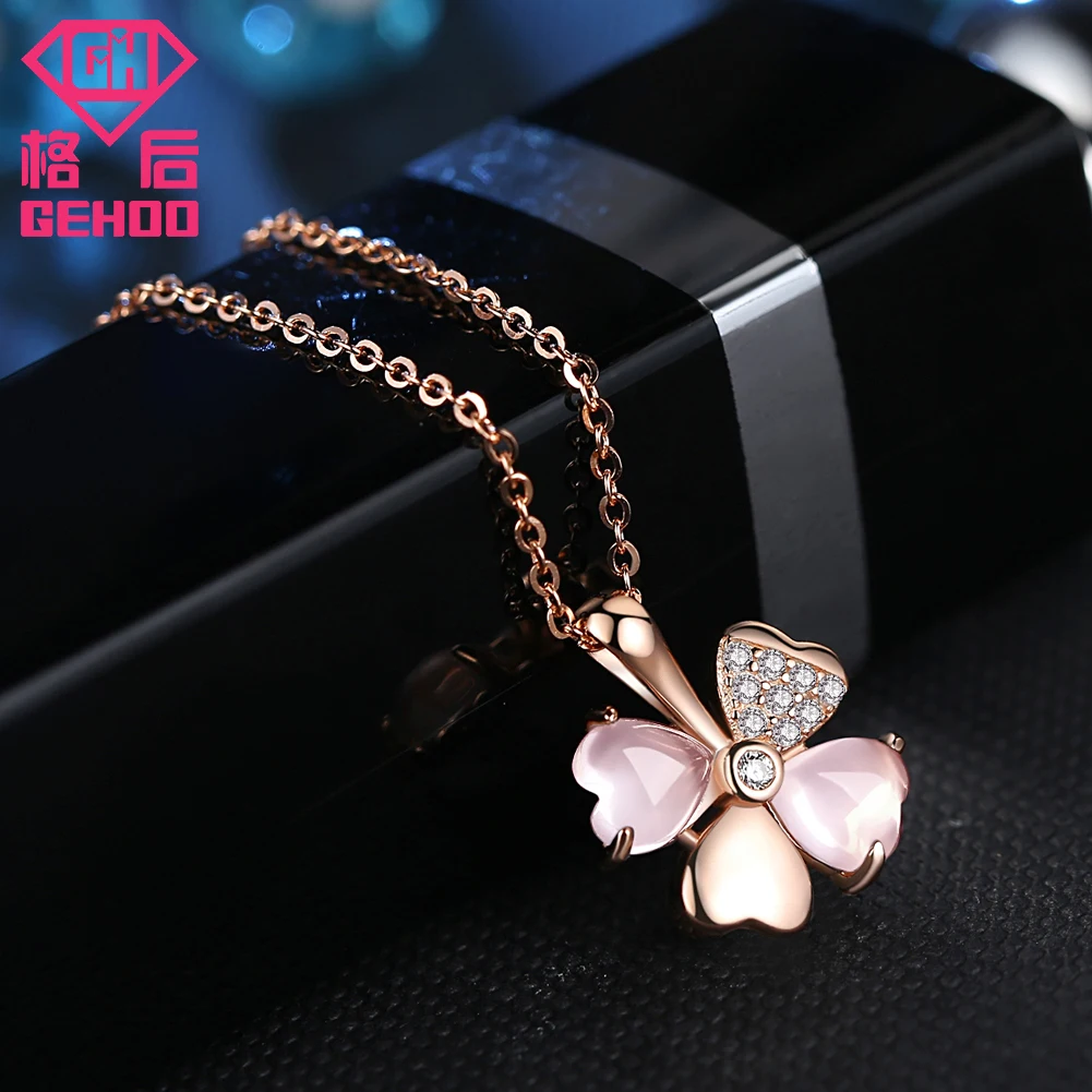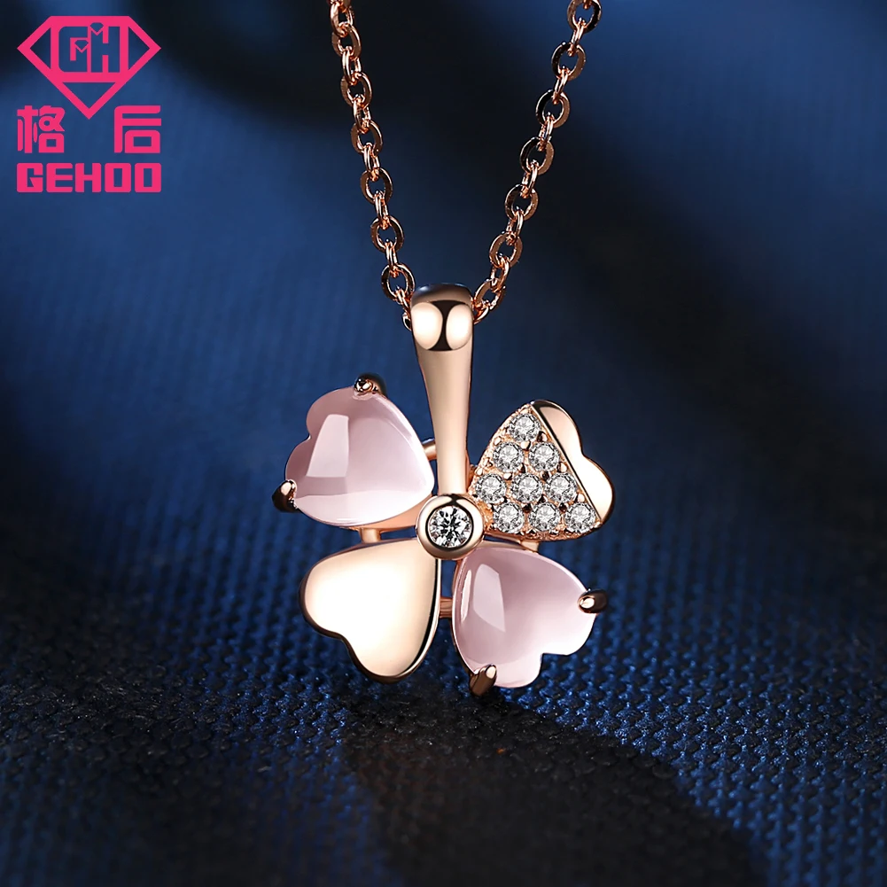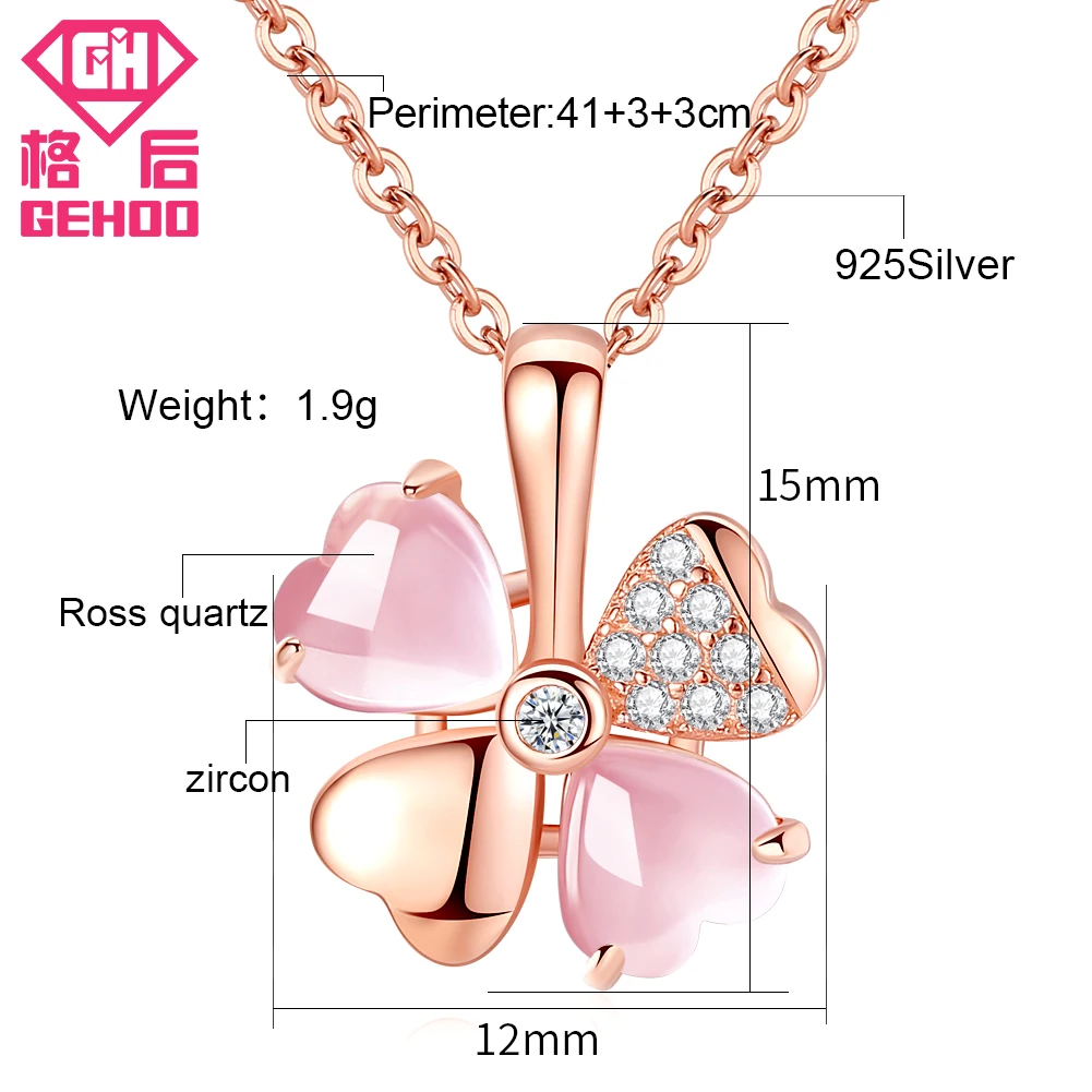 Pretty Rose Quartz Clover Pink Pendant Necklace Women Charm Fine Jewelry 925 Sterling Silver Rose Gold Chain Choker Gifts