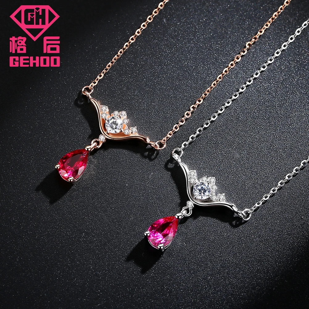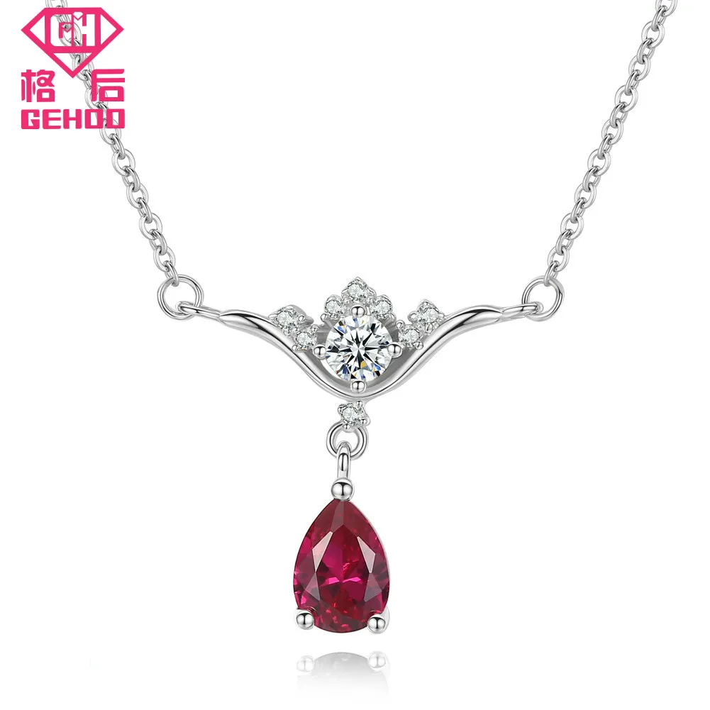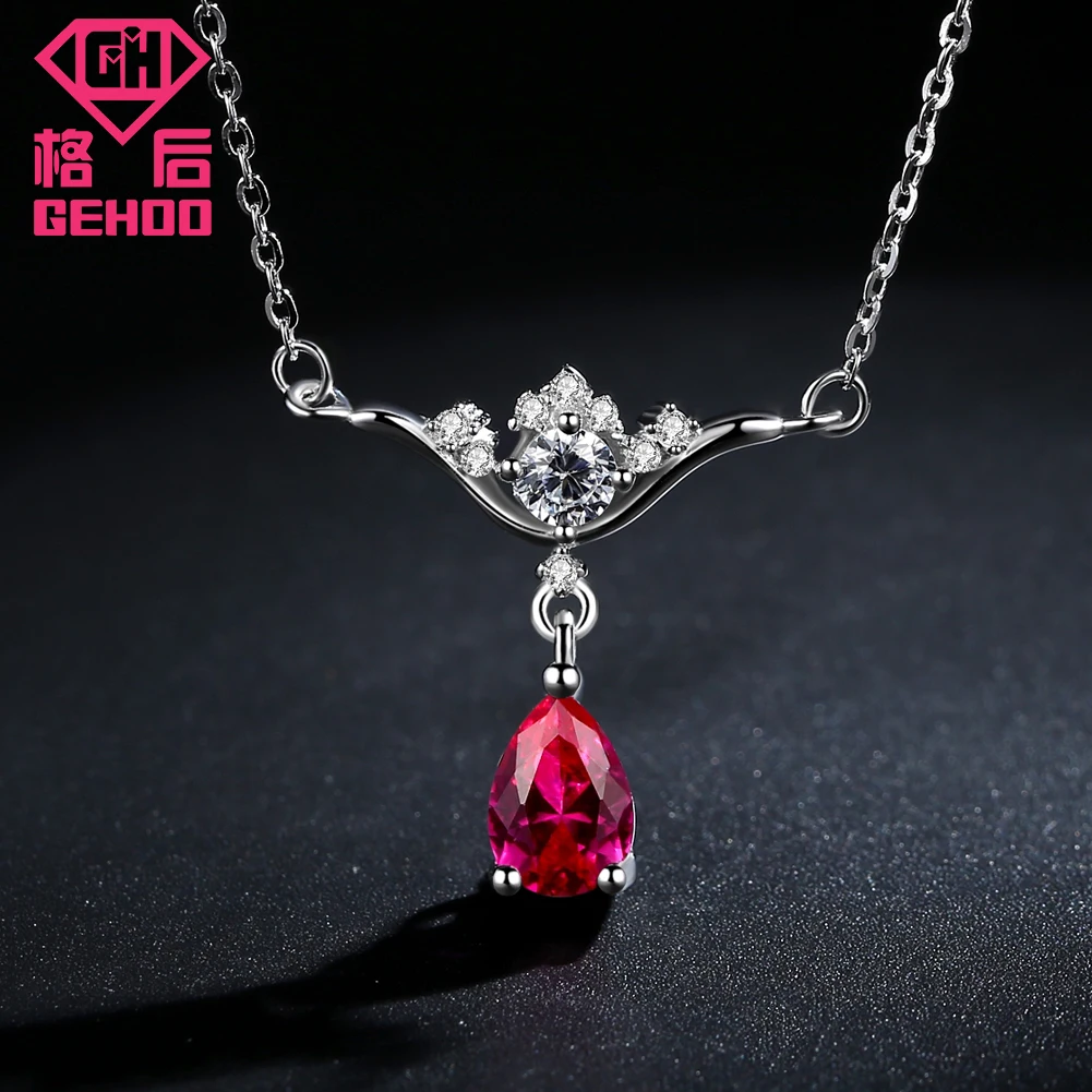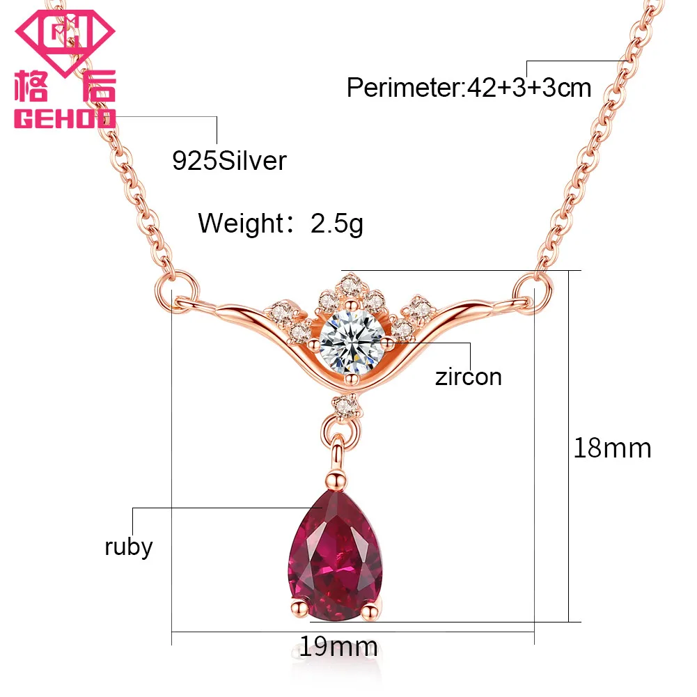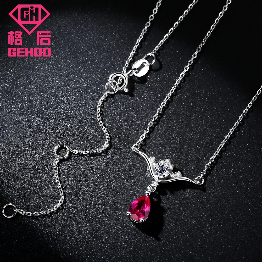 Red Stone Ruby Teardrop Flower Pendant Necklace Women Wedding Charm Jewelry Pure 925 Silver Suspension Collar Pingentes