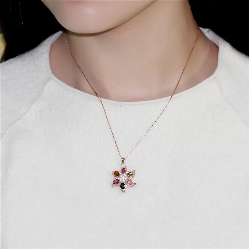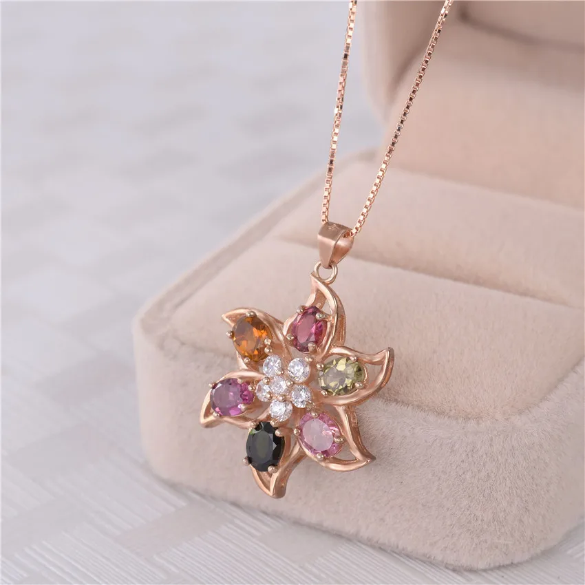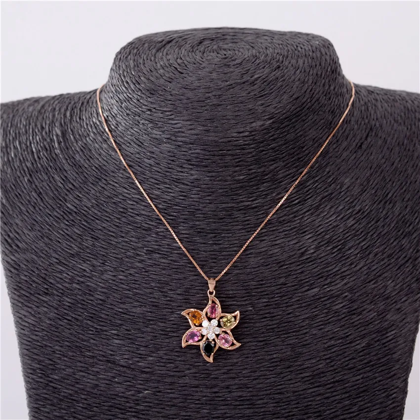2.4ct Tourmaline Vintage Antique Silver 925 MultiColor Crystal Beads Big Flower Pendant Jewelry Necklace with Box CN026