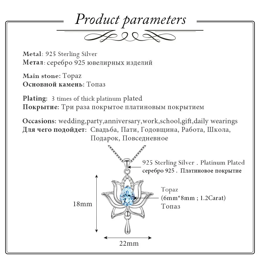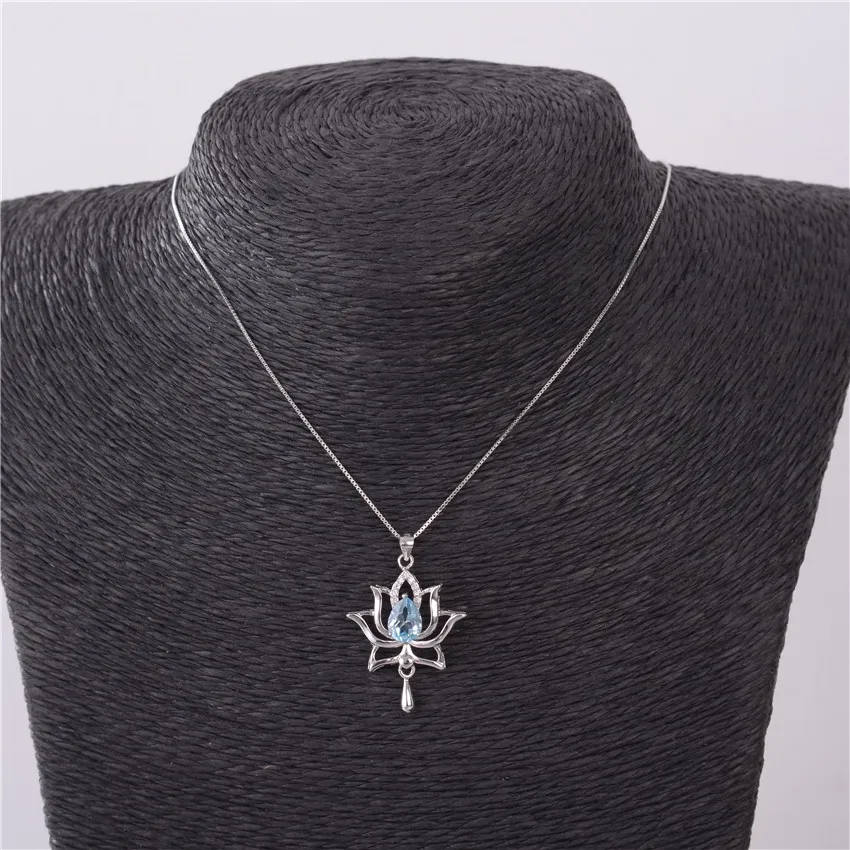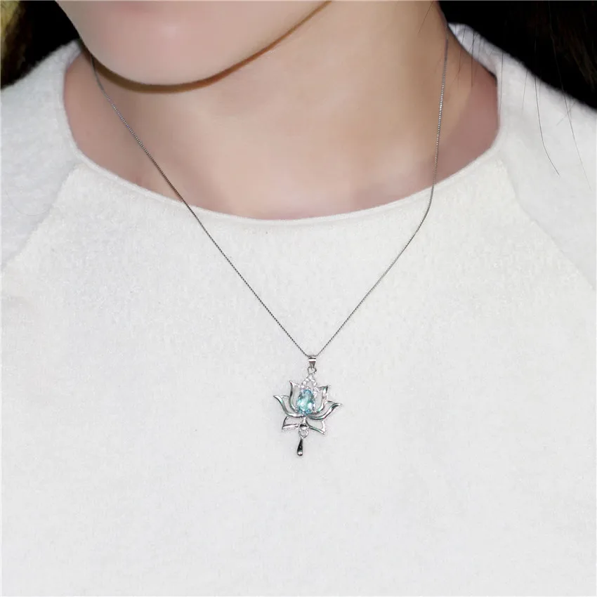 Female 1.2ct Blue Topaz 925 Sterling Silver Lotus Necklaces & Pendants for Women Elegant Dandelion Flower with Box CN055