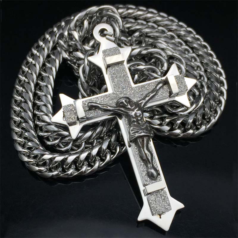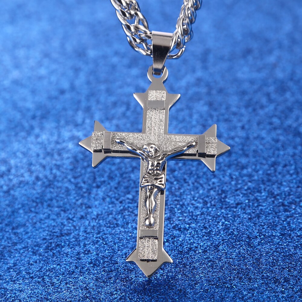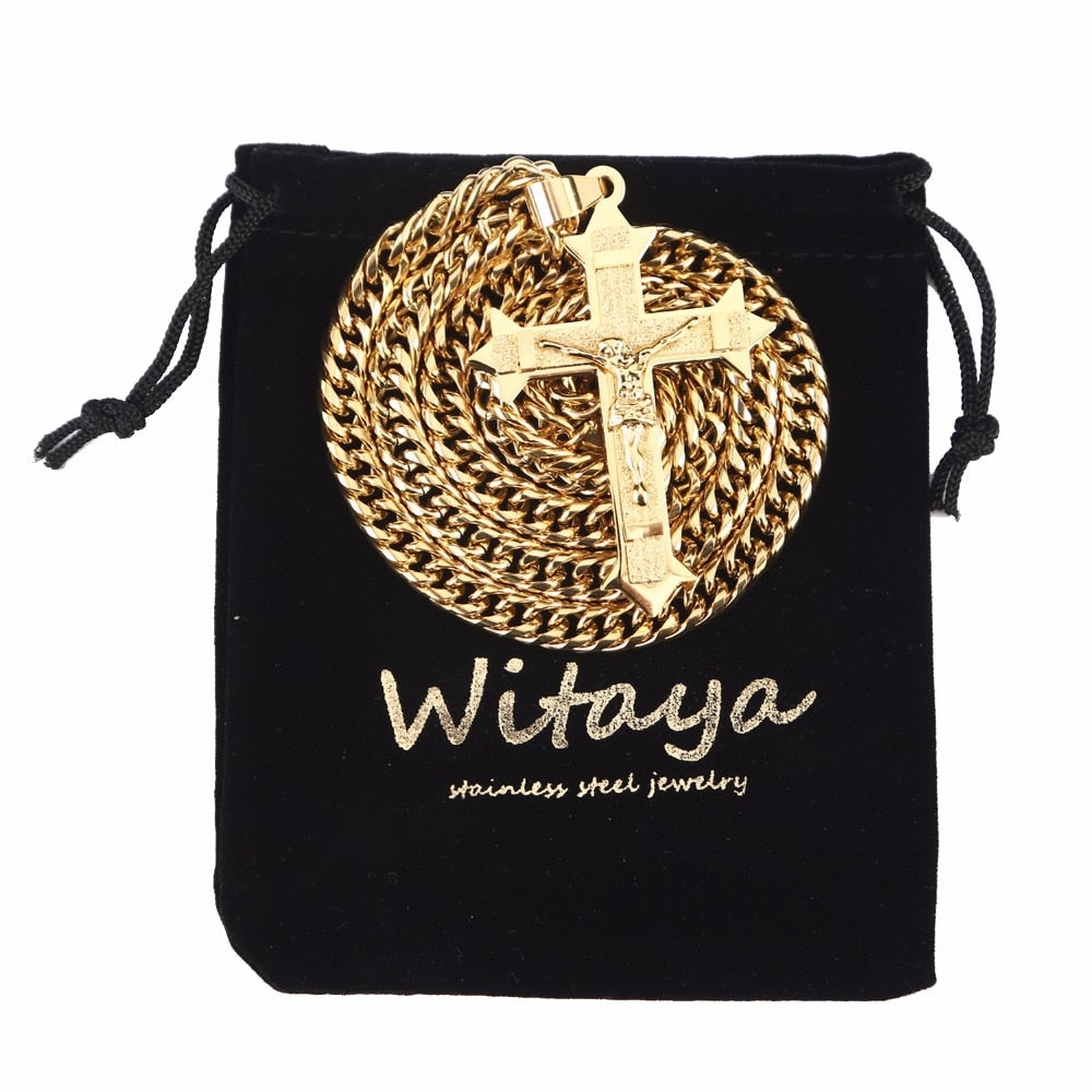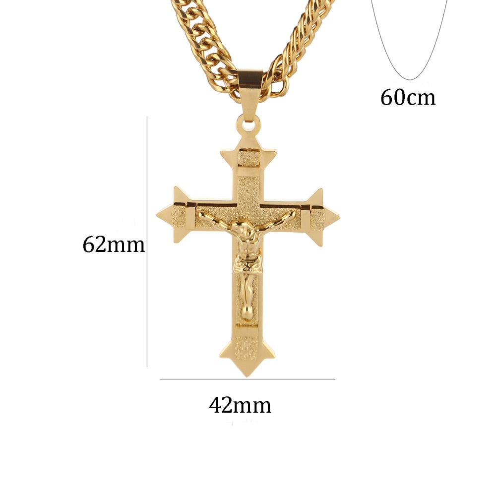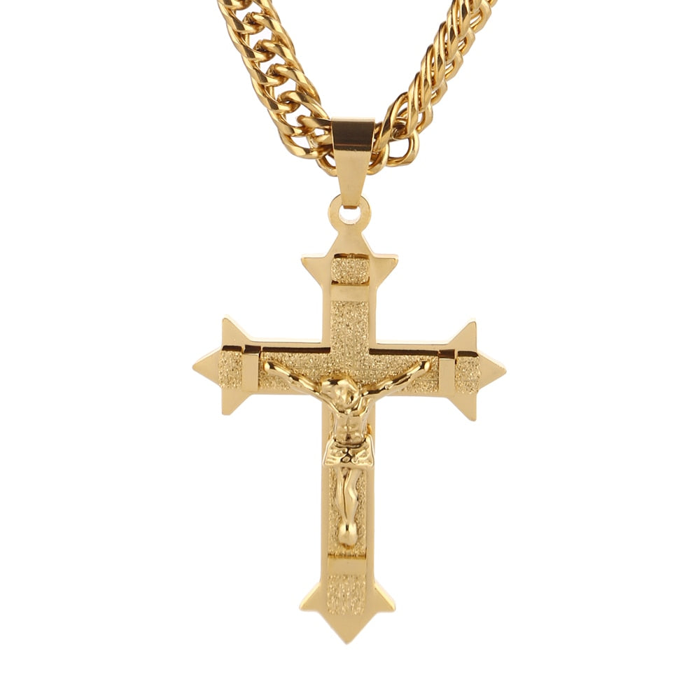 Gold tone Cross Christ Jesus Pendant Necklace Stainless Steel Link rolo Chain Heavy Men Jewelry Gift 21.65" 7mm