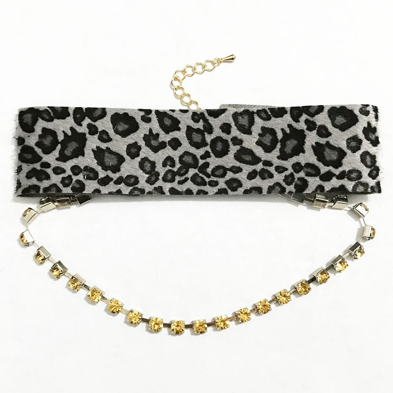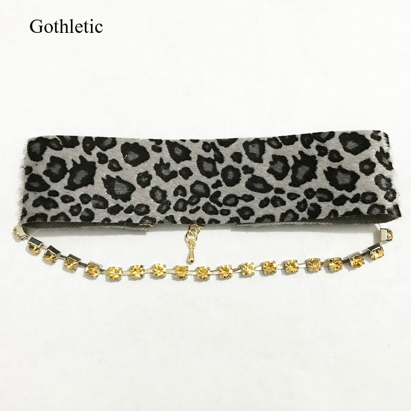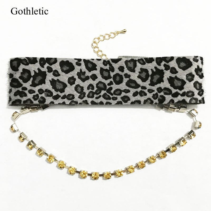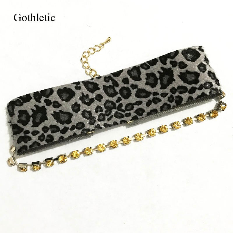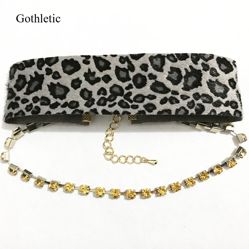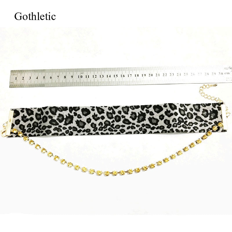 Gothleitc 2021 Leopard Print Fabric Wide Statement Choker Rhinestone Chain Drop CollarNecklace for Women Hip Hop Jewelry