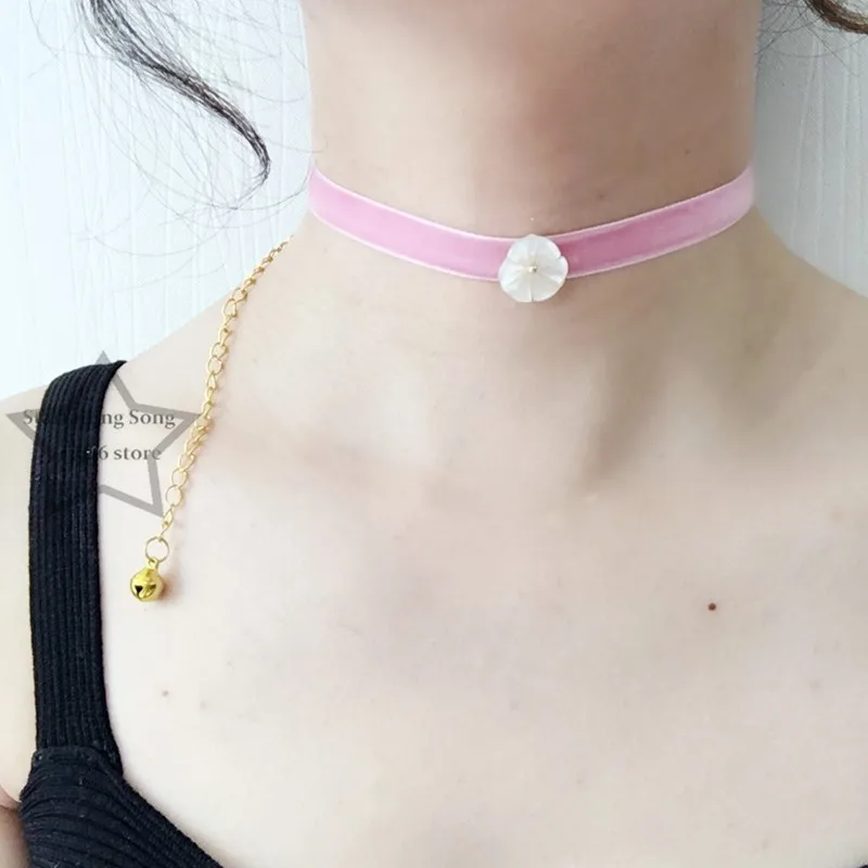 Handmade 14MM Natural Flower Shell Pendant & Pink Velvet Ribbon Rope Jewelry Choker Necklaces