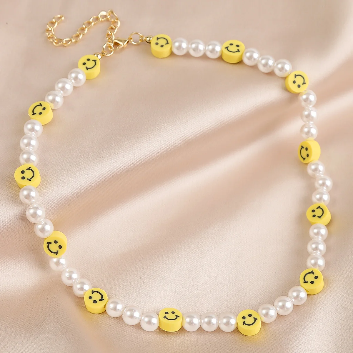 Handmade Imitation Pearls Smile Face Beaded Necklace For Women Acrylic Bead Strand Choker Collar Bohemian Jewelry 2022 Trend