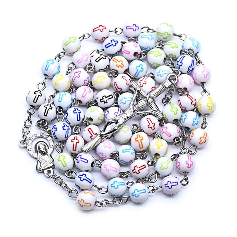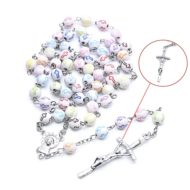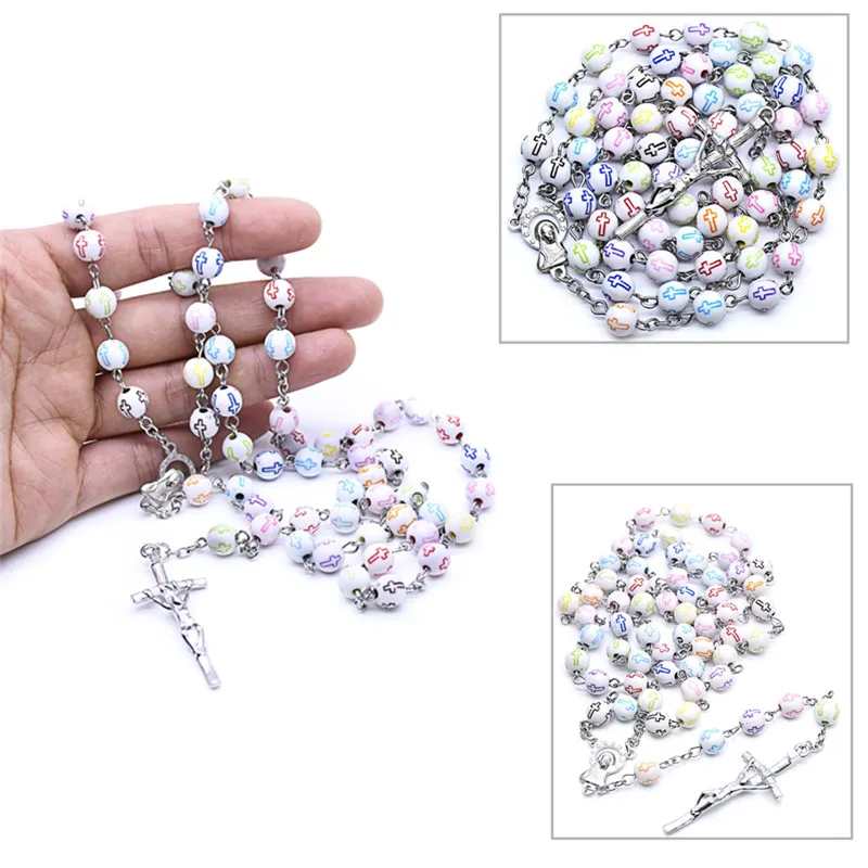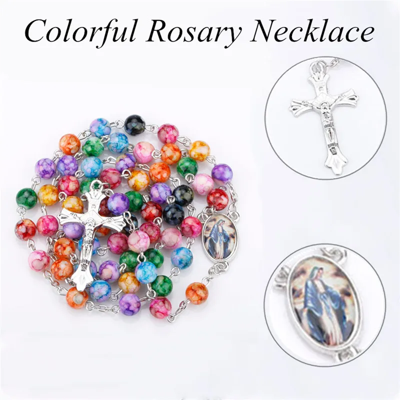 Handmade Religious Cross Pendant Rosary Necklace Christ Chain Round Beads Choker Rainbow Resin Chain Jewelry For Unisex Colorful