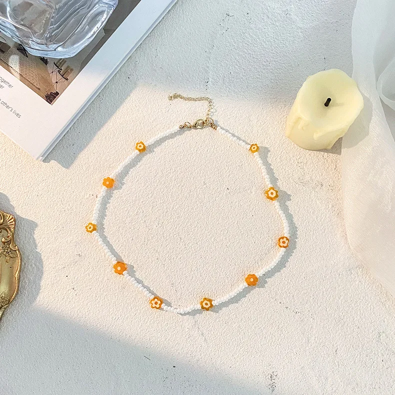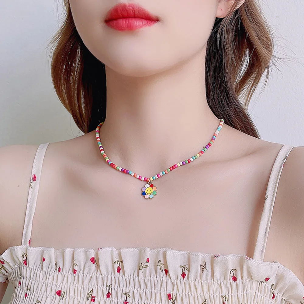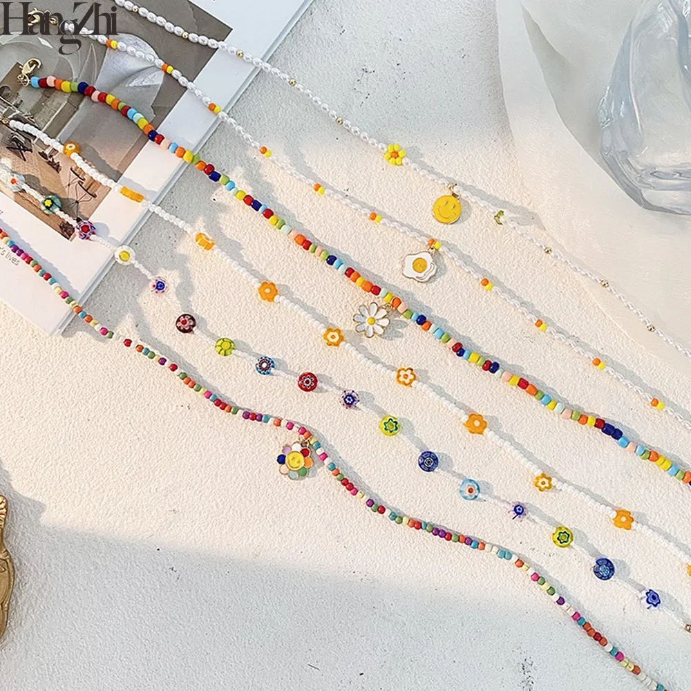 HangZhi 2022 Colorful Glazed Bohemia Simple Flowers Smiley Little Daisy Pendant Beaded Necklace for Women Party Jewellery