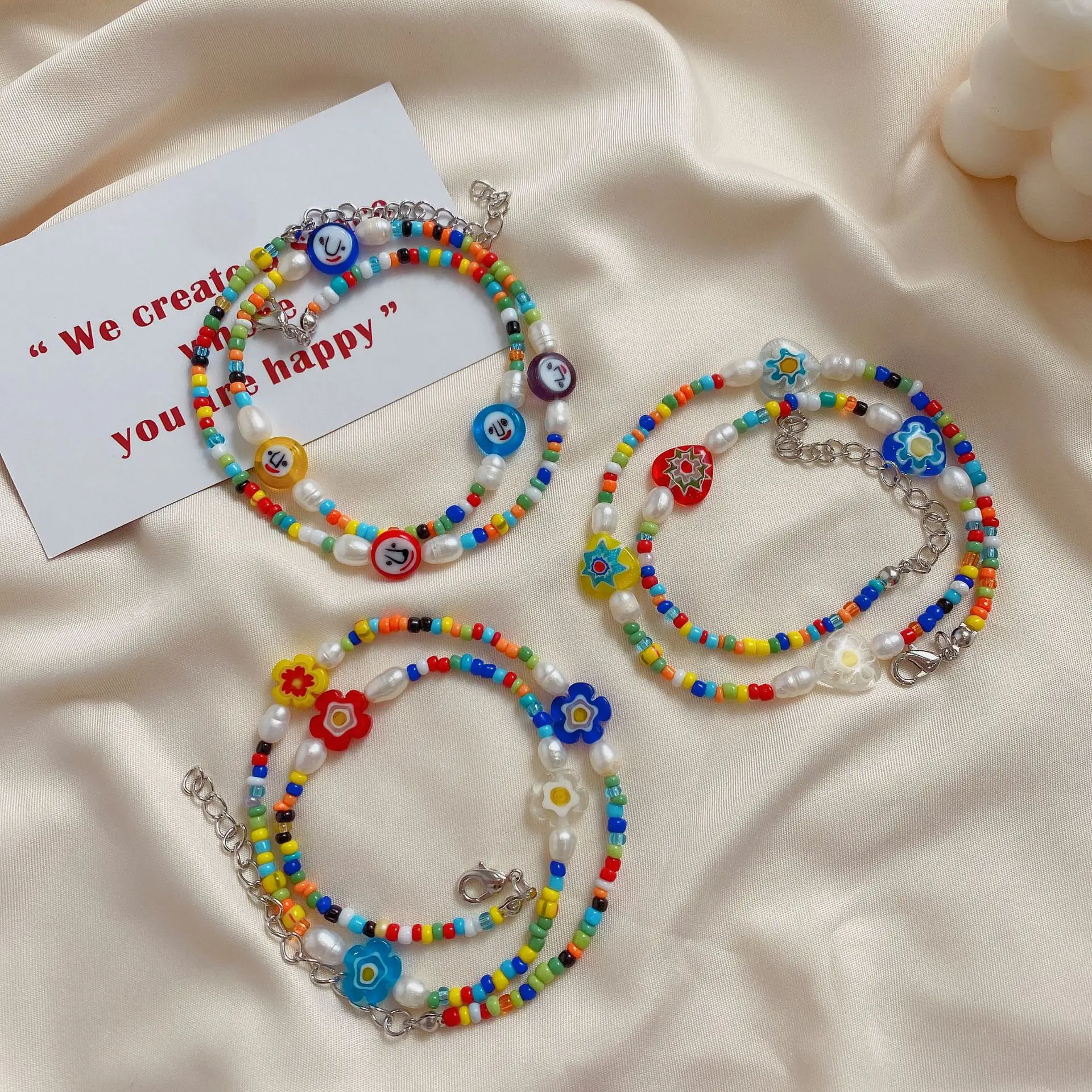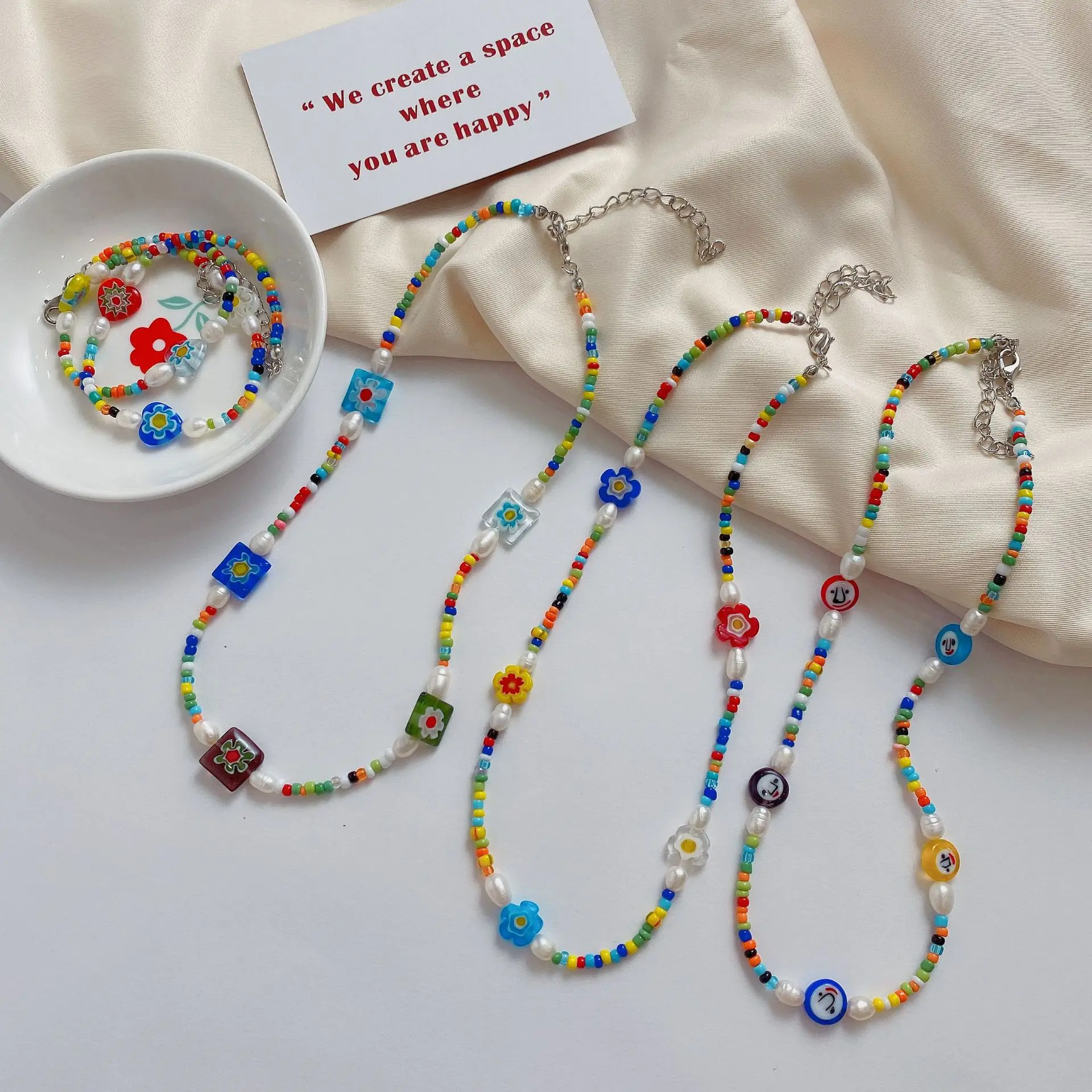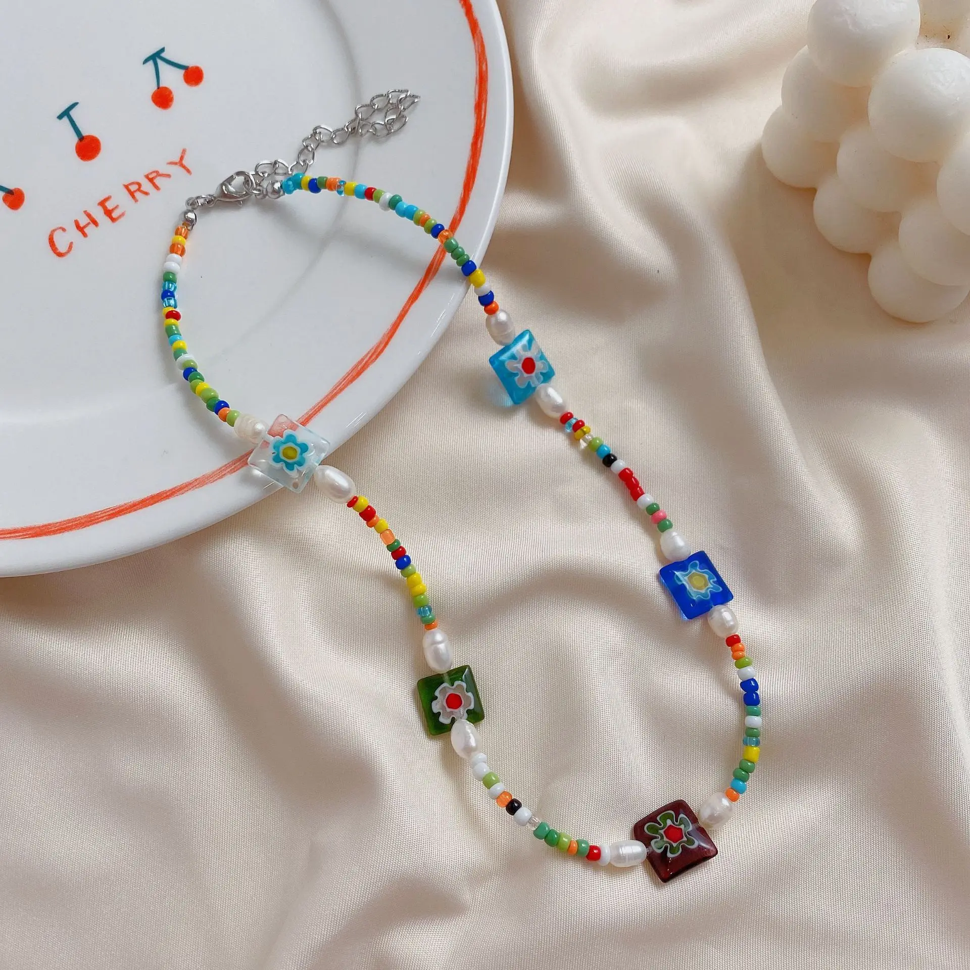 HangZhi Colorful Glaze Daisy Flower Freshwater Pearl Resin Beads Y2K Clavicle Necklace 2021 for Women Girl Jewelry