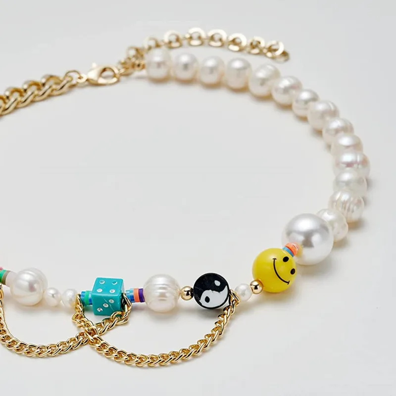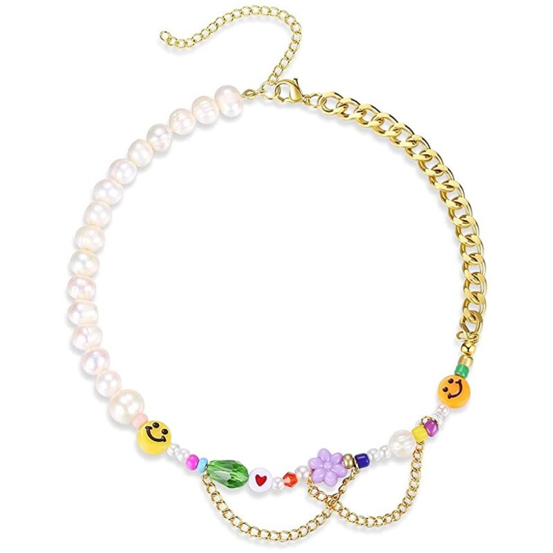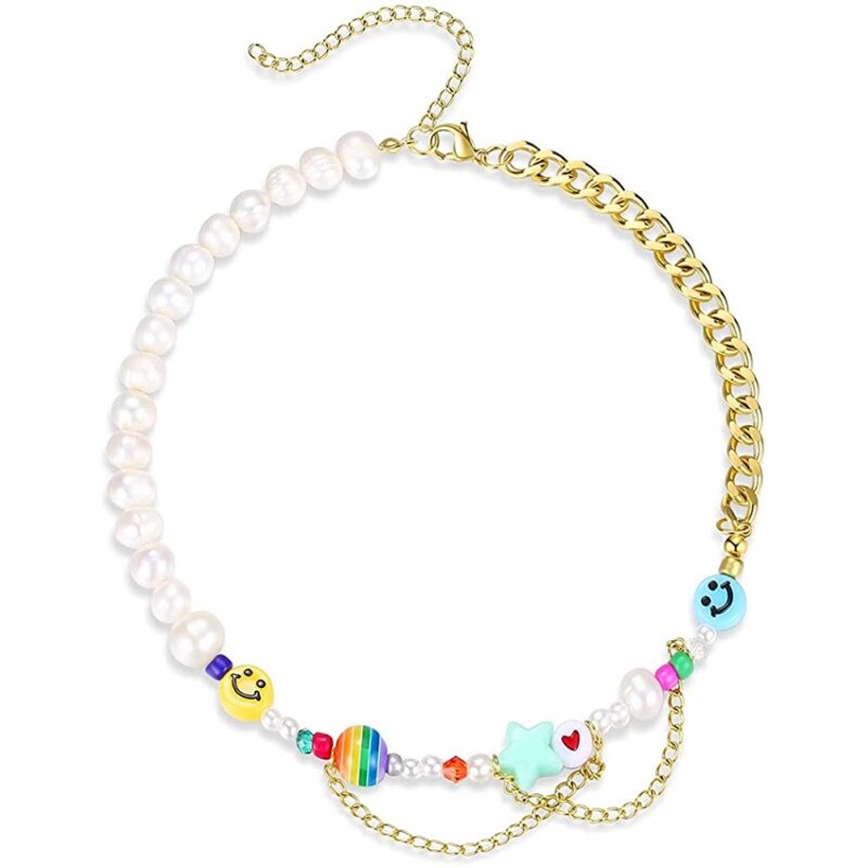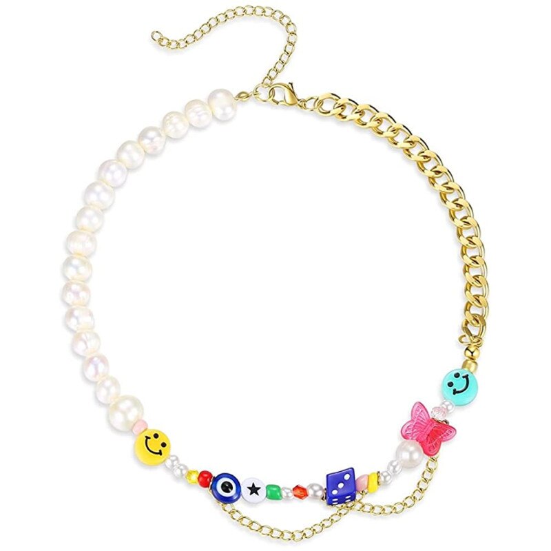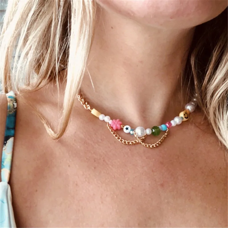 HAPPY GO LUCKY Dupe Inspired Remake Necklace Trendy Summer BOHO Style Faux Pearl Mismatched Chain Choker Colorful Beaded
