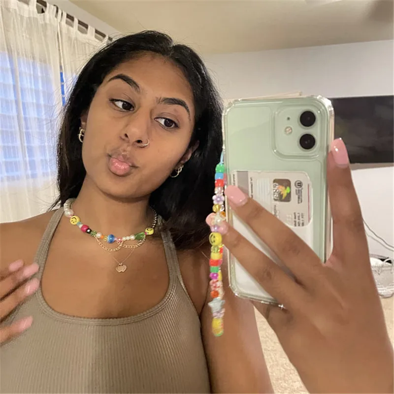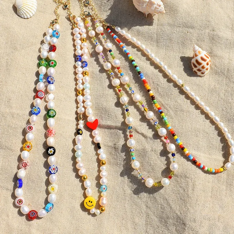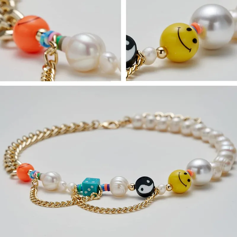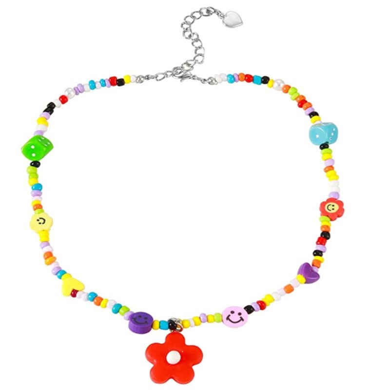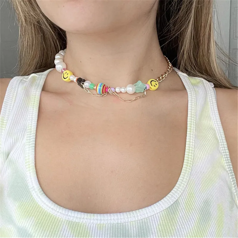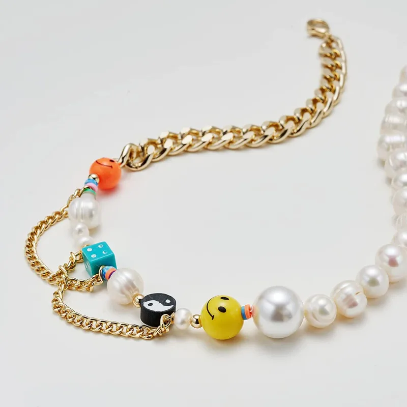 HAPPY GO LUCKY Dupe Inspired Remake Necklace Trendy Summer BOHO Style Faux Pearl Mismatched Chain Choker Colorful Beaded