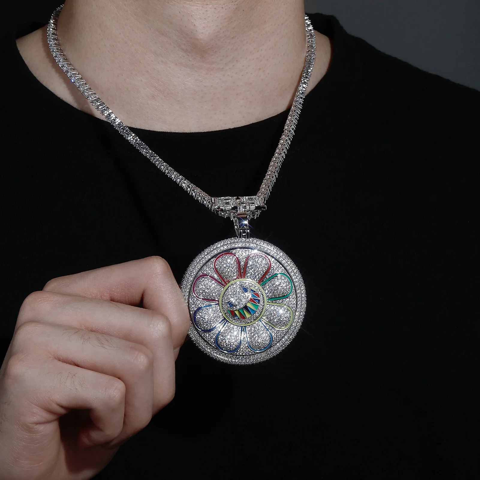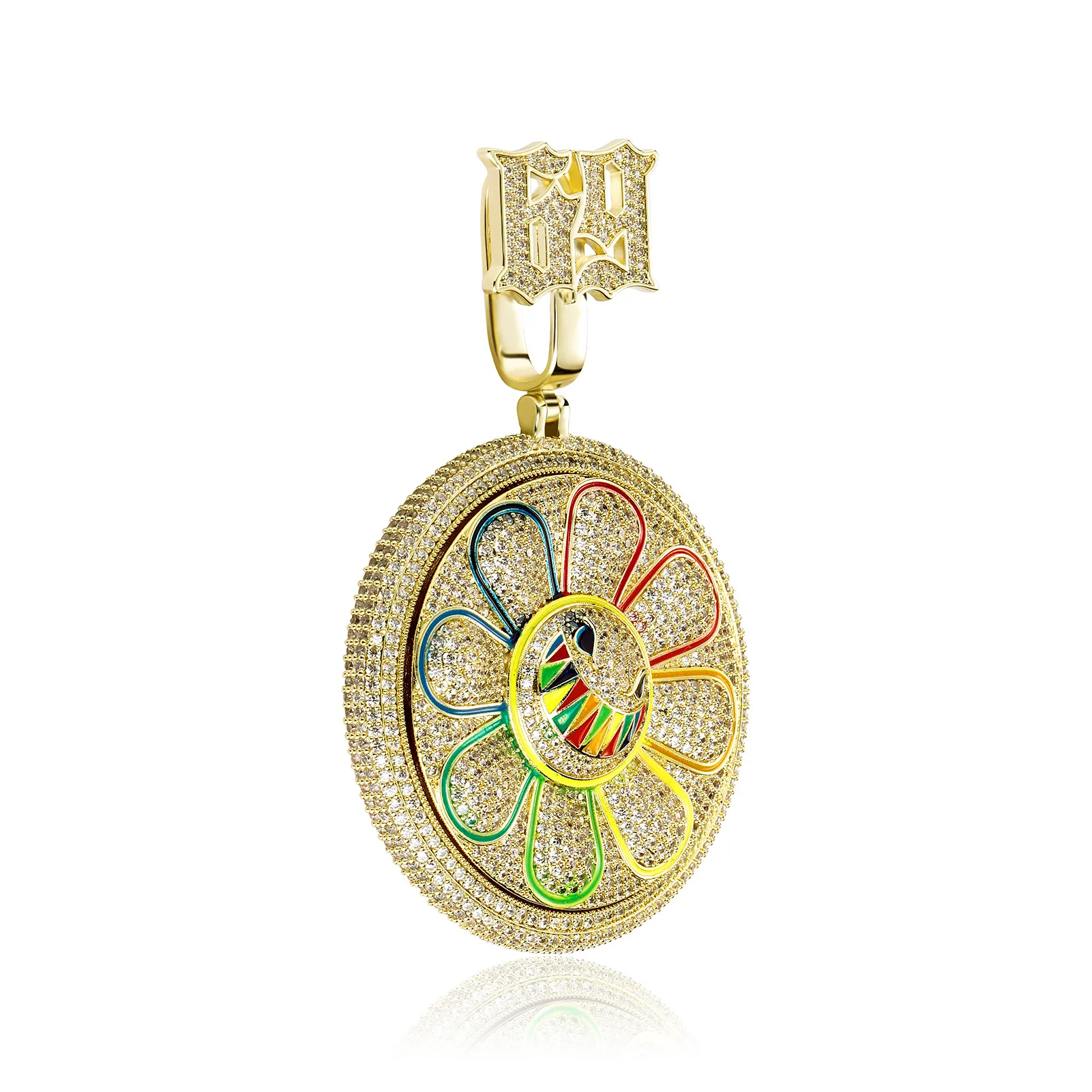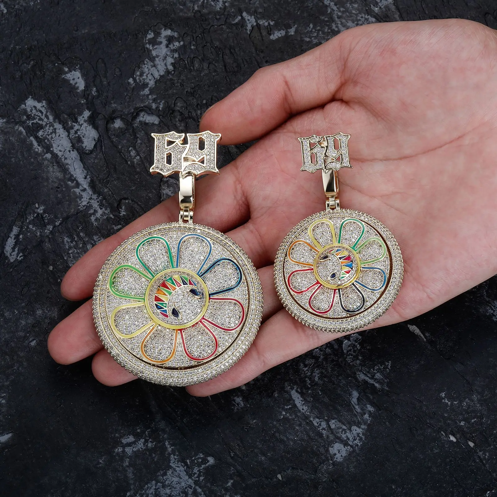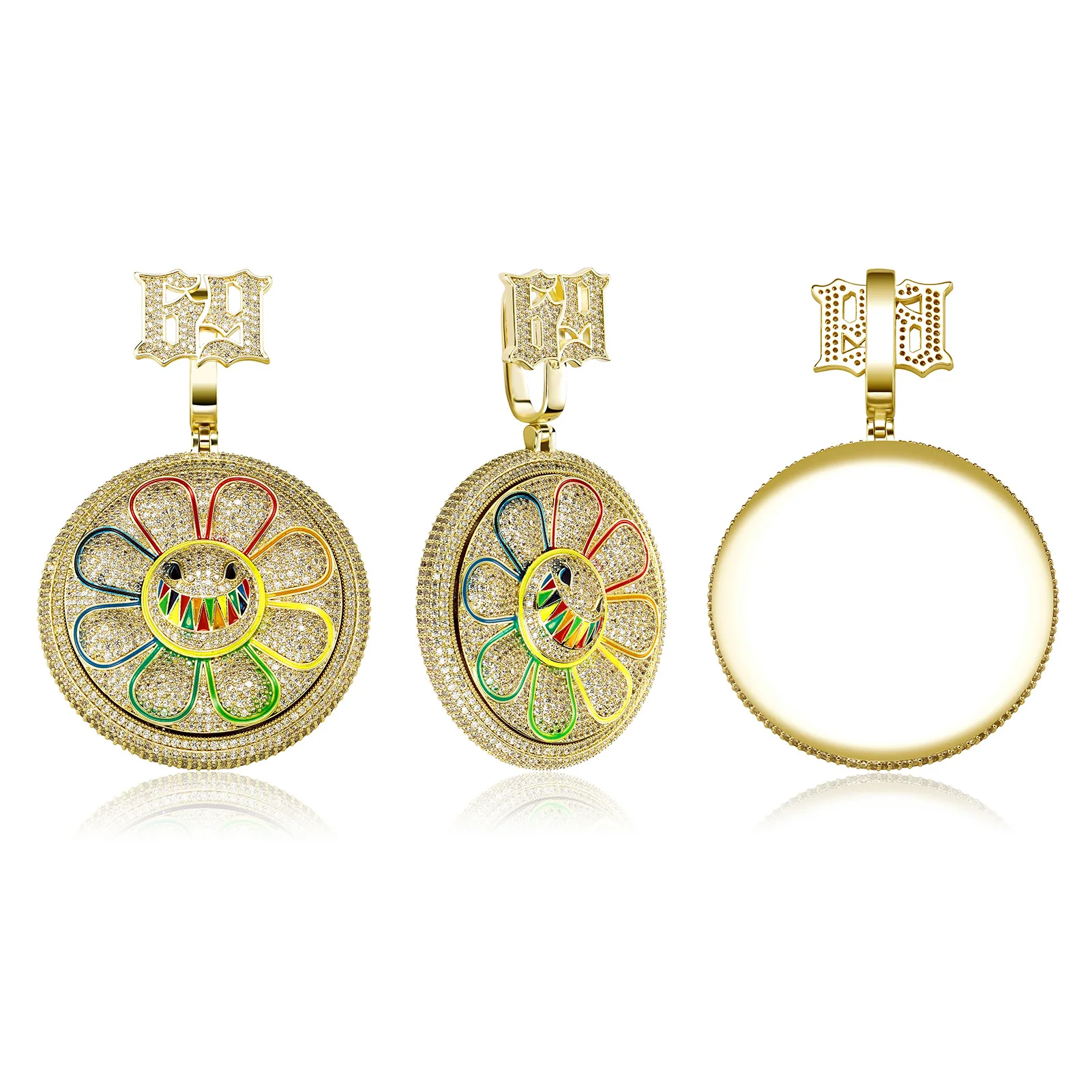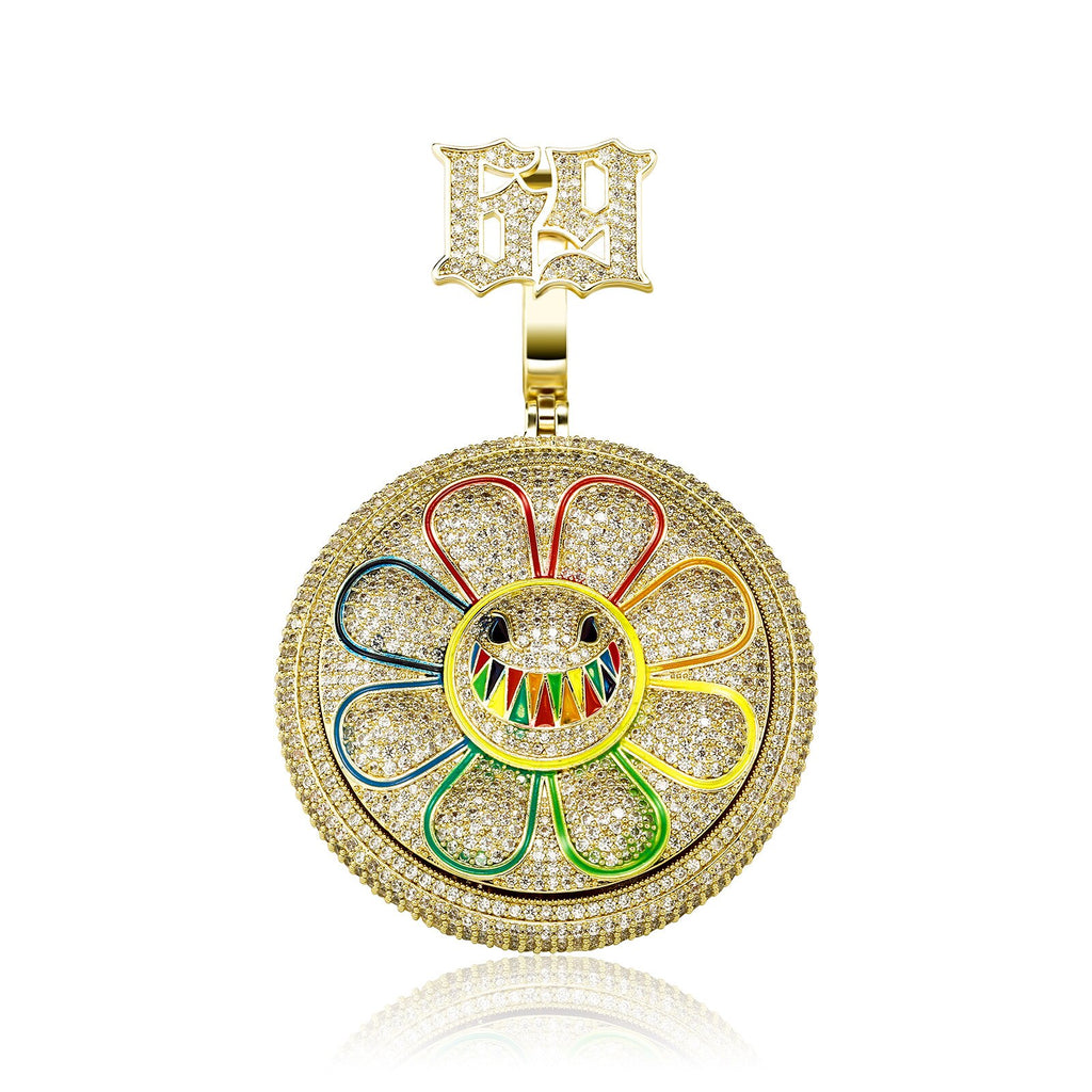 Hip Hop AAA+ CZ Stone Paved Bling Iced Out Rotatable Spin 69 Sun Flower Round Pendants Necklaces for Men Rapper Jewelry Gift