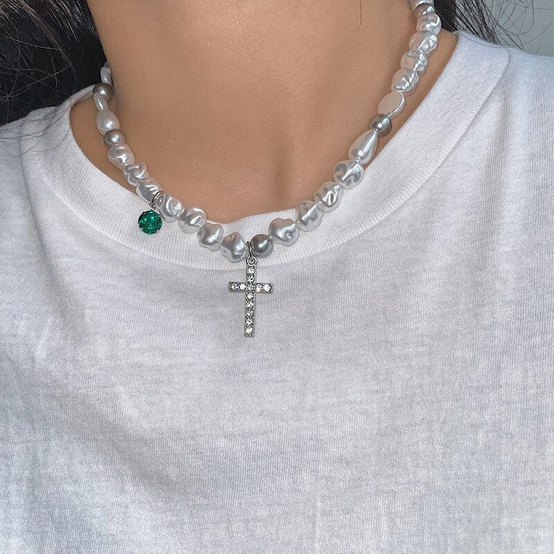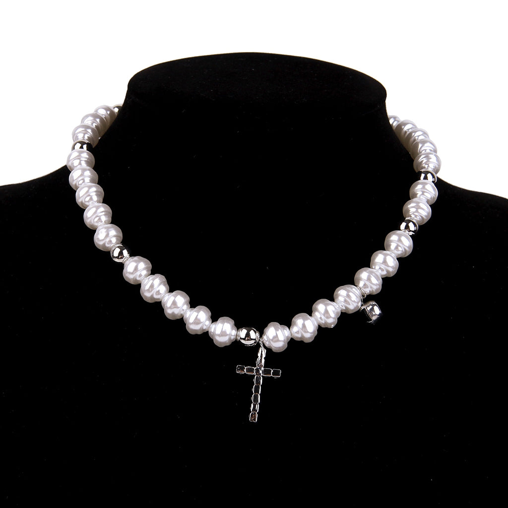Hip Hop Bohemia Imitation Irregular Pearls Crystal Cross Chokers Chain Metal Beads Line Chain Necklace for Women Men Jewelry