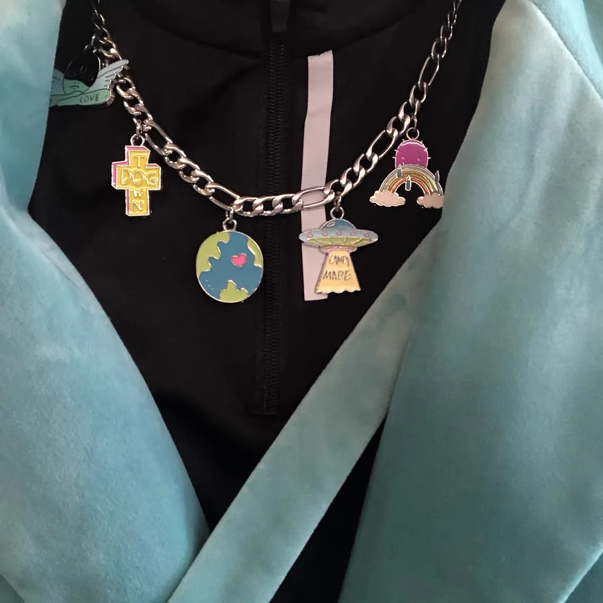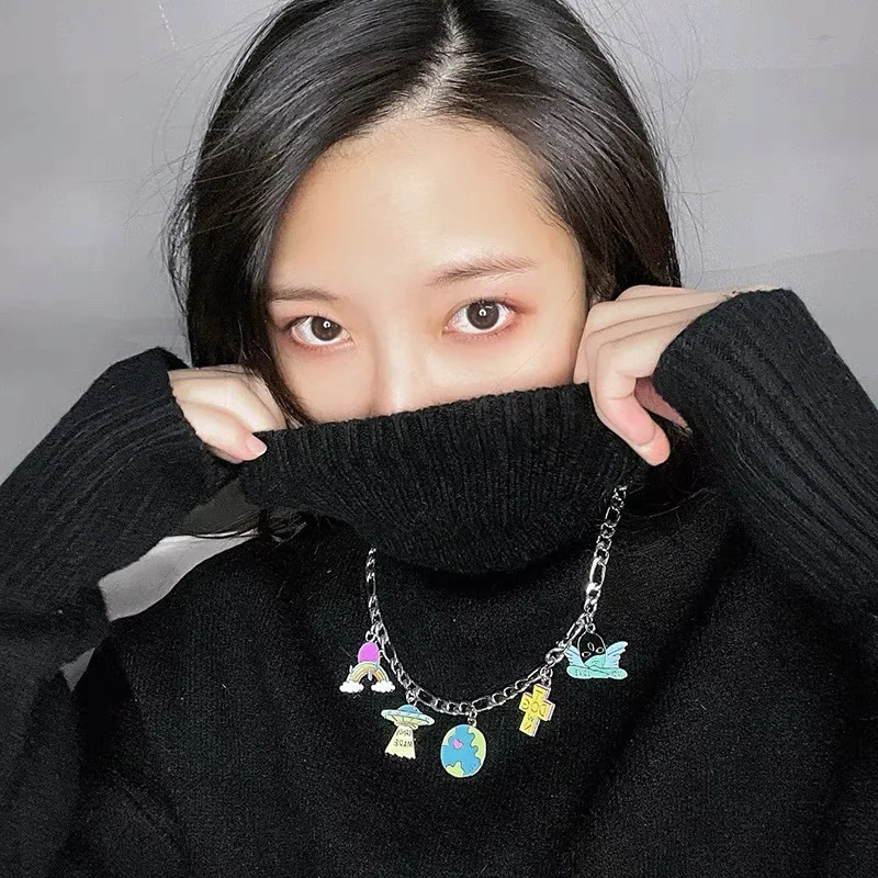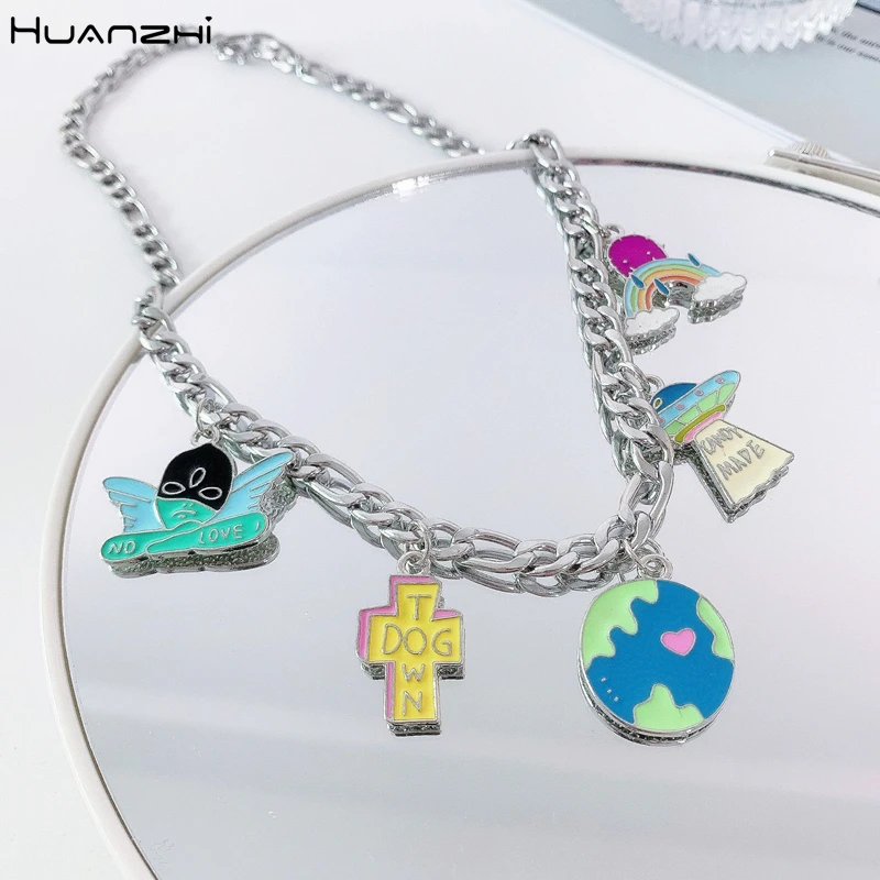 HUANZHI 2021 Colorful Dripping Oil Cartoon Rainbow Earth Cross UFO Angel Pendant Necklace for Women Girls Party Jewelry Gift