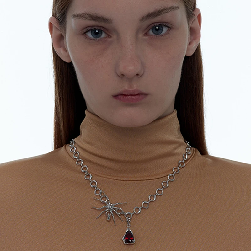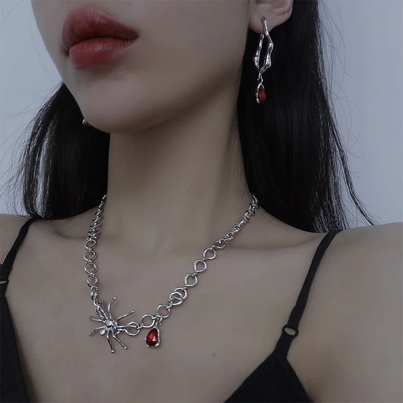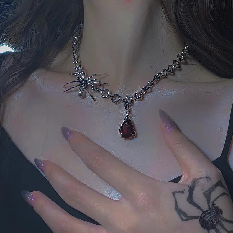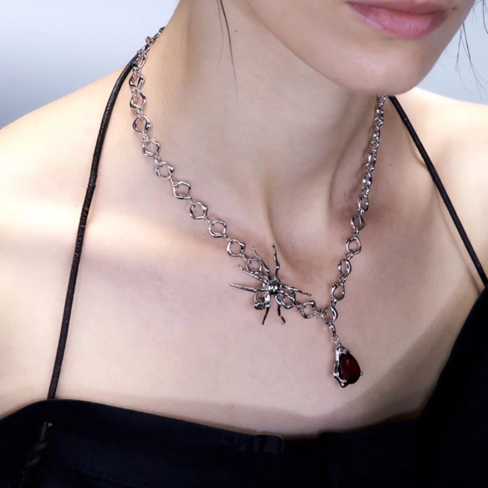 HUANZHI 2021 Punk Hip Hop Red Rhinestone Pendants Spider Metal Geometric Unisex Couple Insect Necklace for Women Men Party