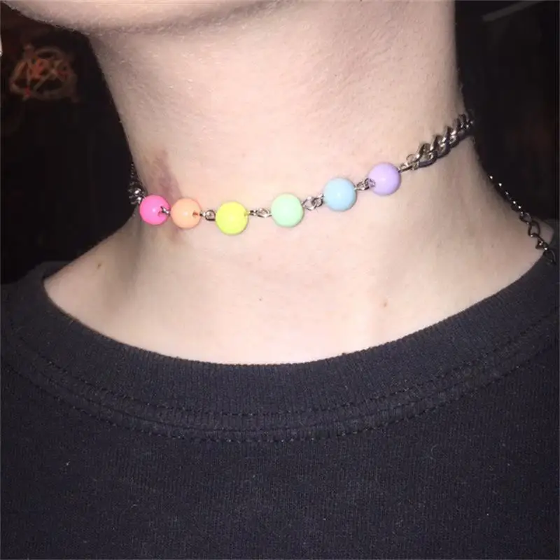 HUANZHI 2021 Trendy Color Beads Heart Pendant Metal Dinosaur Couple Choker Necklace Hip-Hop Style for Ladies Girls Party Jewelry