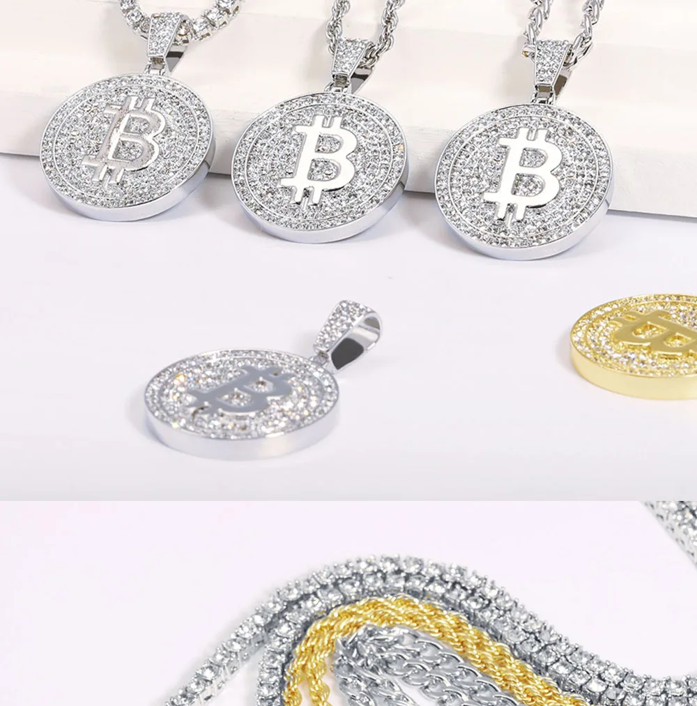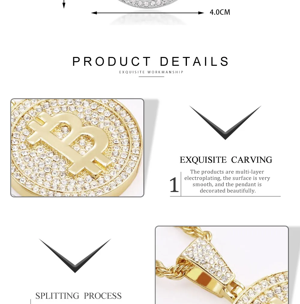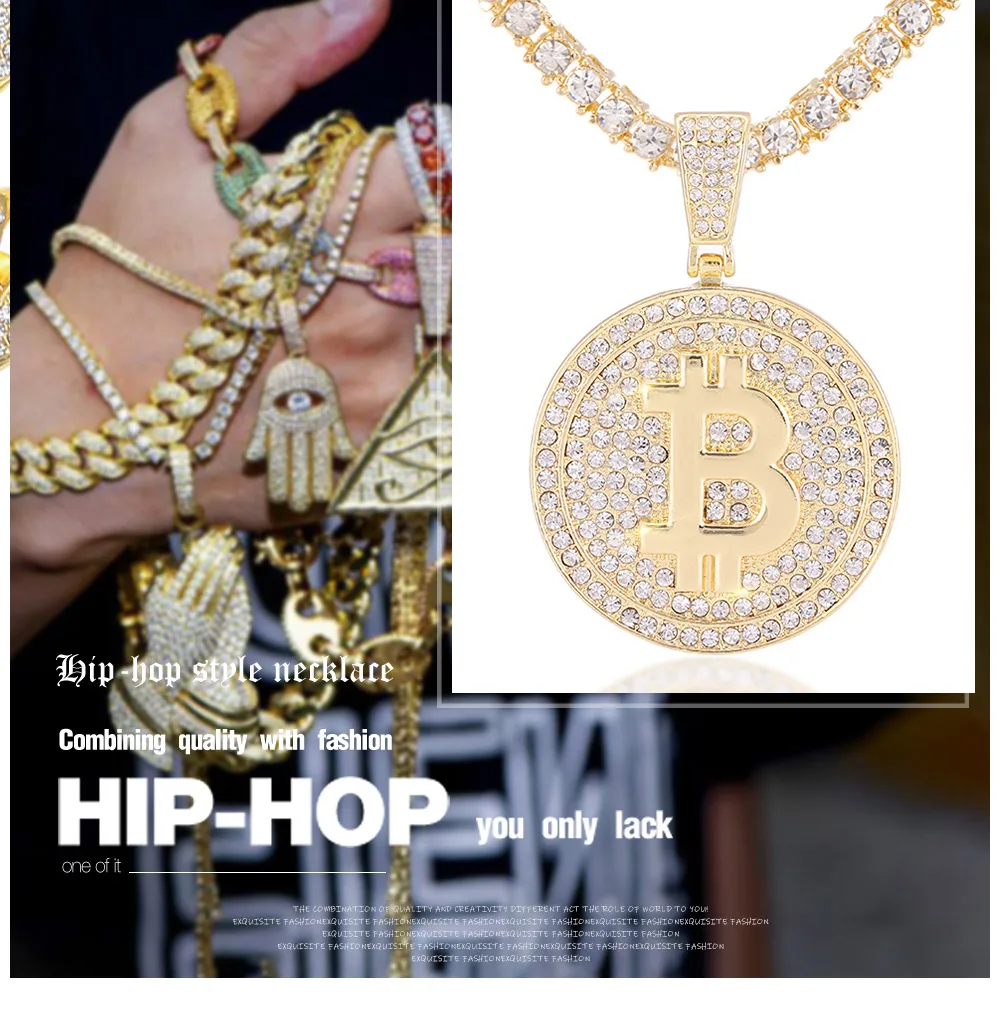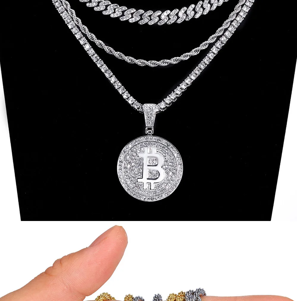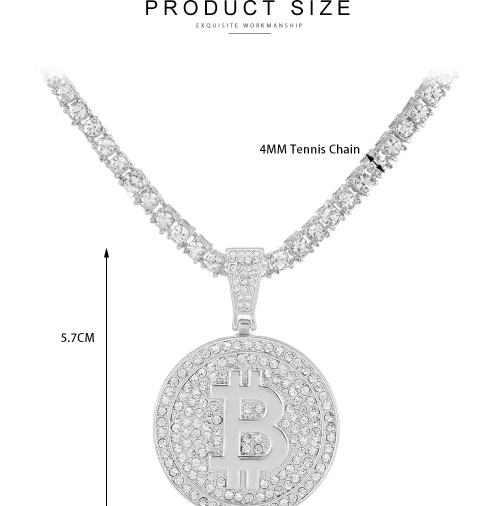 Iced Out Bitcoin Pendant Necklace With 4mm Tennis Chain Iced Out Bling Chain Necklace For Men Rhinestone Cuban Link Chain