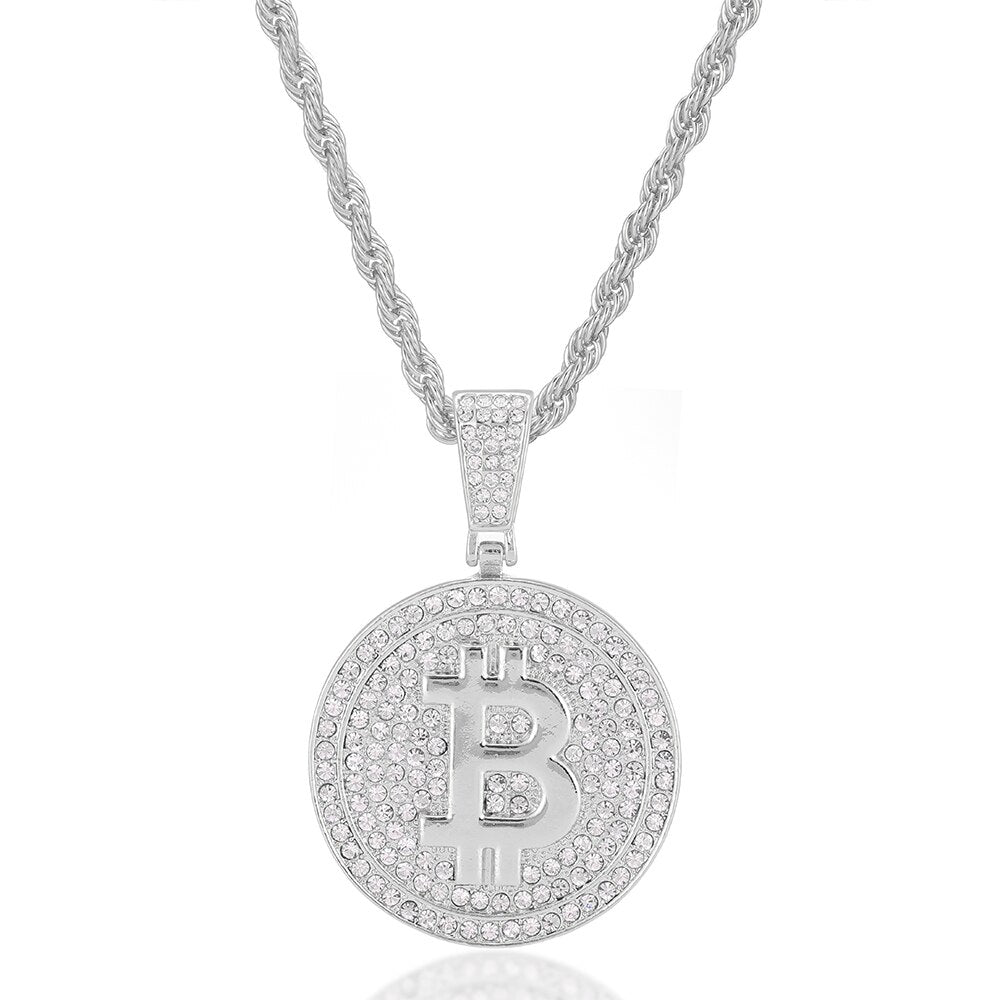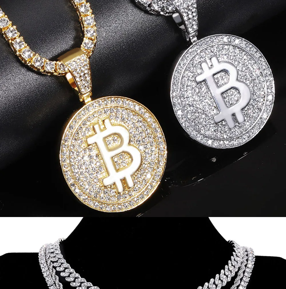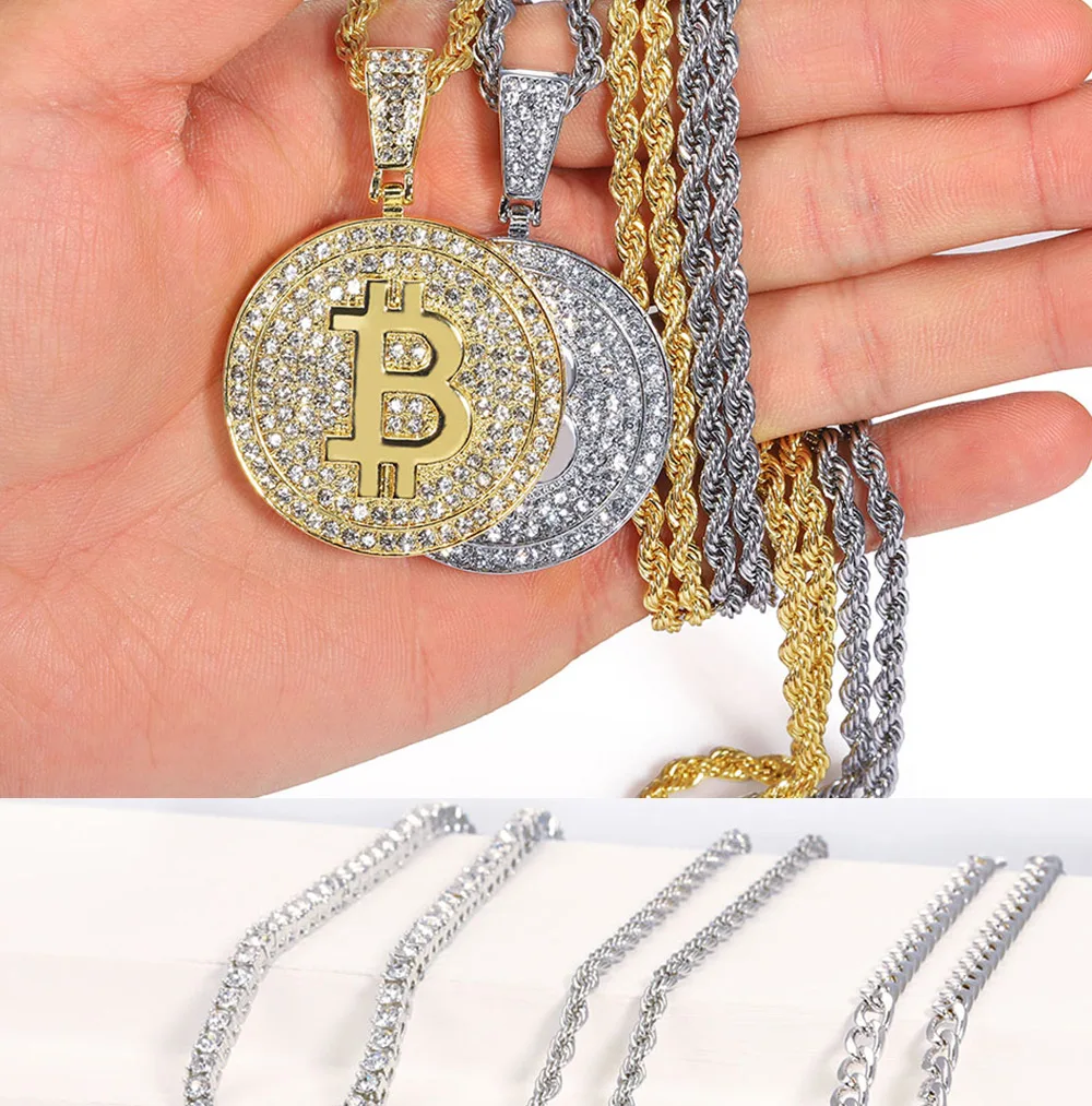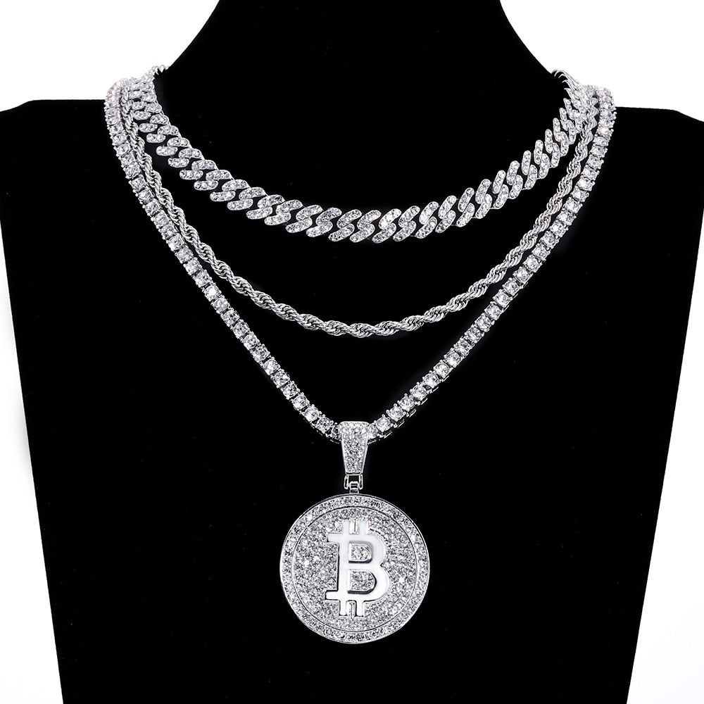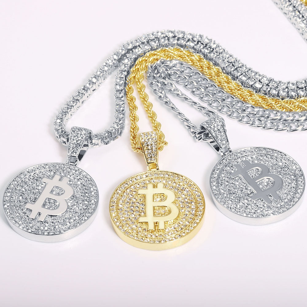Iced Out Bitcoin Pendant Necklace With 4mm Tennis Chain Iced Out Bling Chain Necklace For Men Rhinestone Cuban Link Chain