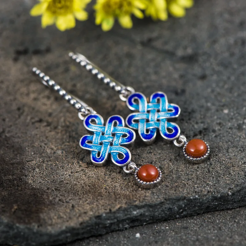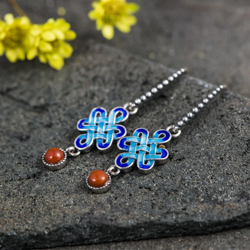 Chiness Knot Design Drop Earrings 925 Sterling Silver Statement Ear Hook with Gemstone Pendant for Women Fine Jewelry