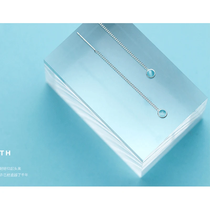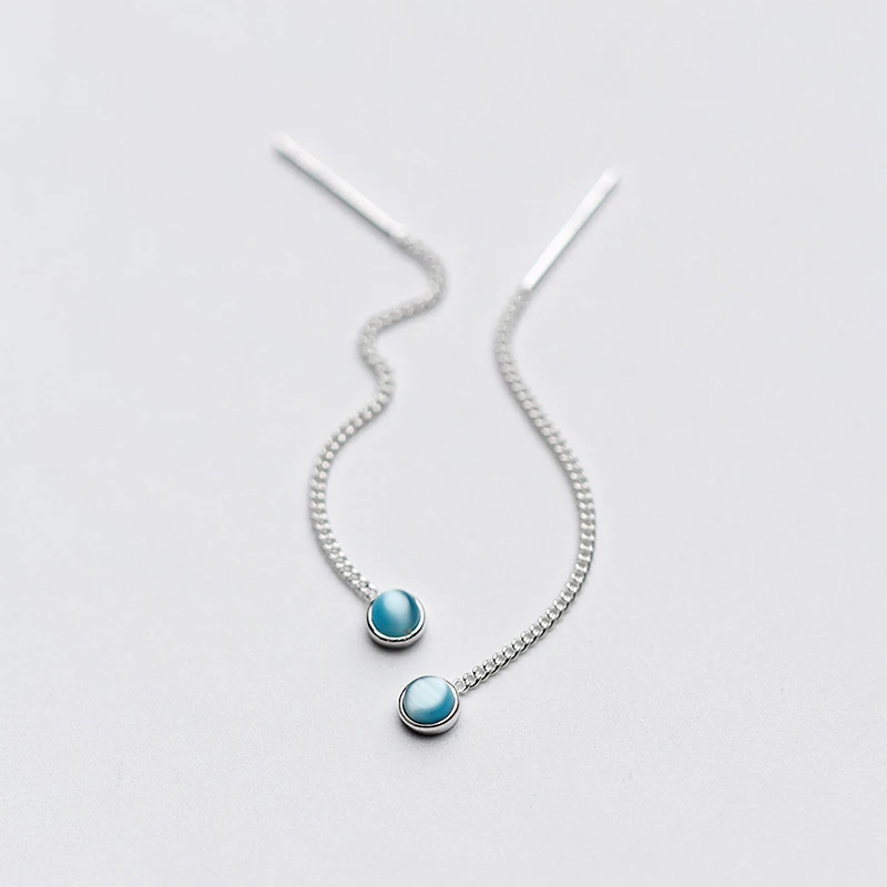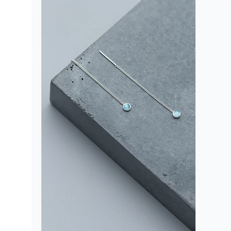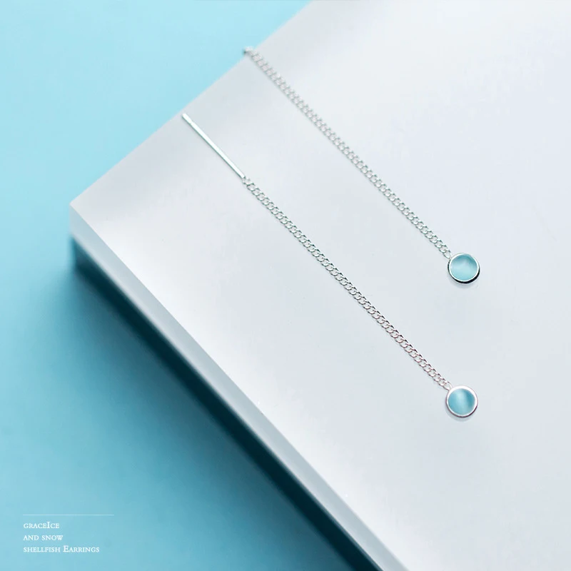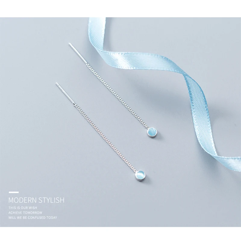 New Elegant Long Ear Line S925 Sterling Silver Chain with Single Round Light Blue Crystal Pendant Drop Earrings for Girl